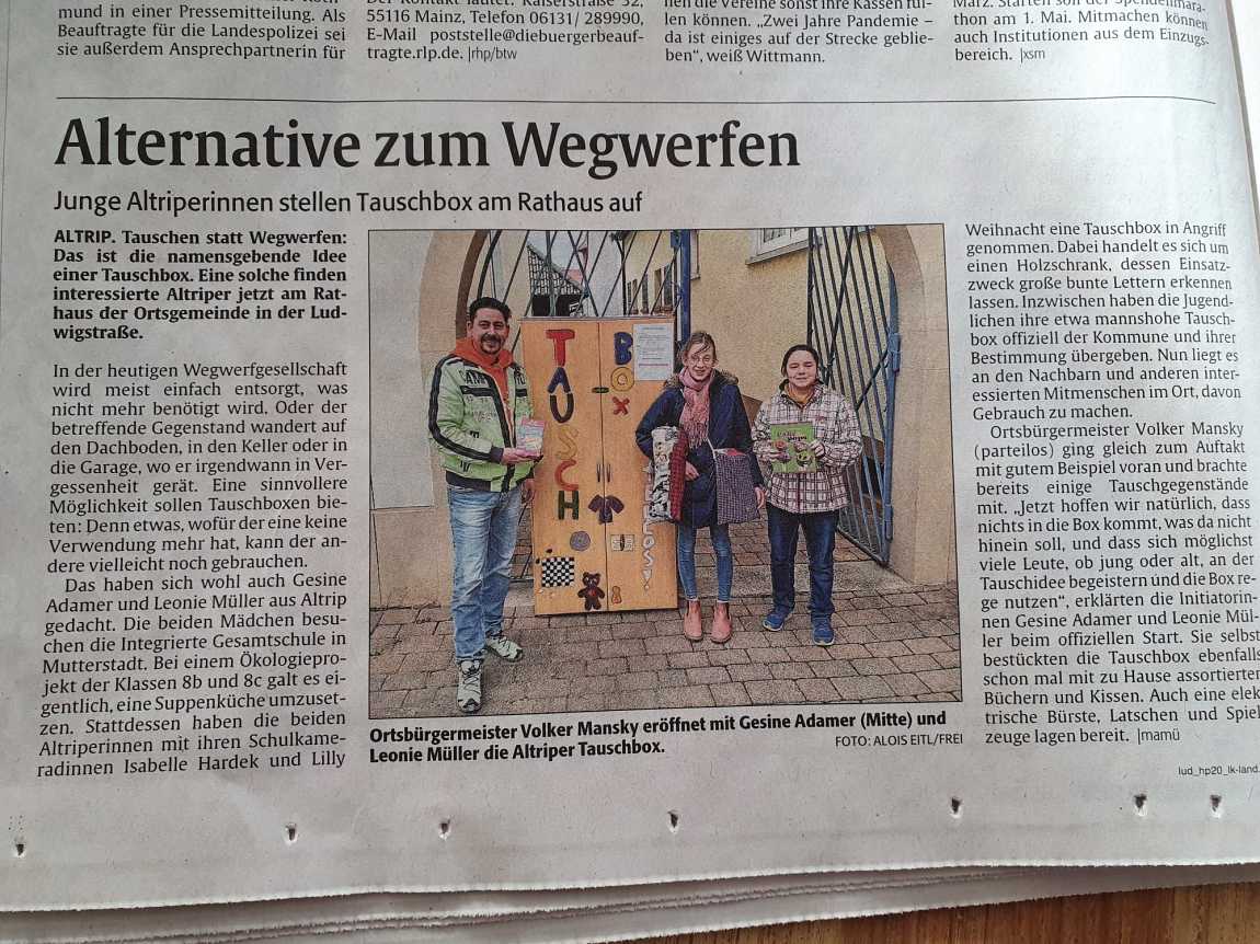 Die Schülerinnen Gesine Adamer und Leonie Müller aus dem WPF Öko8 haben mit ihren beiden Schulfreundinnen Isabelle Hardek und Lilly Weihnacht beim Bundesumweltwettbewerb mit der Idee eine Tauschbox in Altrip aufzustellen mit gemacht.