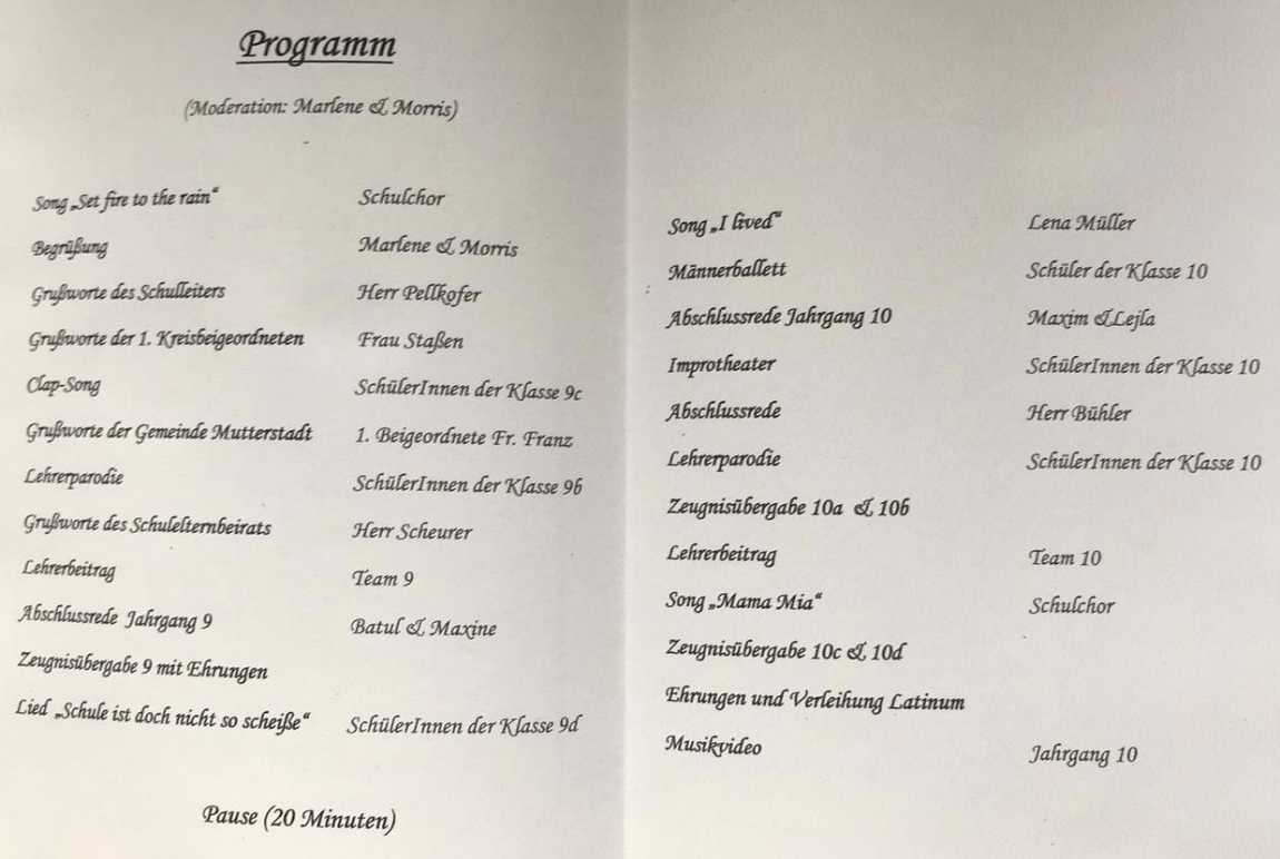 Durch dieses haben Marlene und Morris souverän geführt. Immer wieder begleitet vom Schulchor unter der Leitung von Stefan Franz. Die Grußworte kamen von unserem Schulleiter Hr. Pellkofer, der 1. Kreisbeigeordneten Frau Straßer, der 1. Beigeordneten der Gemeinde Mutterstadt Frau Franz und von Herrn Scheurer unserem Schulelternbeiratsvorsitzendem.