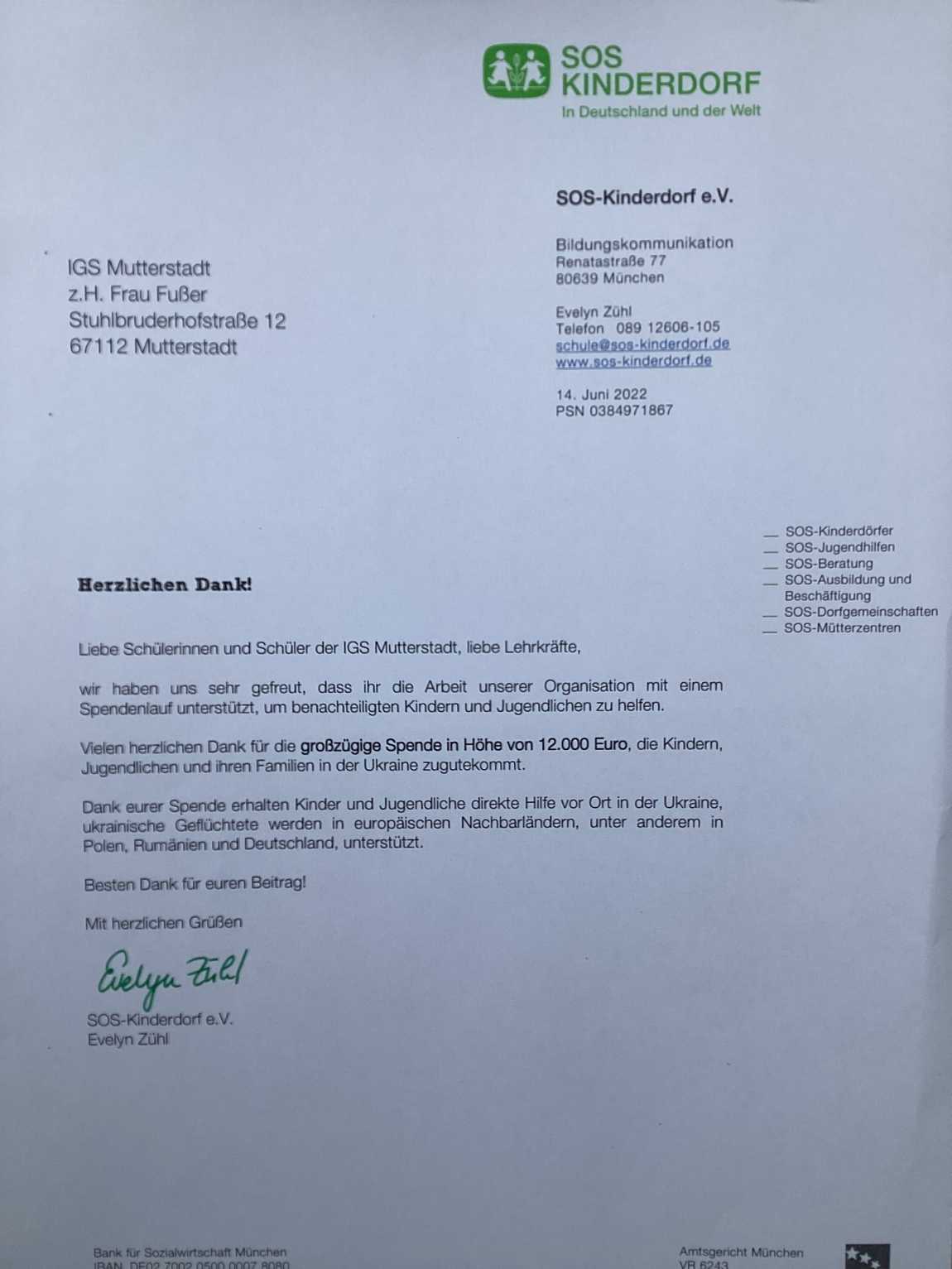 Neben dem Spendenlauf sind wir glücklich, dass wir Ivanna Steblink als ukrainische Kollegin bei uns aufnehmen konnten, die sich seit sie im Februar zu uns gekommen ist intensiv um unsere sieben ukrainischen Schüler*innen kümmert! Mit ihren vielfältigen Sprachkenntnissen, die über deutsch, englisch, polnisch, ukrainisch und russisch hinausreichen ist sie uns eine große Unterstützung!