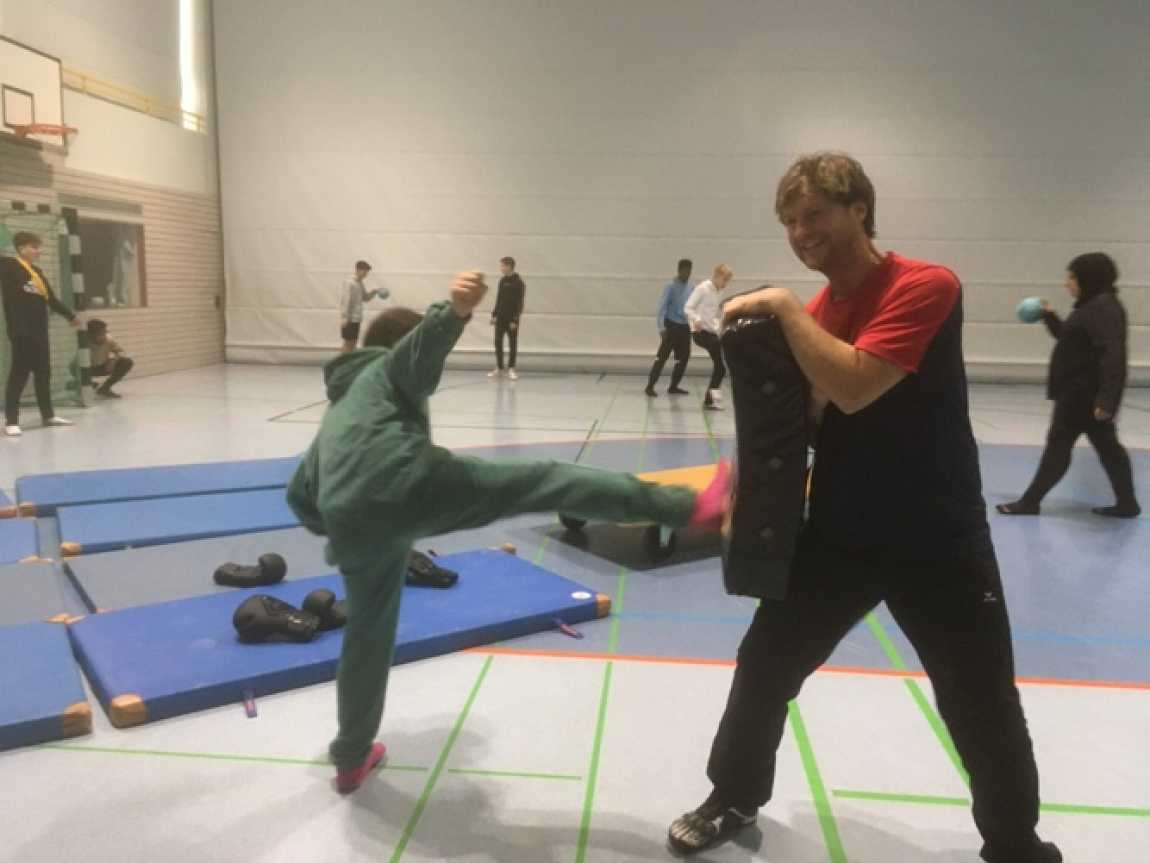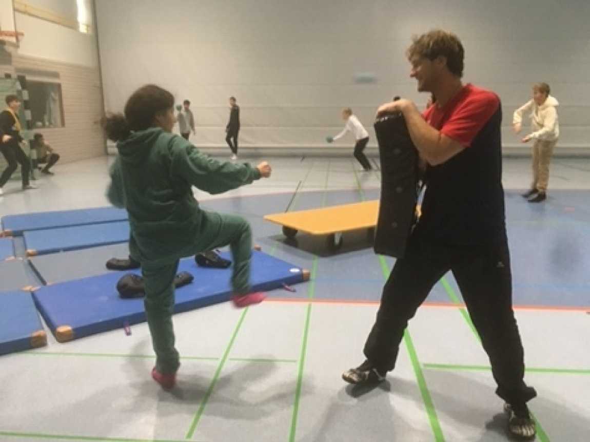 Ein wenig ernster ging es in den körperlichen Auseinandersetzungen mit Boxhandschuhen, Pratzen und Schienbeinschonern zu. Hier kamen einige der Jungen und Mädchen an emotionale Grenzen und lernten einiges über sich selbst, Fairness im (Kampf-) Sport und Erforderlichkeiten in der Begegnung miteinander.