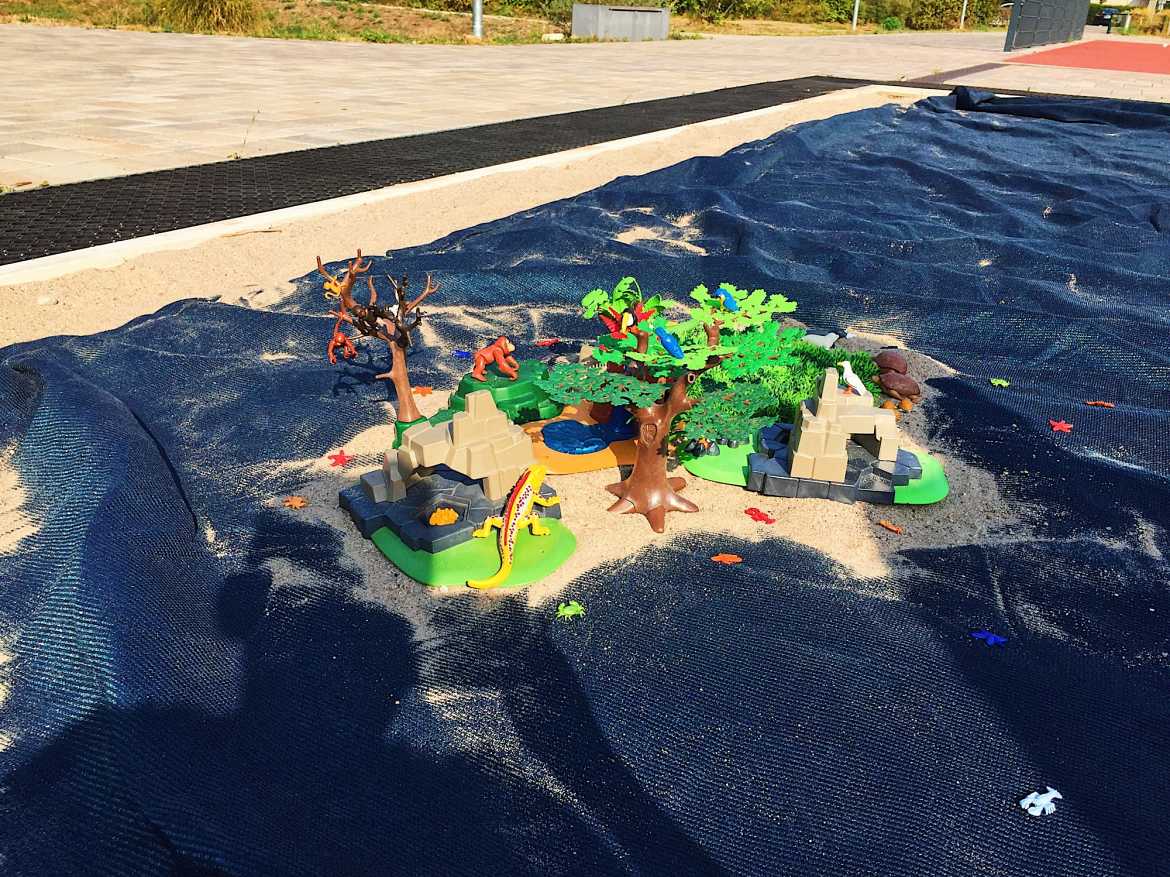 Eine Insel wird mit Sand und Lego Schiffe gebaut.