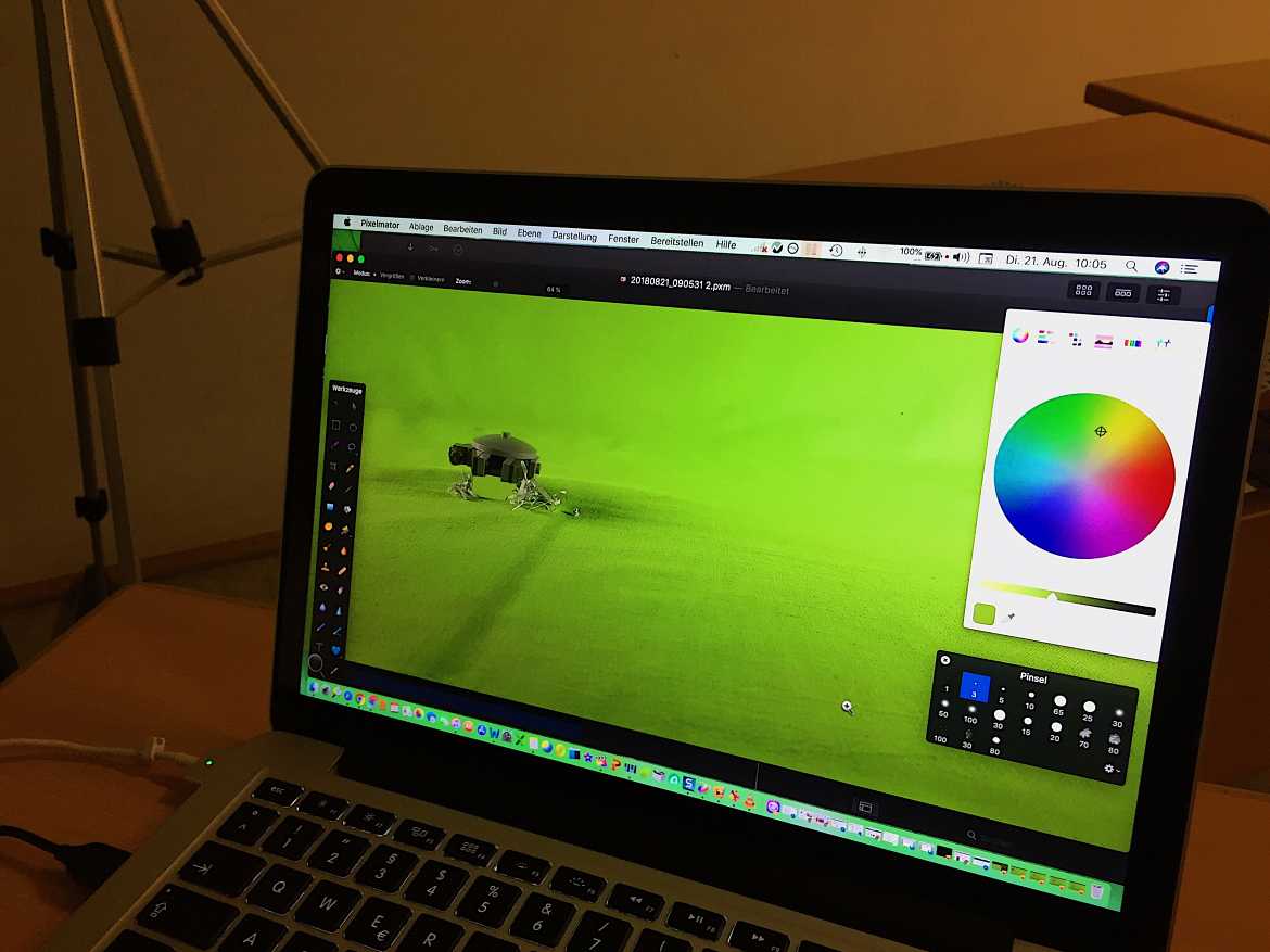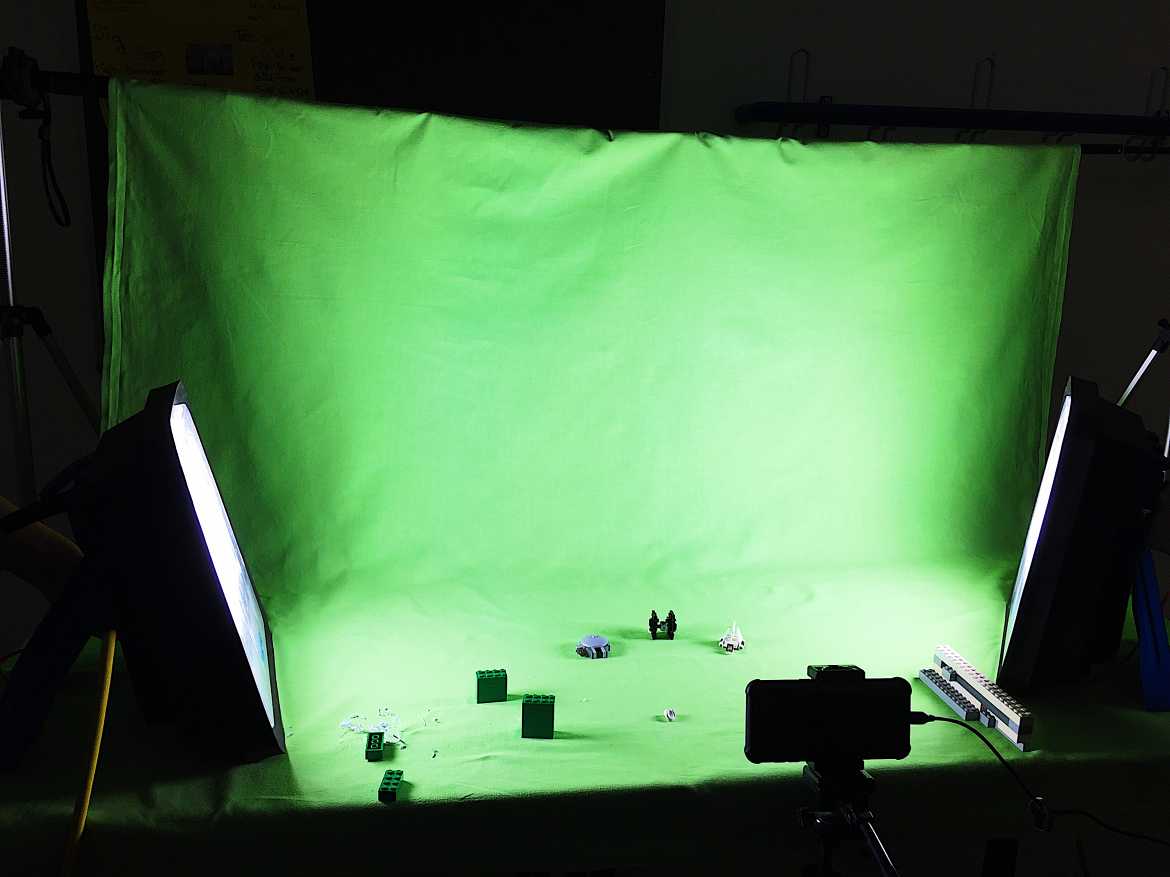 Durch den Greenscreen kann man einen anderen Hintergrund einfügen.
