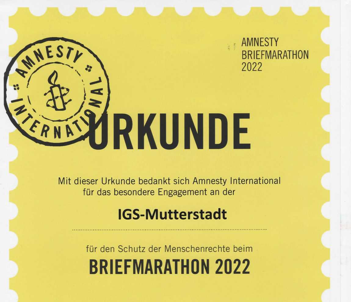 Der Religions-GK 12 hat im Dezember 2022 beim Briefmarathon von amnesty international mitgemacht. Nun haben wir eine Urkunde von amnesty bekommen für das „besondere Engagement“, denn wir lagen unter den 600 beteiligten Schulen zahlenmäßig ganz gut im Rennen.