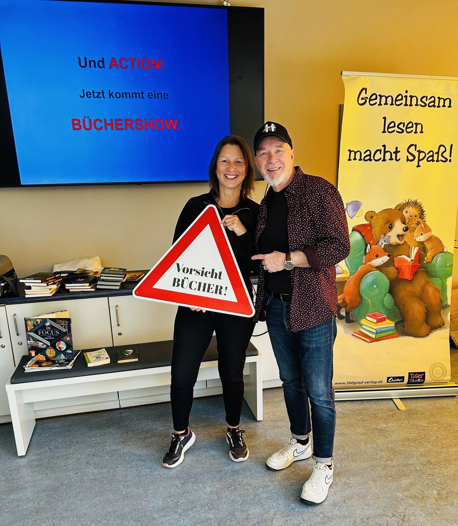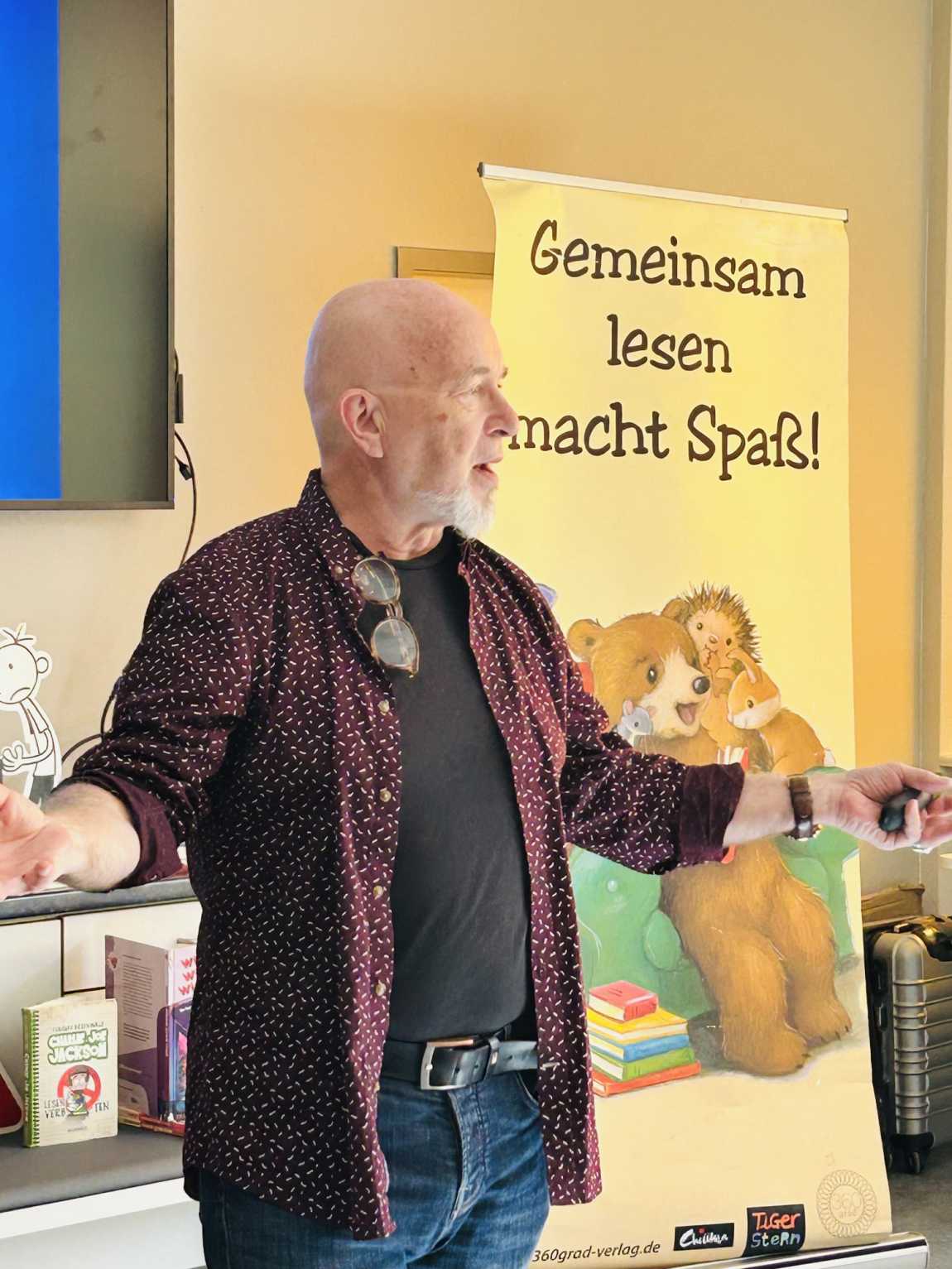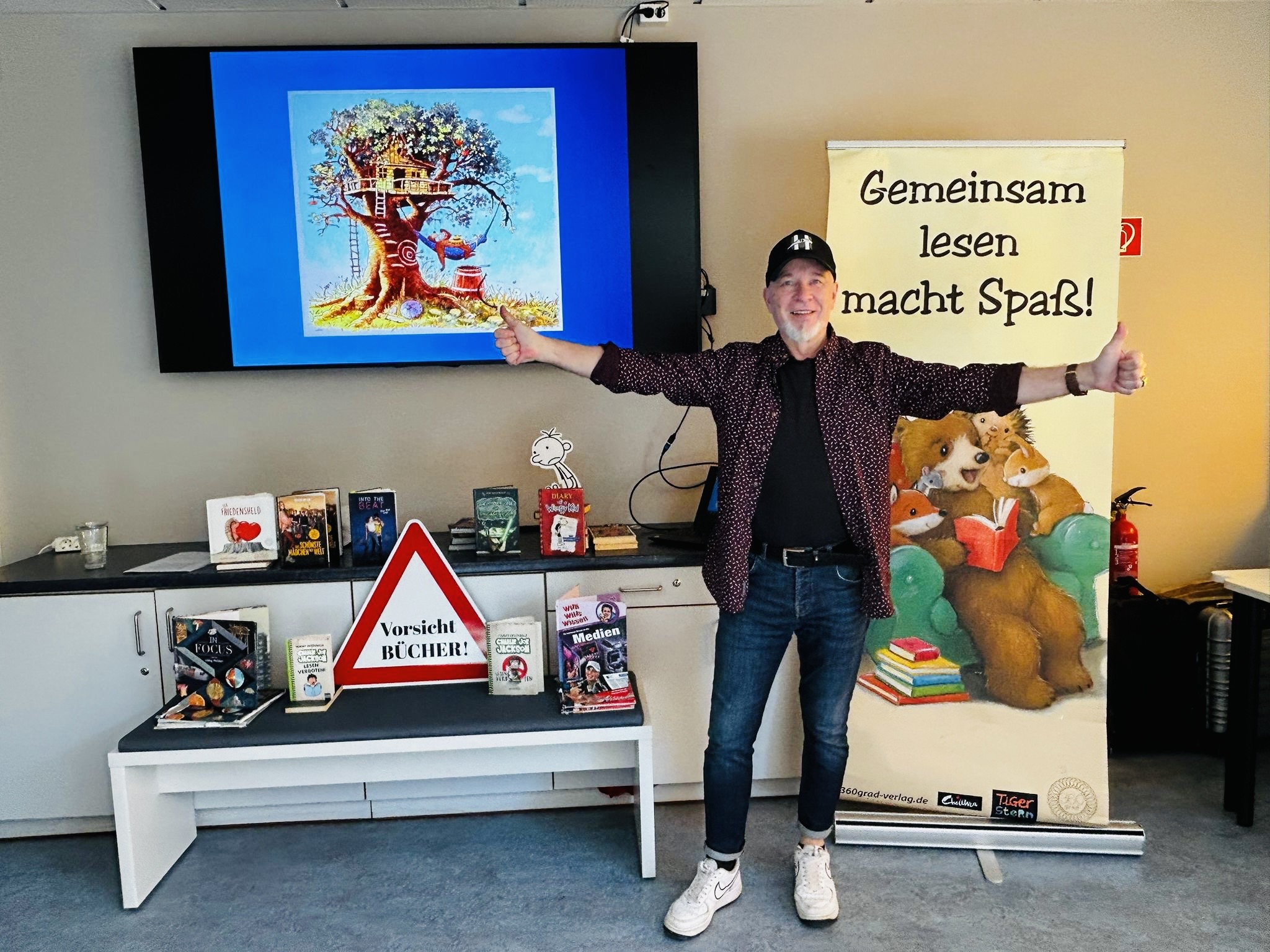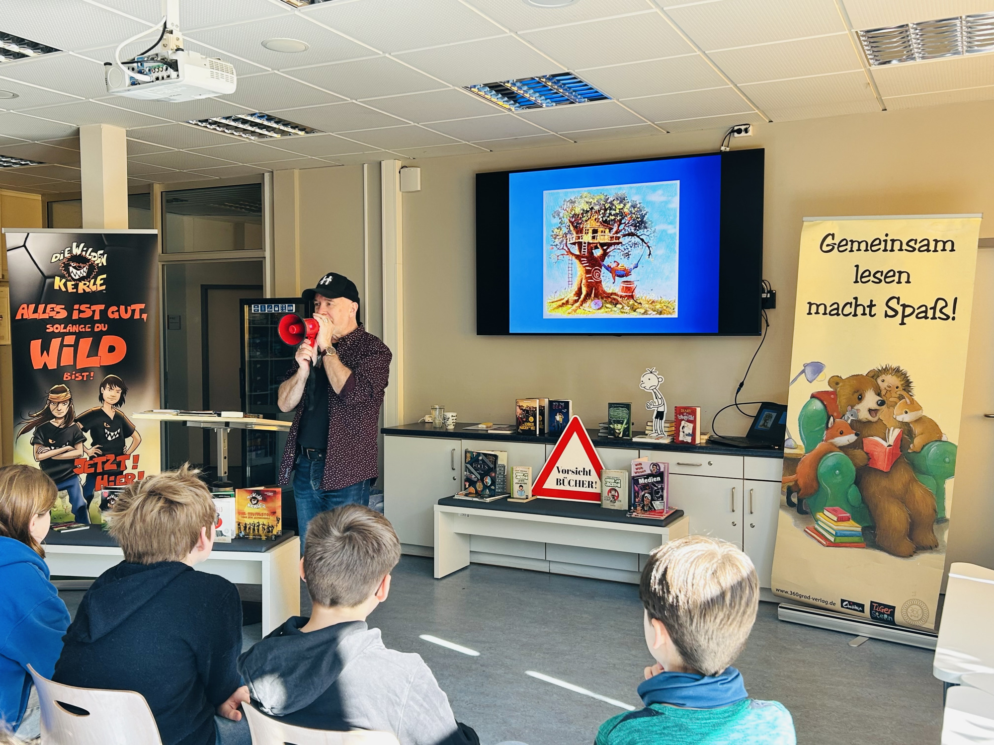 In seiner abwechslungsreichen Lesung stellte er bekannte Bücher und Reihen vor, an denen er mitgewirkt hat, zum Beispiel Gregs Tagebuch, Die wilden Fußballkerle, Lauras Stern und Willi wills wissen.