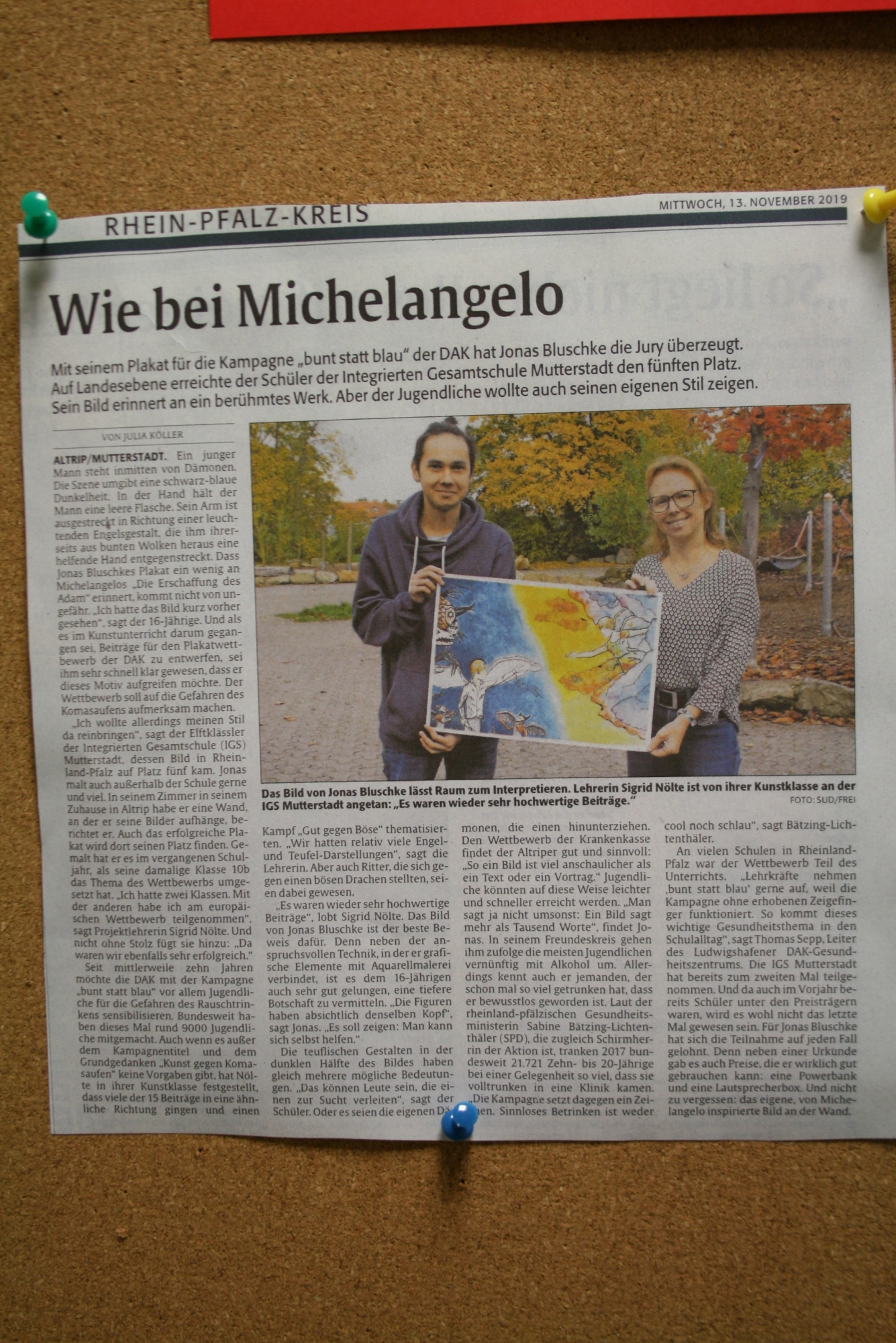 bunt statt blau: Schüler aus Mutterstadt belegt 5. Platzbeim Plakatwettbewerb 2019 gegen Komasaufen inRheinland-PfalzAuszeichnung durch Landesschirmherrin Frau Sabine Bätzing-Lichtenthäler rheinlandpfälzische Sozialministerin – DAK-Kampagne gegen das Rauschtrinken im Jubiläumsjahr mitbundesweit fast 9.000 jungen TeilnehmernMutterstadt, 15.Oktober 2019. „bunt statt blau“: Unter diesemMotto schufen im Frühjahr bundesweit 9.000 Schülerinnen undSchüler Plakate gegen das sogenannte Komasaufen. DerSchüler Jonas Bluschke von der IGS-Mutterstadt belegte inRheinland-Pfalz den 5. Platz. Die Krankenkasse DAK-Gesundheitin Ludwigshafen ehrte den Gewinner und übergab zusammenmit der Projektlehrerin Frau Sigrid Nölte, Urkunde und Preis. „Komasaufen bei Jugendlichen ist eine gefährliche Tatsache, der wirgemeinsam begegnen müssen“, so die Schirmherrin. 2017 trankenbundesweit 21.721 Zehn- bis Zwanzigjährige bei einer Gelegenheitso viel, dass sie volltrunken in eine Klinik kamen. „Die Kampagnesetzt dagegen ein Zeichen. Sinnloses Betrinken ist weder cool nochschlau. Die Schüler entwickeln Ideen für Anti-Alkohol-Plakate undsetzen sich dabei ganz automatisch mit den negativen Folgen vonAlkohol auseinander.“ Gesundheitsthemen in den Schulalltag An vielen Schulen in Rheinland-Pfalz war die PräventionskampagneTeil des Unterrichts. „Lehrkräfte nehmen ‚bunt statt blau‘ gerne auf,weil die Kampagne ohne erhobenen Zeigefinger funktioniert. Sokommt dieses wichtige Gesundheitsthema in den Schulalltag“, sagtThomas Sepp, Leiter der DAK-Gesundheit in Ludwigshafen.Thomas Sepp, Tel: 0621 658215 6069. E-Mail: thomas.sepp@dak.deInfos auch unter www.dak.de/presse und www.twitter.com/dakgesundheit