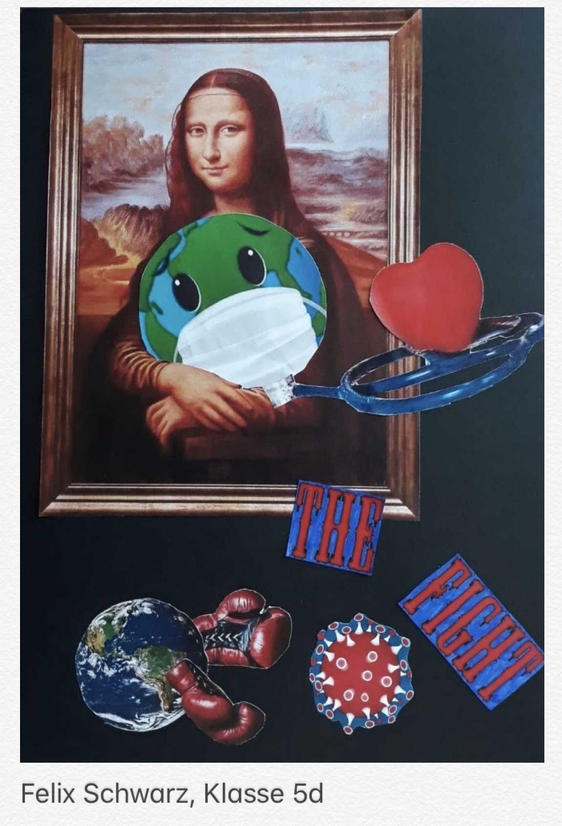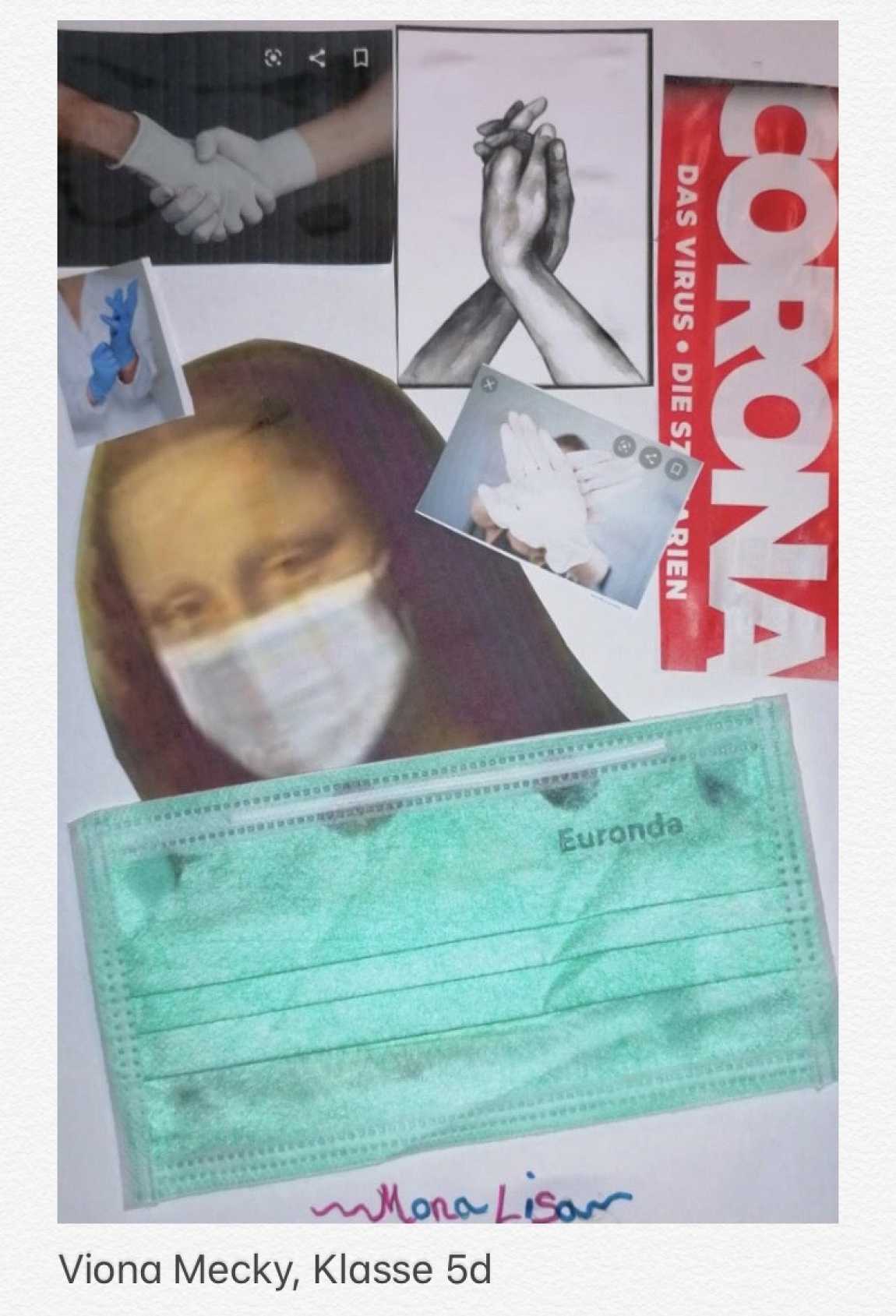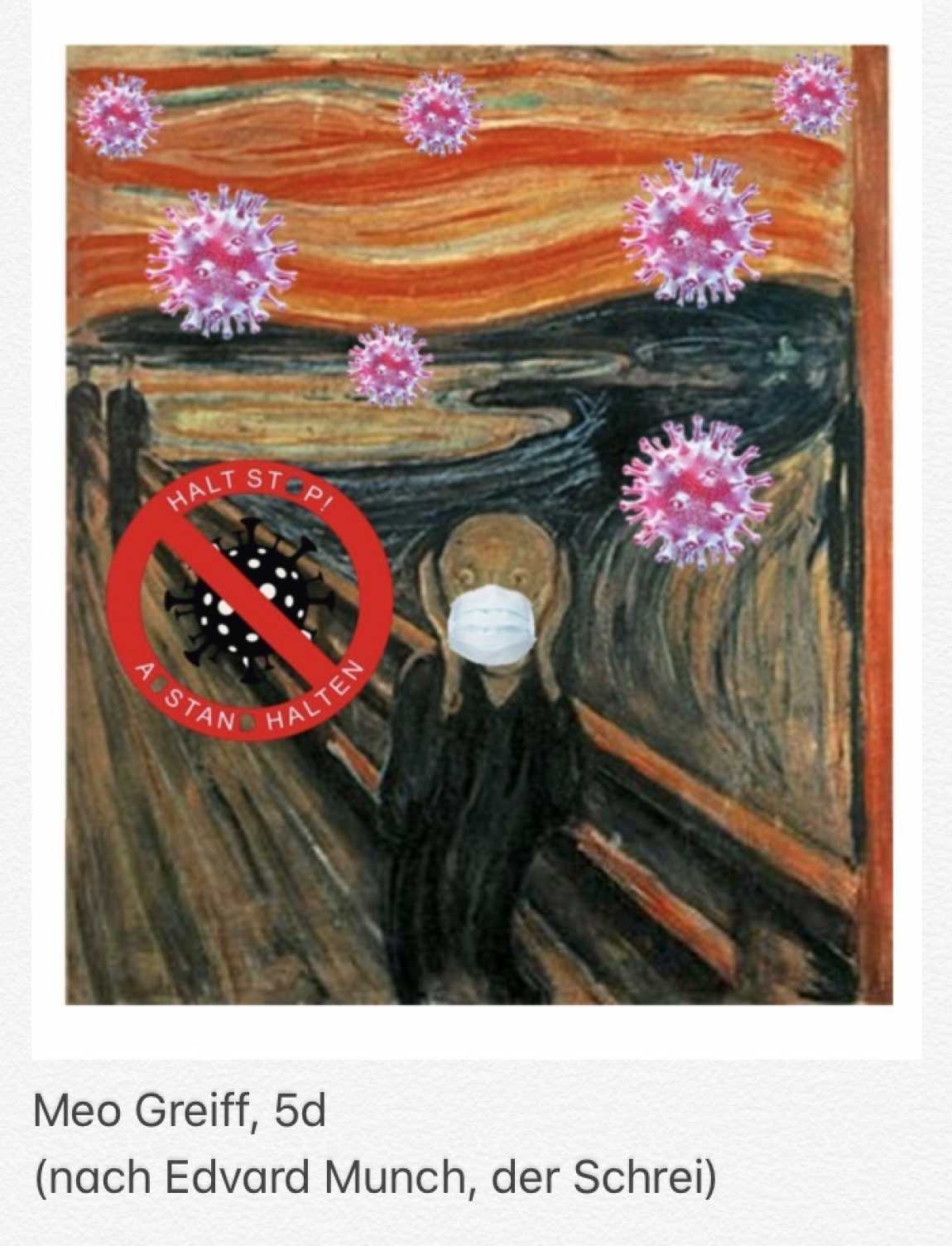 Ausgehend von einer Werbecampagne des Ministeriums für Kultur und Öffentlichkeit der Ukraine haben Schülerinnen und Schüler der Jahrgänge 5-7 das Thema „Kunst und Corona“ bearbeitet. Hierbei wurden kunstgeschichtliche Abbildungen verändert, oder ganz eigene Ideen entwickelt. So entstand beispielsweise eine « Corona Lisa » – warum auch nicht? Erfreulicherweise setzten sich Schülerinnen und Schüler von zu Hause aus teilweise auch mit Grafikprogrammen auseinander. Es entstanden Ergebnisse, die wir der Öffentlichkeit nicht vorenthalten möchten!