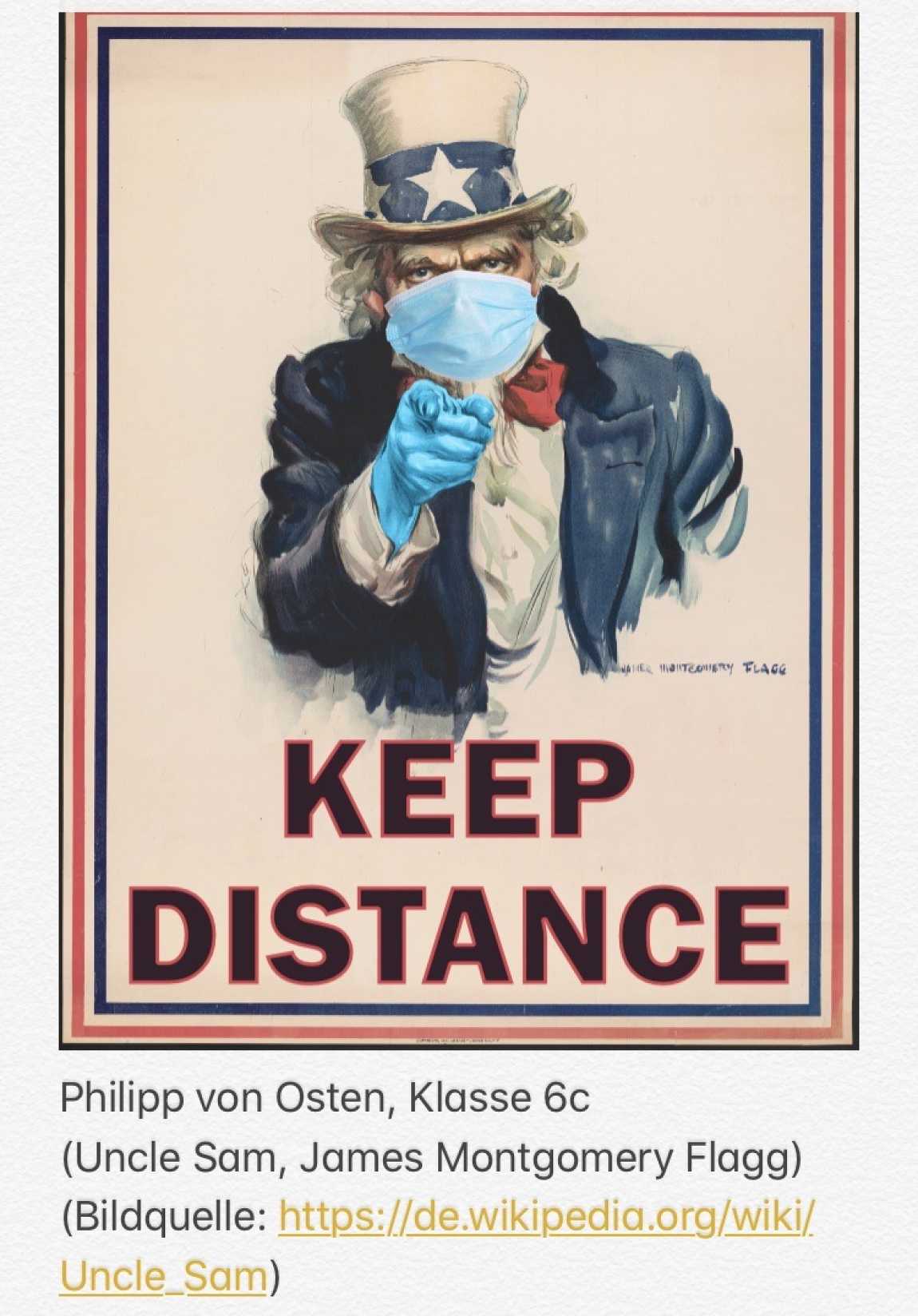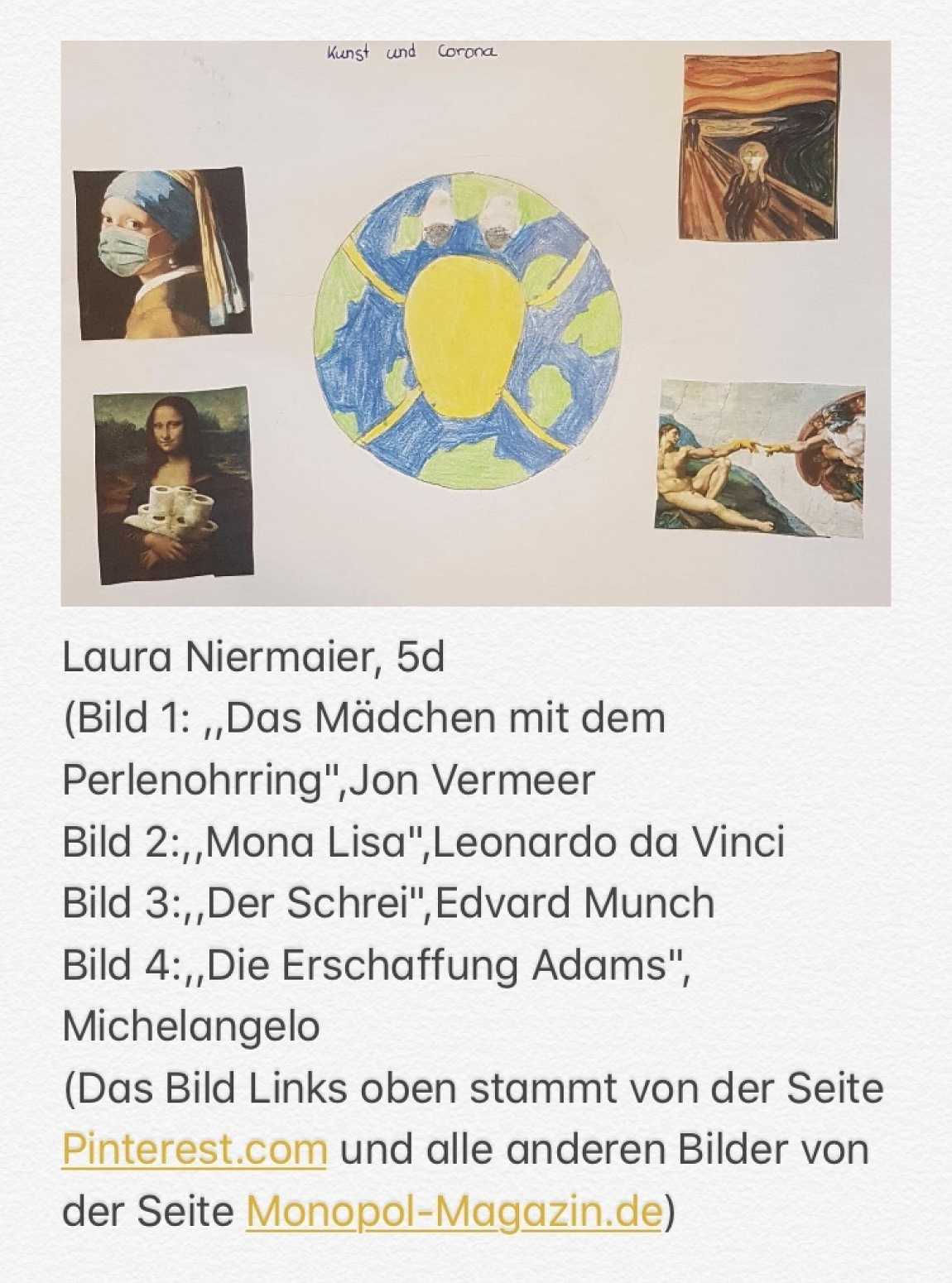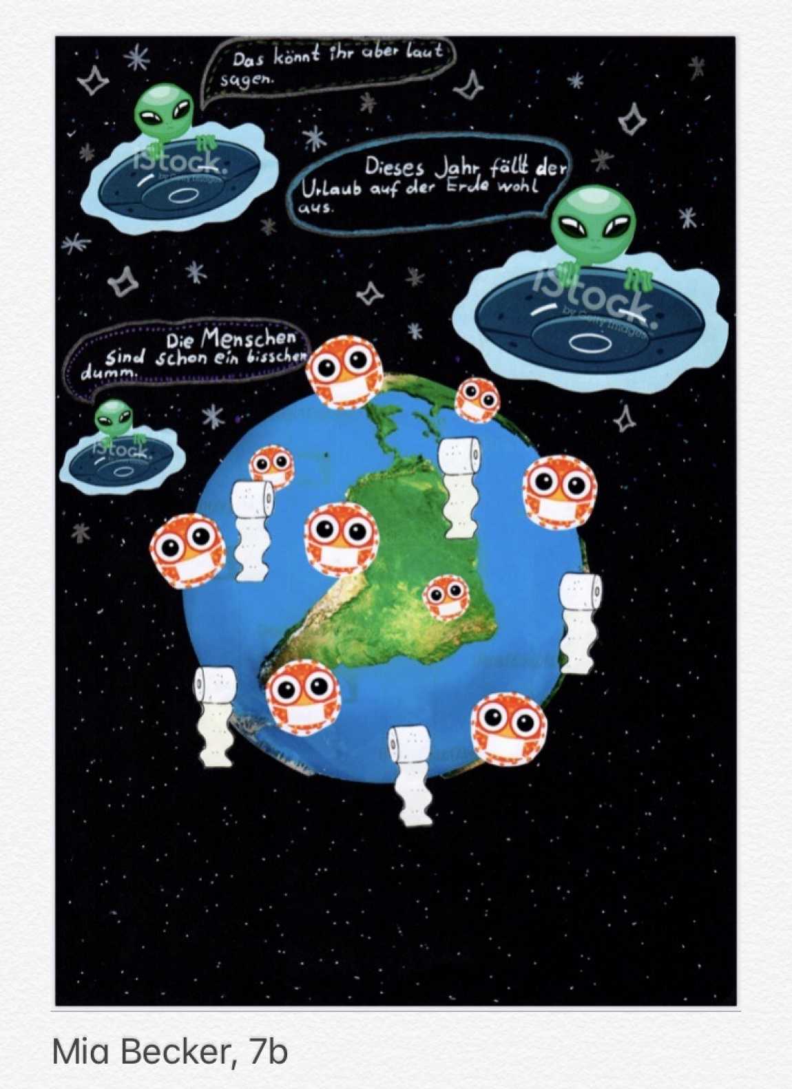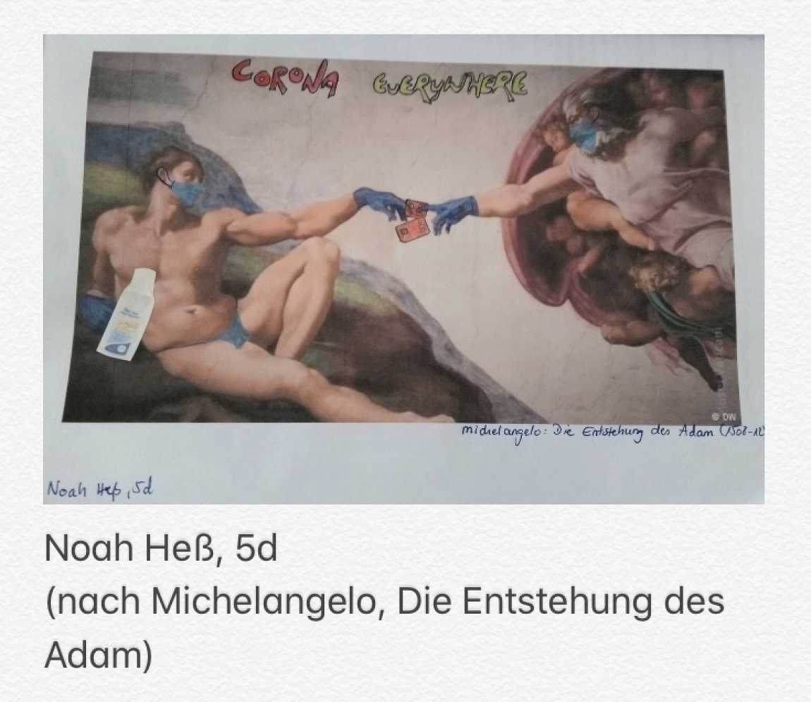 Ausgehend von einer Werbecampagne des Ministeriums für Kultur und Öffentlichkeit der Ukraine haben Schülerinnen und Schüler der Jahrgänge 5-7 das Thema „Kunst und Corona“ bearbeitet. Hierbei wurden kunstgeschichtliche Abbildungen verändert, oder ganz eigene Ideen entwickelt. So entstand beispielsweise eine « Corona Lisa » – warum auch nicht? Erfreulicherweise setzten sich Schülerinnen und Schüler von zu Hause aus teilweise auch mit Grafikprogrammen auseinander. Es entstanden Ergebnisse, die wir der Öffentlichkeit nicht vorenthalten möchten!