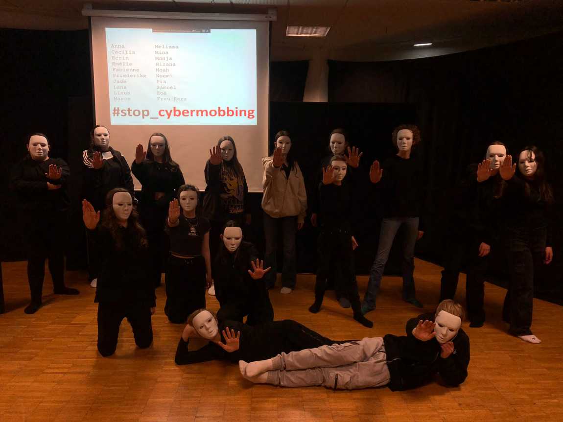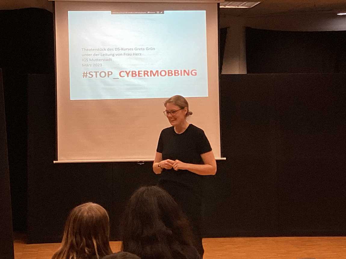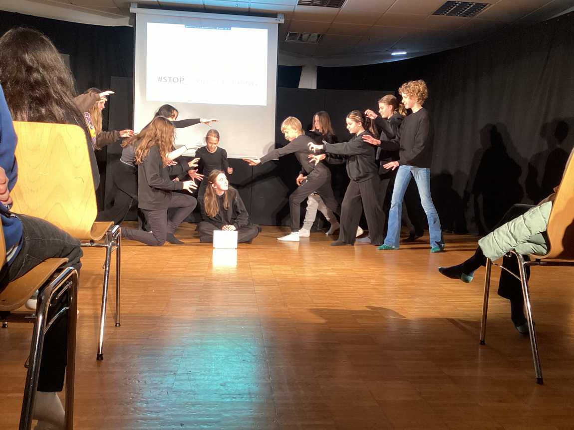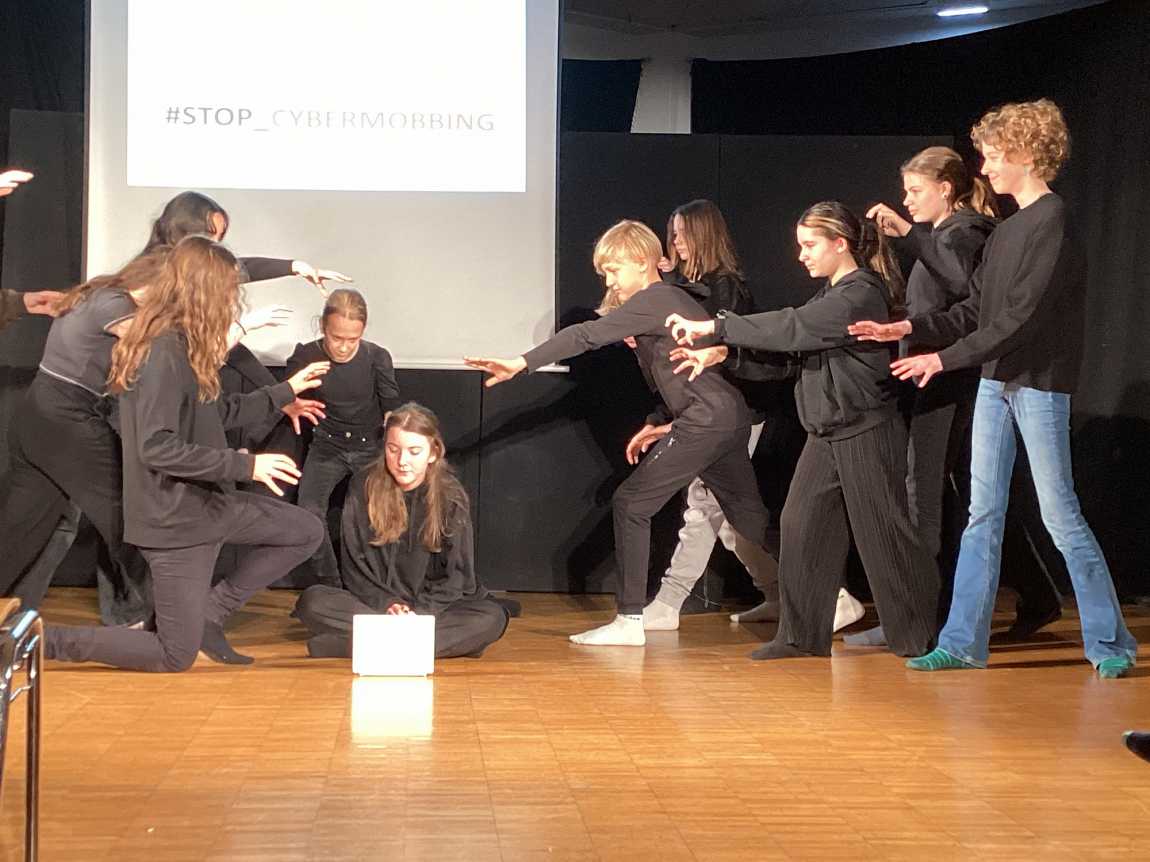 DS Jahrgang 7 hatte heute Prämiere mit ihrem Stück „Stop-Cybermobbing“ vor dem Jahrgang 5.