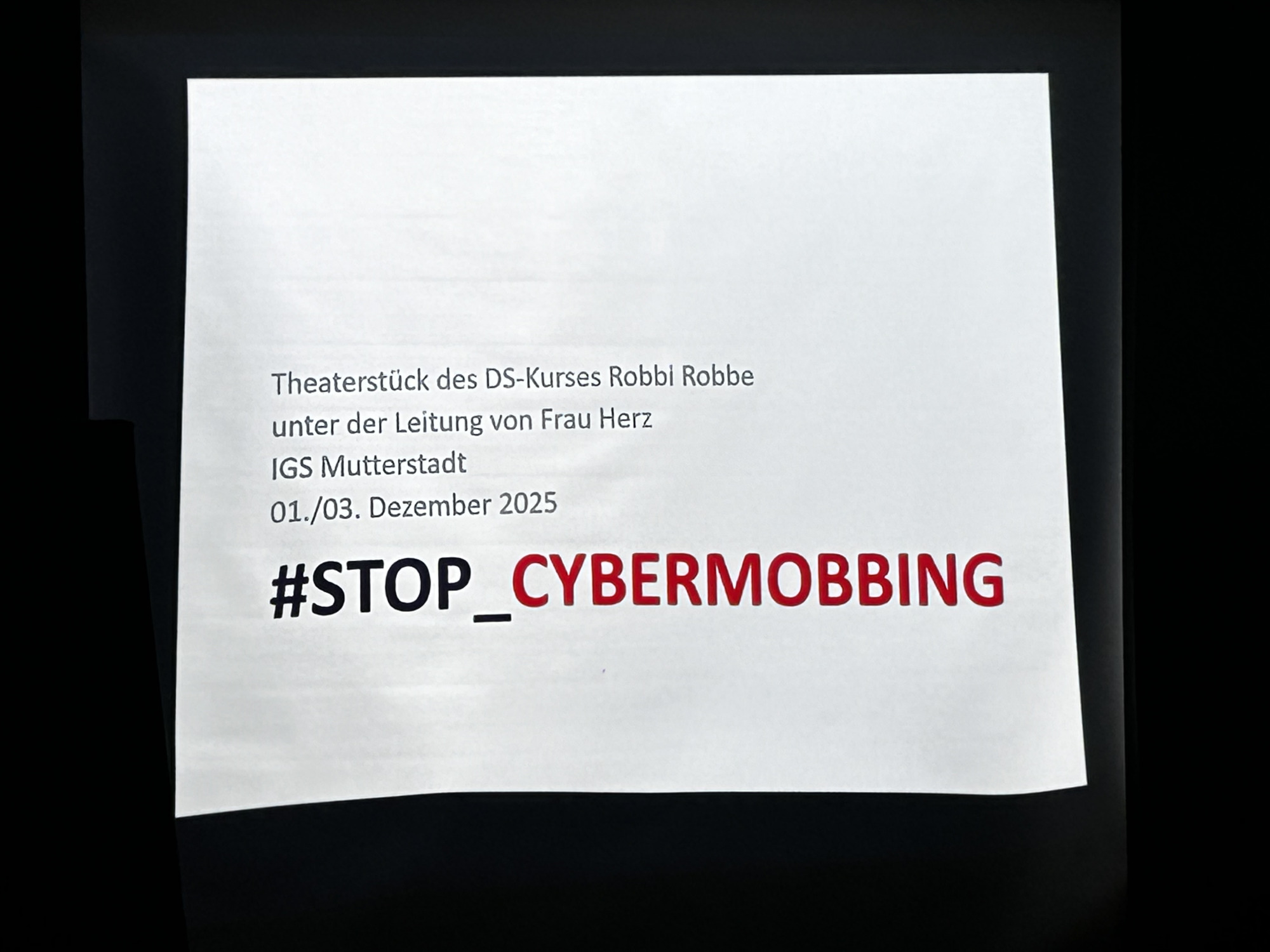 Diese Woche steht eine ganz besondere Live-Präsentation von und für SchülerInnen an: Bereits im vierten Schuljahr in Folge führt der 7. Jahrgang Darstellendes Spiel (DS)allen Fünftklässern ein im DS-Unterricht intensiv erarbeitetes Theaterstück „#stop_cybermobbing“ vor. Anlässlich dessen, präventiv gegen Cybermobbing ein Zeichen zu setzen, möchten wir so auch Möglichkeiten aufzeigen, welche AnsprechpartnerInnen es an unserer IGS gibt und welche Handlungsmöglichkeiten man bereits als MitschülerIn haben kann, wie man bei Mobbing und entsprechend psychischer Belastung Hilfe leisten könnte. Das Theaterstück wird daher neben den Themen physischer Gewalt und Mobbing im Netz auch psychische Folgen wie Suizidgedanken aufgreifen und dazu auffordern, aufmerksam zu sein und das Gespräch zu suchen. Zusätzlich werden die TutorInnen mit ihren 5. Klassen ein vor- bzw. nachbereitendes Gespräch führen, sodass alle 5. KlässlerInnen das erlebte Theaterstück auch im Klassenverband reflektieren können.
