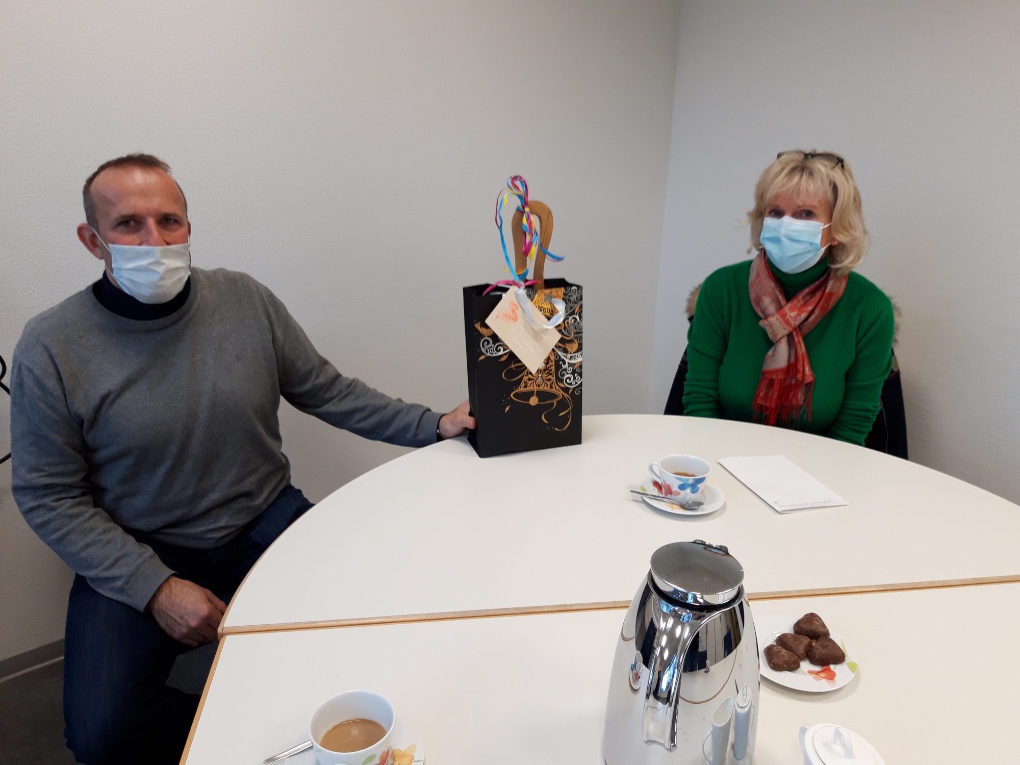 Bei einer kleinen Kaffeerunde überreichte Herr Pellkofer Frau Meier ein kleines Dankeschön für ihren tollen Einsatz.