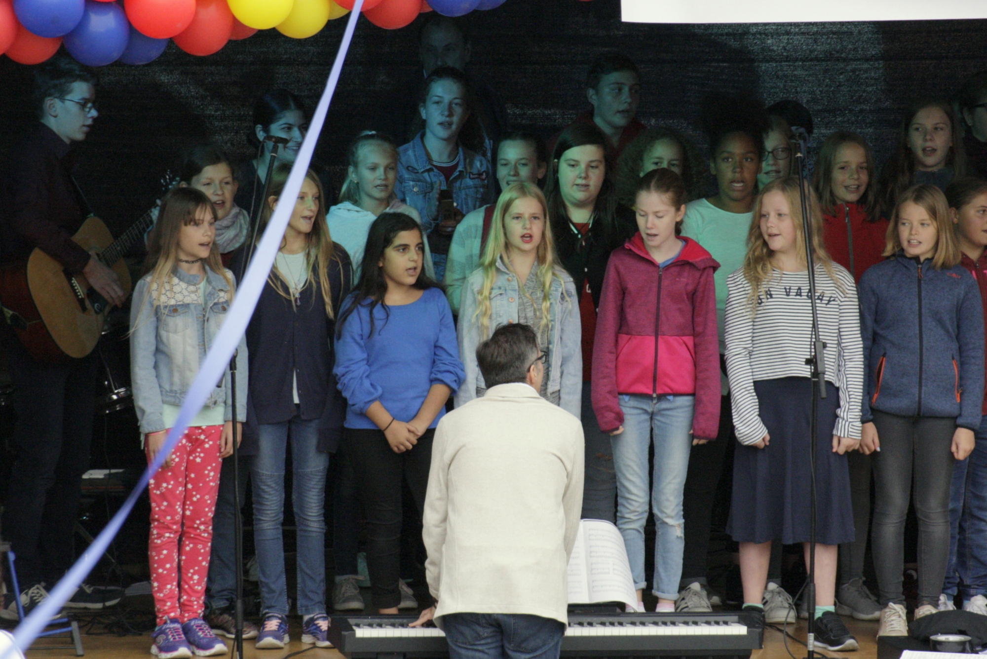 Mit einem Witz zum Einstieg begann Herrn Klees mit seiner mitreißenden und lustigen „Urgesteine der IGS Mutterstadt“-Aufführung, welche uns in einer Zeitreise von den allerersten Anfängen unserer Schule bis ins Hier und Jetzt führt und dabei auch mal den ehemaligen Schulleitern das Mikrofon übergibt. Flüssig geht es dann in die offizielle Eröffnung des Schulfestes und der Projektpräsentationen durch unseren Direktor über. Zum Schluss tritt noch einmal das Chor-Projektauf, das mit seiner Songauswahl der gesamten Gesellschaft eine einfache Botschaft sendet: „Shut up and Dance with me!“