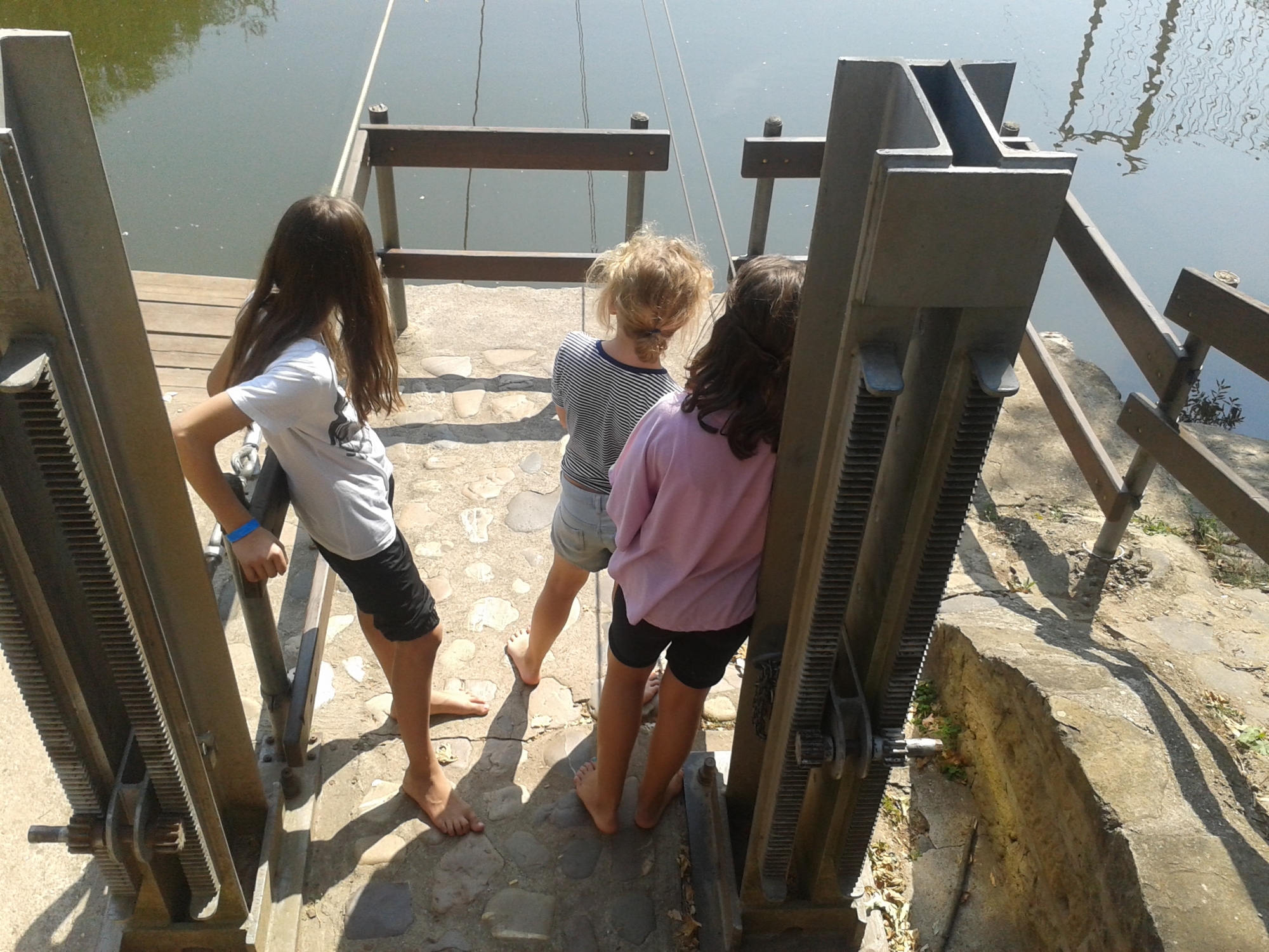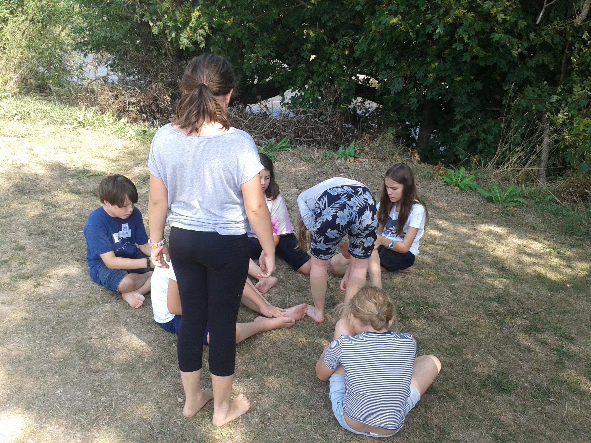Am Dienstag ging es nach Bad Sobernheim auf den längsten Barfußpfad Deutschlands. Es hieß: Schuhe aus und loslaufen durch den kalten glitschigen Lehmstampfpfad über Gras und Steine zur Nahefurt, wo wir unsere Füße abkühlen konnten. Weiter ging es zur Hängebrücke zurück zum Anfang.