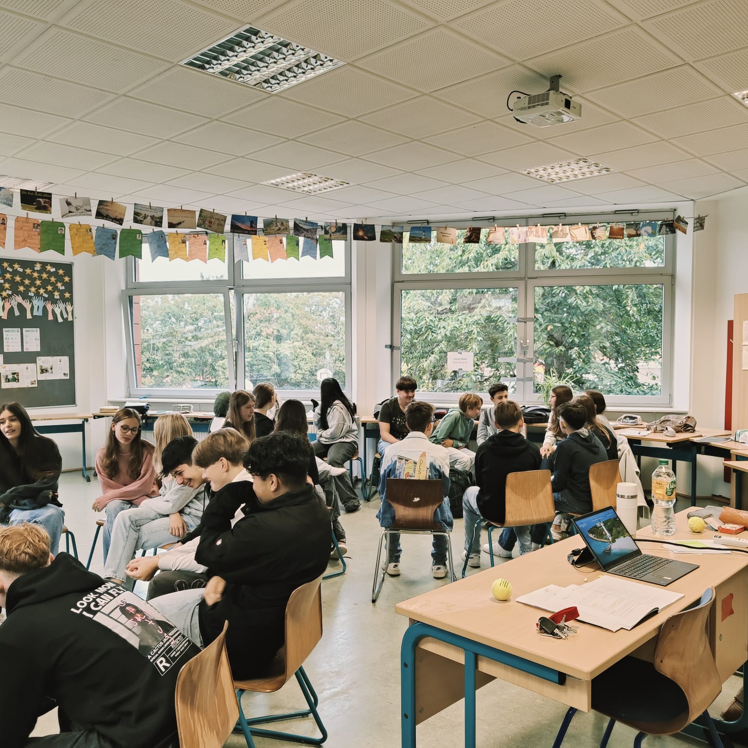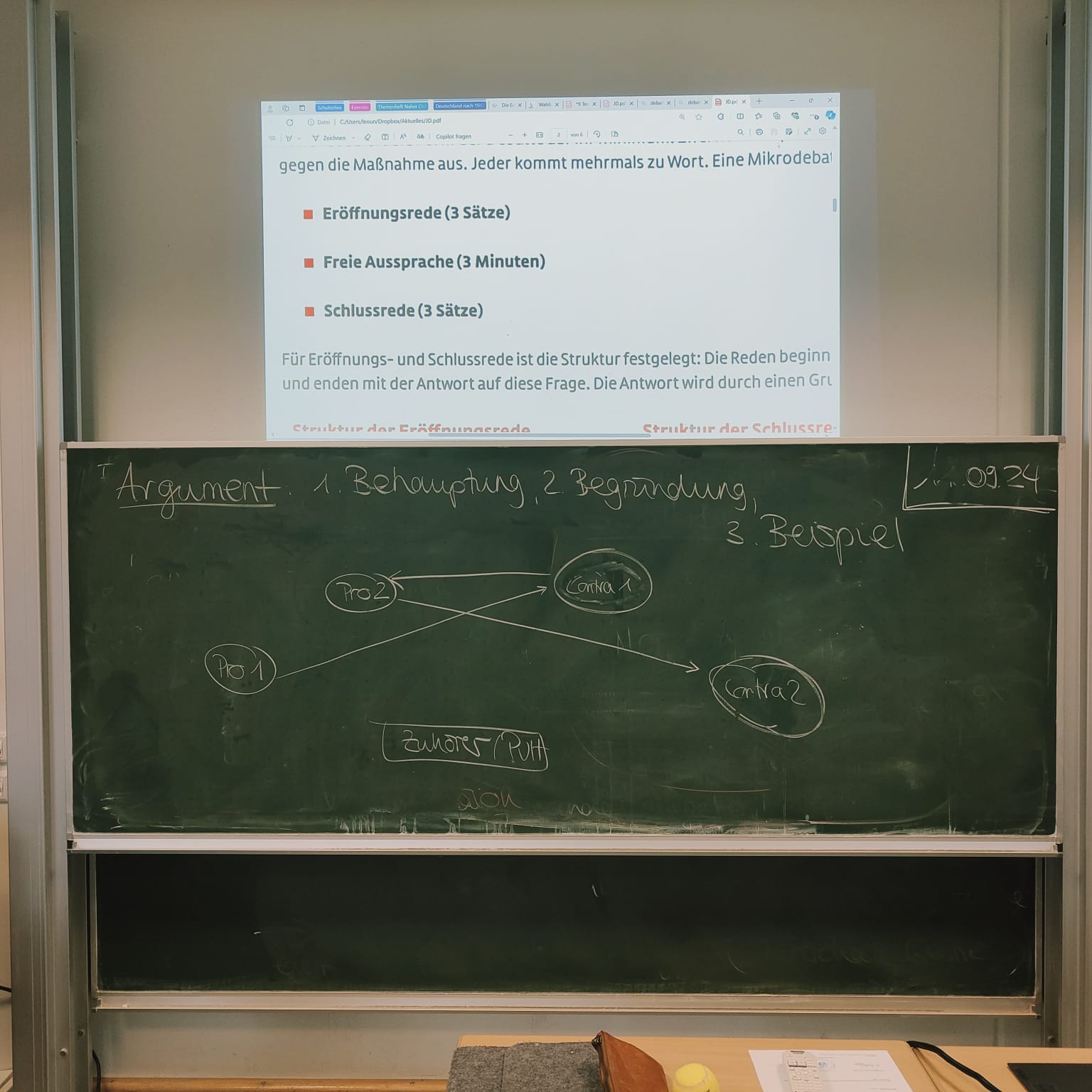 Mittwoch, 11.09.24. Die 8b versammelt sich wie an jedem Tag in ihrem Klassenzimmer. Der Plan: Einen ganzen Schultag lang debattieren lernen. Frau Held und vor allem Frau Krenzer haben das über die Klasse verhängt; verlängertes Methodentraining, könnte man meinen. „Und weil ich das unbedingt mit euch machen will! Das wird euch ganz sicher was bringen!“, ist Frau Krenzer von ihrer eigenen Idee begeistert. Die 8b schaut müde und skeptisch.