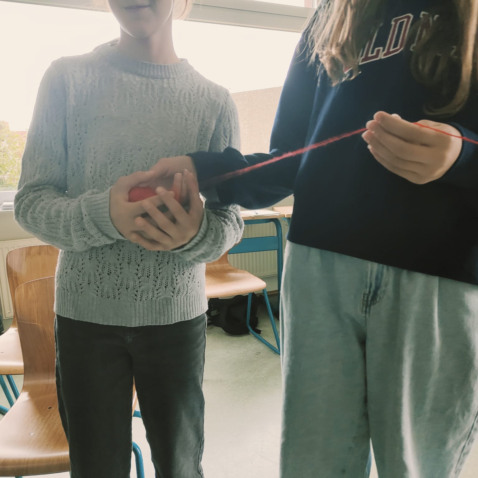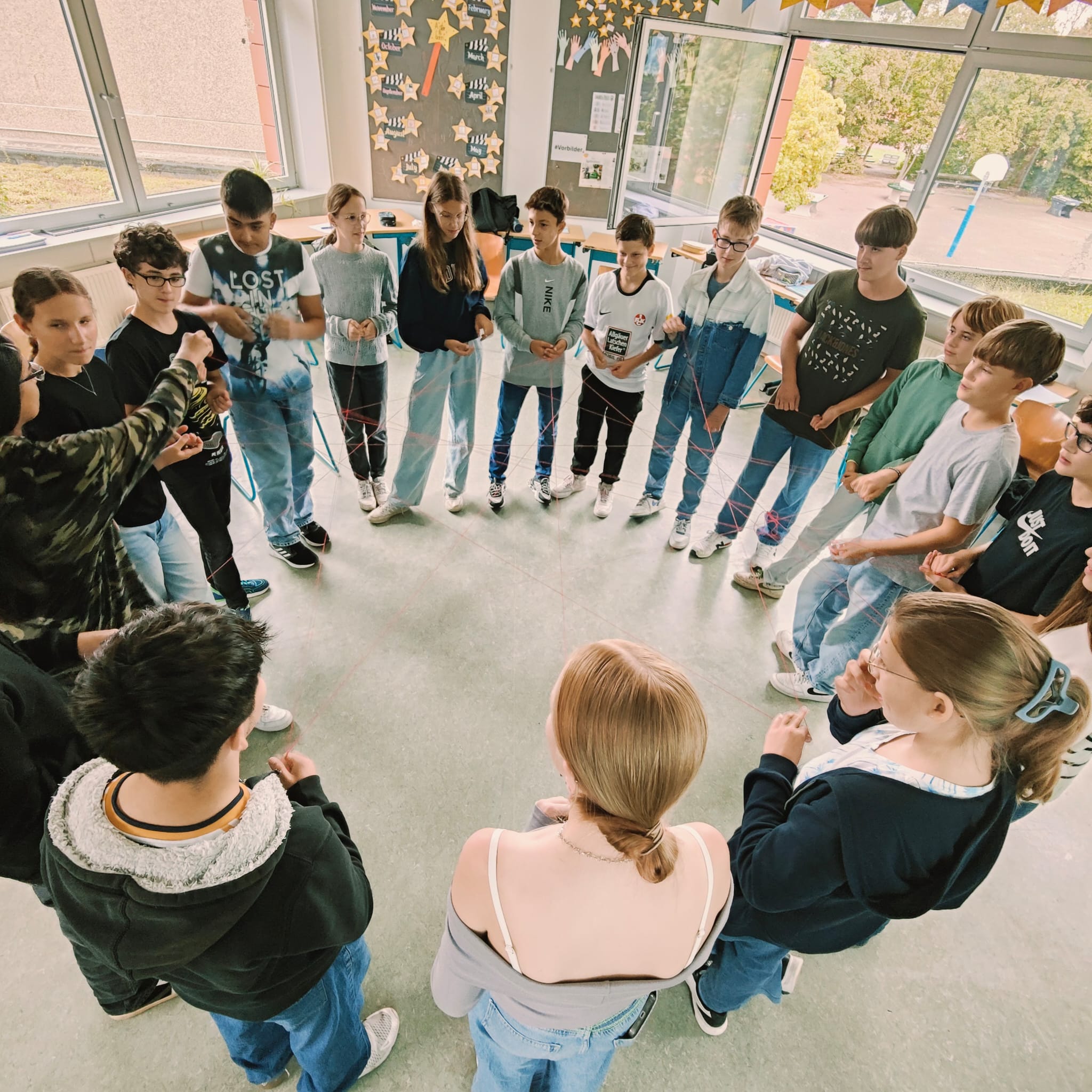 Um das zu lernen, gibt’s einige Spiele: Sich einen Ball zuzuwerfen und den sicher zu fangen, ist das einfachste. In einer Runderzählung spontan eine zusammenhängende Geschichte zu erfinden, ist schon deutlich schwieriger. Etwas zu lachen gibt’s deshalb immer wieder, z.B. wenn die Geschichte völlig irre Abzweigungen nimmt. Aber die 8b versteht, was sie hieran lernen kann: Aufmerksam und interessiert zu sein, beim Thema zu bleiben, sich selbst und die Mitstreiter genauso wie die Zuhörer immer wieder gedanklich zurückzuholen und einen roten Faden zu verfolgen.