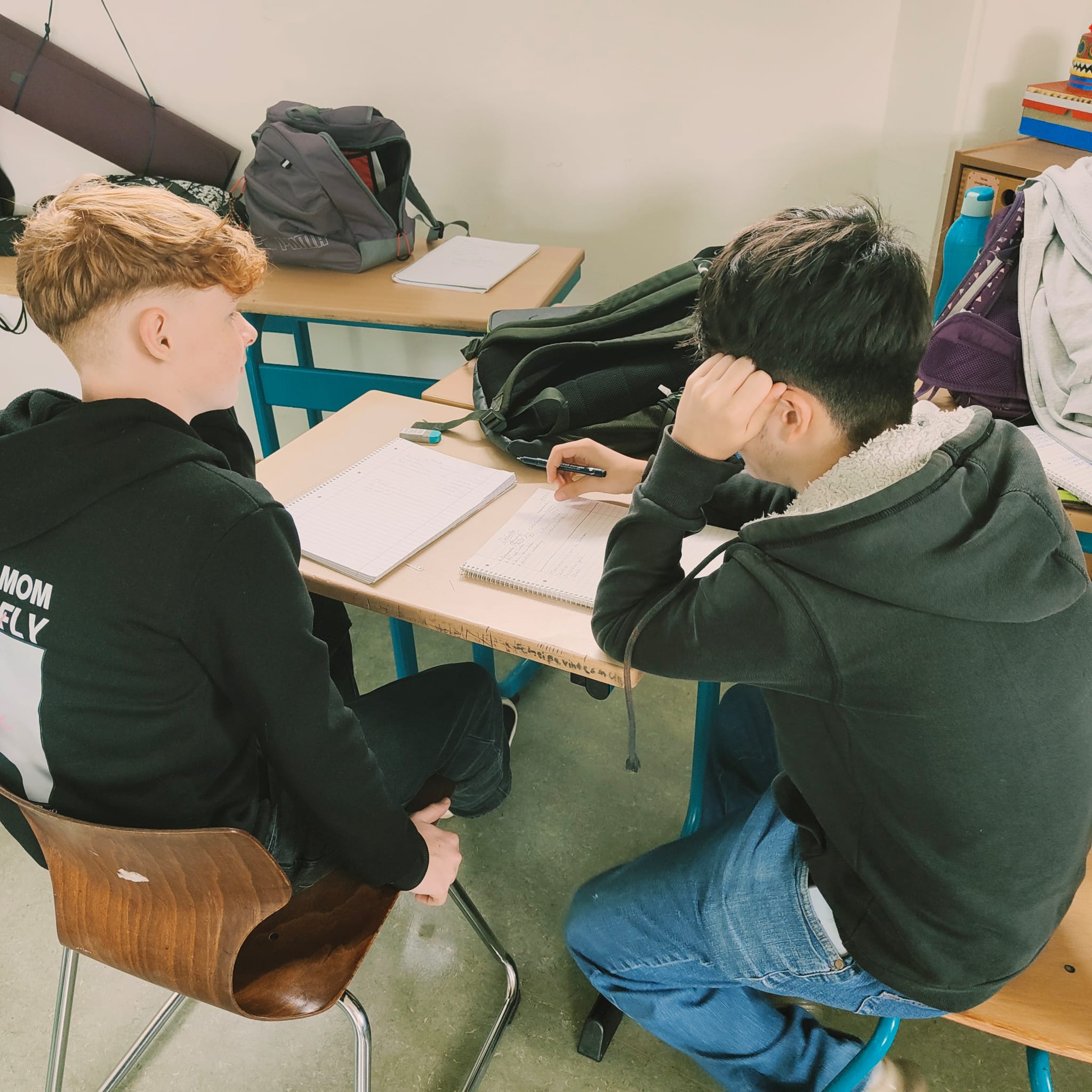 Und so vergeht der Schultag rasch in einem beständigen Wiederholen und Ergänzen dessen, wie eine Debatte aufgebaut sein muss: Eröffnungsrede, Freie Aussprache, Schlussrede. Die Schülerinnen und Schüler sammeln in vier Gruppen fleißig Pro und Contra für selbst erdachte „Soll…?“-Fragen, z.B. „Soll es an der IGS Mutterstadt Spinde geben?“. Sie feilen an ihren Argumenten, gehen immer wieder in Mikrodebatten miteinander. Sie rufen sich selbst zur Räson – „Lass mich ausreden!“ –, machen weiter oder fangen neu an. Nehmen Fäden auf, gehen auf die Gegenseite ein, machen sich weitere Notizen.