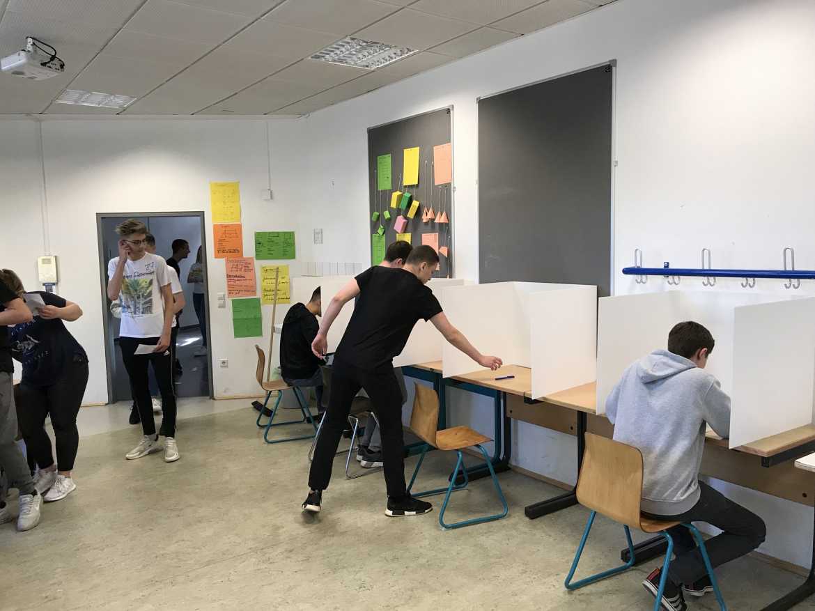 Zunächst kamen die Schüler klassenweise in unseren Wahlraum, der wie bei echten Wahlen auch Sichtschutz zwischen den Tischen und eine Urne besaß. Nacheinander mussten sie dann den Wahlhelfern, die ebenfalls Schüler waren, einen Ausweis zeigen und ihren Wahlpass abgeben, den sie im Vorfeld ausgeteilt bekommen hatten. Wenn dann alles stimmte, bekamen die Schüler echte Wahllisten ausgeteilt, die auch bei den Europawahlen verwendet werden. Auf diesen waren alle Parteien vermerkt, sodass die Schüler ein Kreuz bei der Partei machen konnten, die sie unterstützen würden. Zuletzt warfen sie ihre Liste dann in die Urne.
