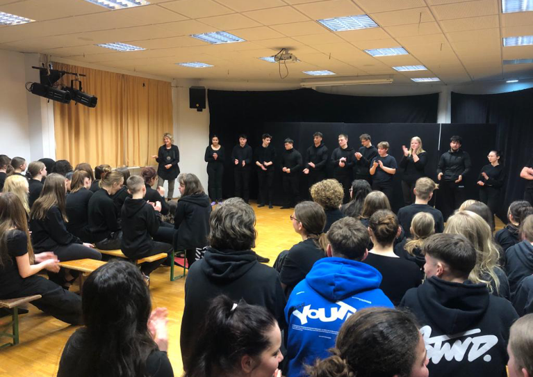 Um 13:30 Uhr begrüßten die DS-Lehrerinnen bei Sonnenschein die insgesamt über 100 Schüler*innen auf dem Hof der IGS. Anschließend gingen die jeweiligen Gruppen mit ihren zugewiesenen Partnergruppen in einen Klassenraum, um sich dort gemeinsam mit einem Warm-up spielbereit zu machen. Sie erhielten Beobachtungskärtchen, die später bei der gemeinsamen Reflexion der Präsentation als „roter Faden“ dienten. Dann ging es los!