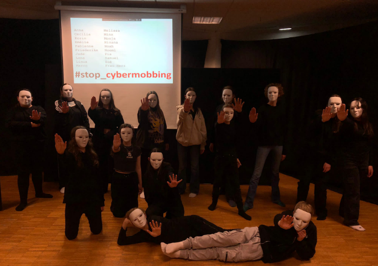 Nach der Pause dominierten Inszenierungen, die uns Zuschauer*innen sozusagen „an die Nieren gingen“ und zum Nachdenken angeregt haben. Den Auftakt machte die DS-Gruppe 7 mit einer szenischen Aufklärung über das Thema „Cyber Mobbing“.Damit haben die Schüler*innen ein Problem thematisiert, welches uns alle angeht. Das Opfer kam hinter einer weißen Leinwand zu Wort. Die Zuschauer*innen konnten somit, wie in einem „Schattenspiel“ nur seine Umrisse sehen und ihre eindringliche Stimme hören, sodass für alle deutlich wurde, jede und jeder könnte zum Opfer werden.