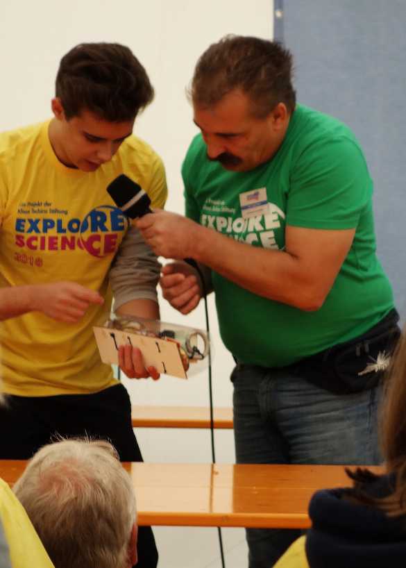 Das dritte Foto dokumentiert das Tauchboot von Andres Lachmund während der Präsentation vor der Jury. Das Kupferrohr im Boot wird vor dem Tauchen mit einer Luftpumpe auf ca. drei Bar aufgepumpt. Eine in einem Marmeladenglas verbaute Zeitschaltung löst dann nach zwei Minuten ein Magnetventil aus. Die im Kupferrohr komprimierte Luft füllt dann einen Luftballon, welcher dem Tauchboot den nötigen Auftrieb verschafft.