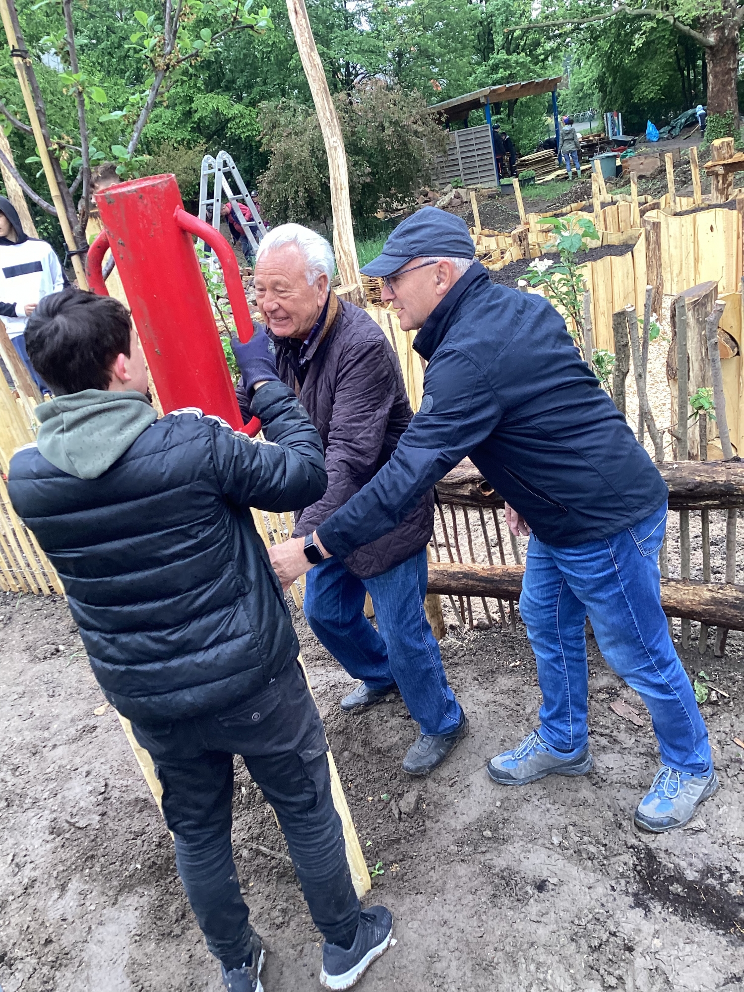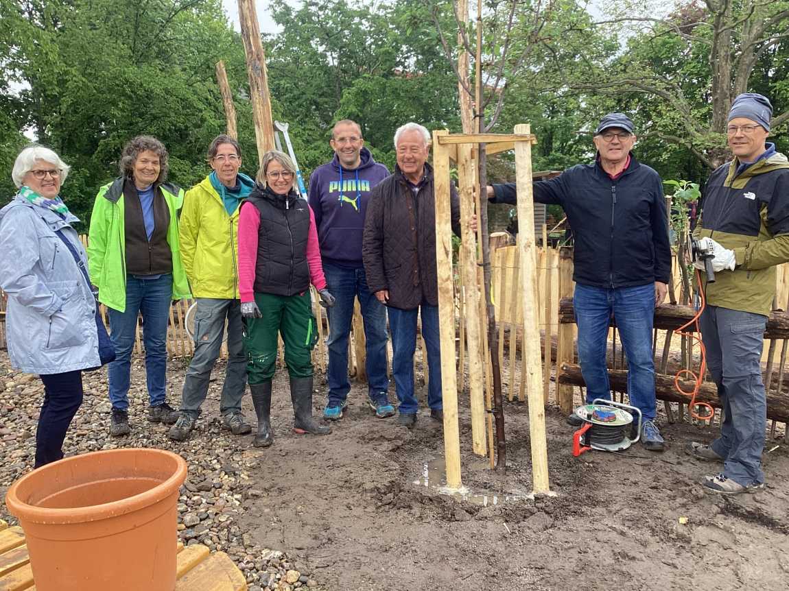 Aber nicht nur schuleigene Personen interessieren sich für unseren Schulgarten auch andere sind davon angetan. So hat uns der Lionsclub Ludwigshafen nicht nur mit einer hohen Geldspende von 4000 Euro unterstützt, sondern Hr. Dr. Strubel und Herr Fußer kamen heute, am Samstag, extra auf das Gelände und langten zur Schaufel und pflanzten einen Zwetschgenbaum. Das künftige Zwetschgenmus zergeht einem schon auf der Zunge…