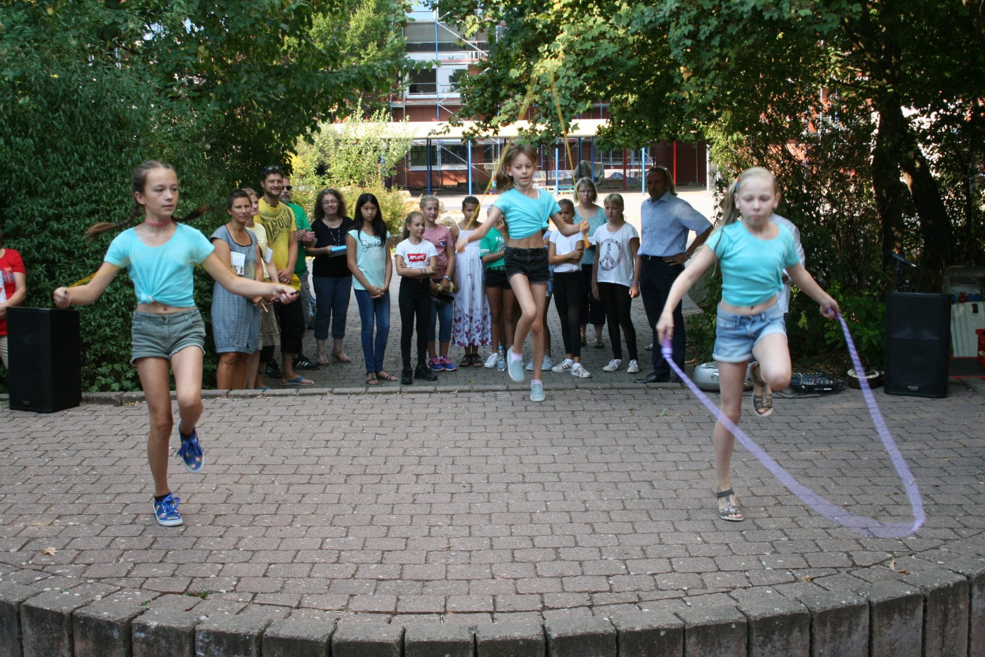 Nach einem Willkommmenslied des 6-er Jahrgangs begrüßten Schulleiter Herr Pellkofer und Stufenleiterin Frau Fußer den neuen Jahrgang. Im Anschluss daran gab es eine spritzige akrobatische Einlage, ebenfalls von den Sechstklässern. Vielen Dank dafür!