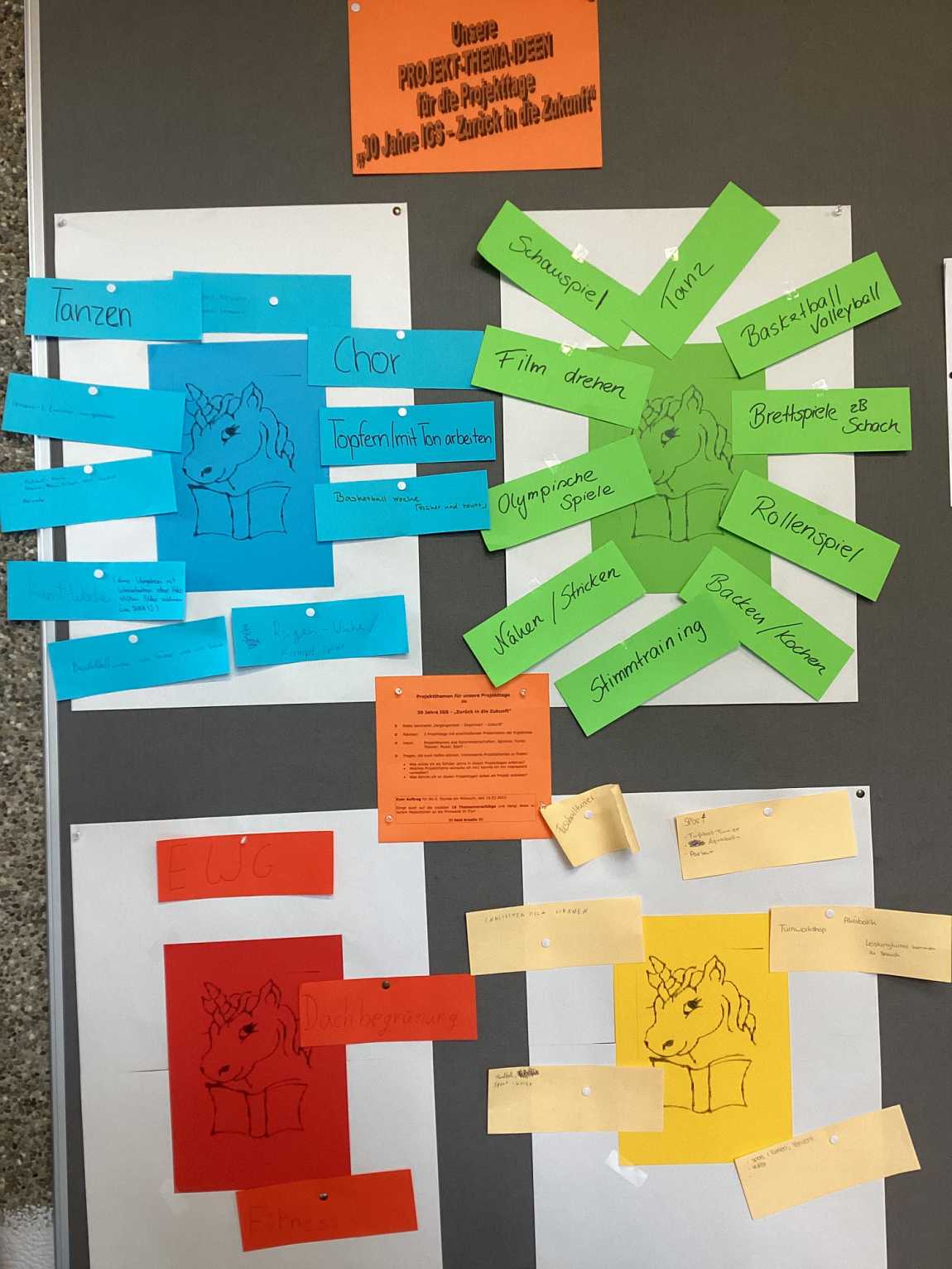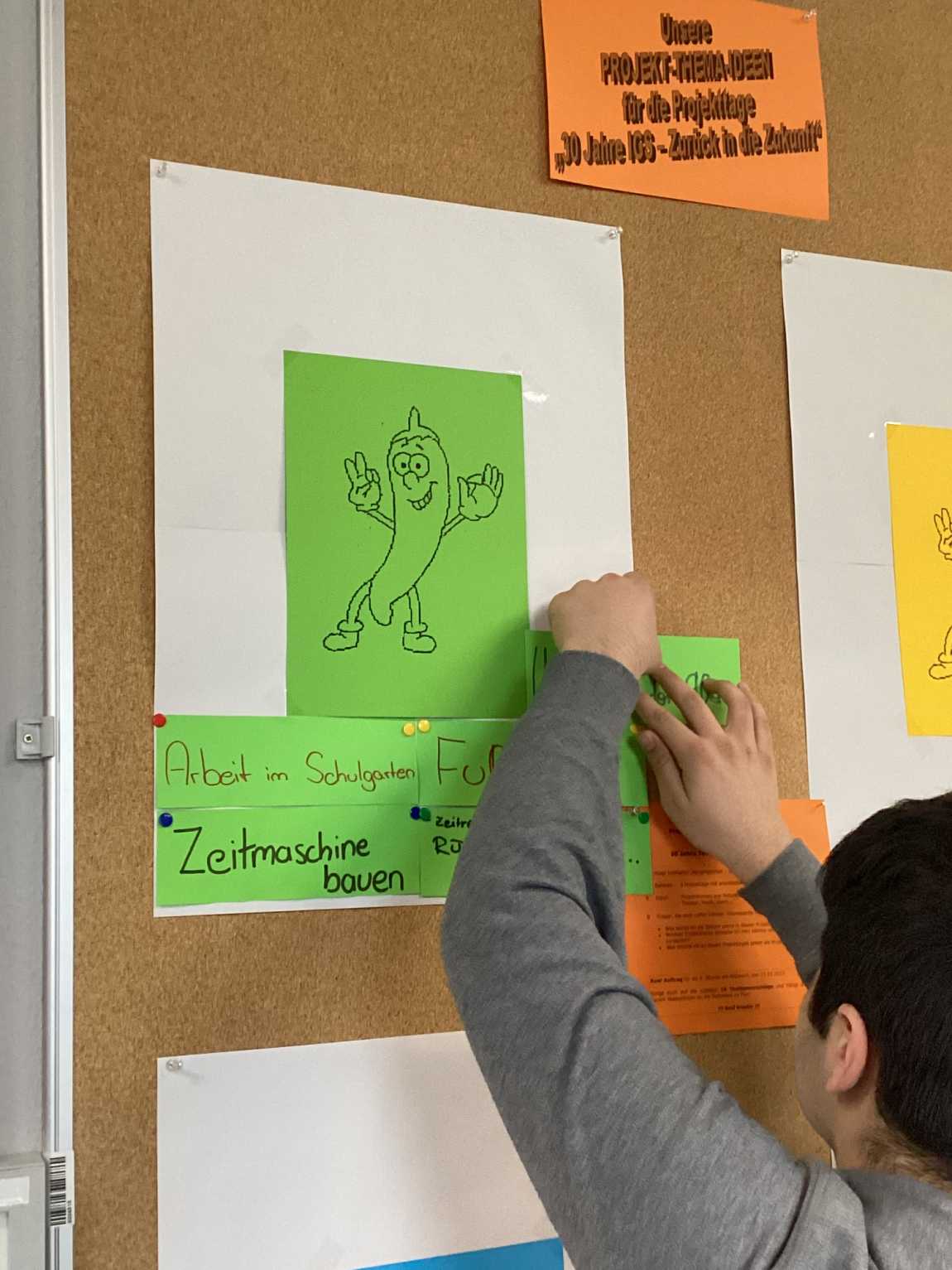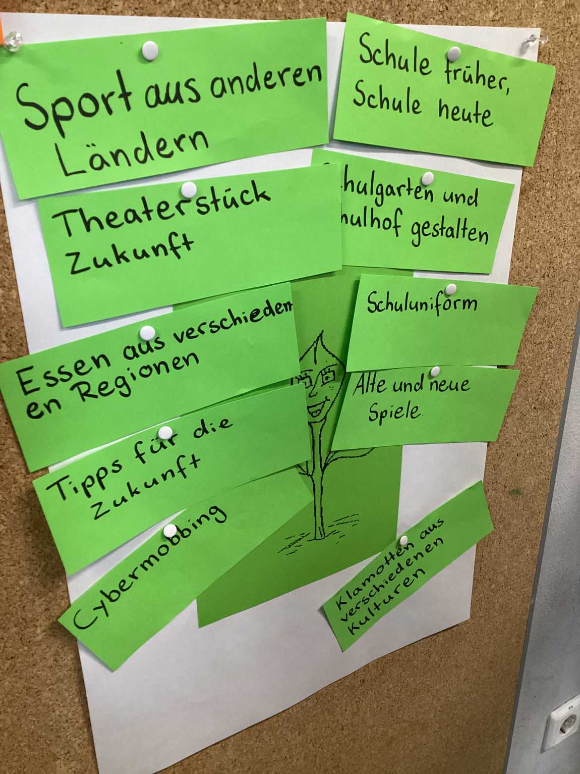 Die SchülerInnen wurden von ihm mit den Anregungen im Kopf in ihre Klassen entlassen, um dort gemeinsame Ideen zu sammeln und als Projektvorschläge an den Jahrgangspinwänden festzuhalten.
