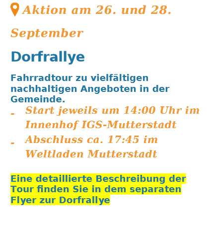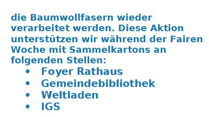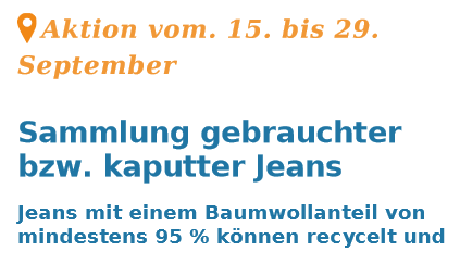 Wie auch im letzten Jahr sind wir wieder beteiligt an der Fairen Woche Mutterstadt. Am 26. und 28. September 2023 beginnt die Dorfrallye in unserem Schulgarten. Wir freuen uns auf viele interessierte Gäste! Bei uns erfährt man etwas über die „Weltreise der Jeans“ und kann auch seine alte Jeanskleidung in unserer blauen Jeans-Recylingtonne abgeben.
