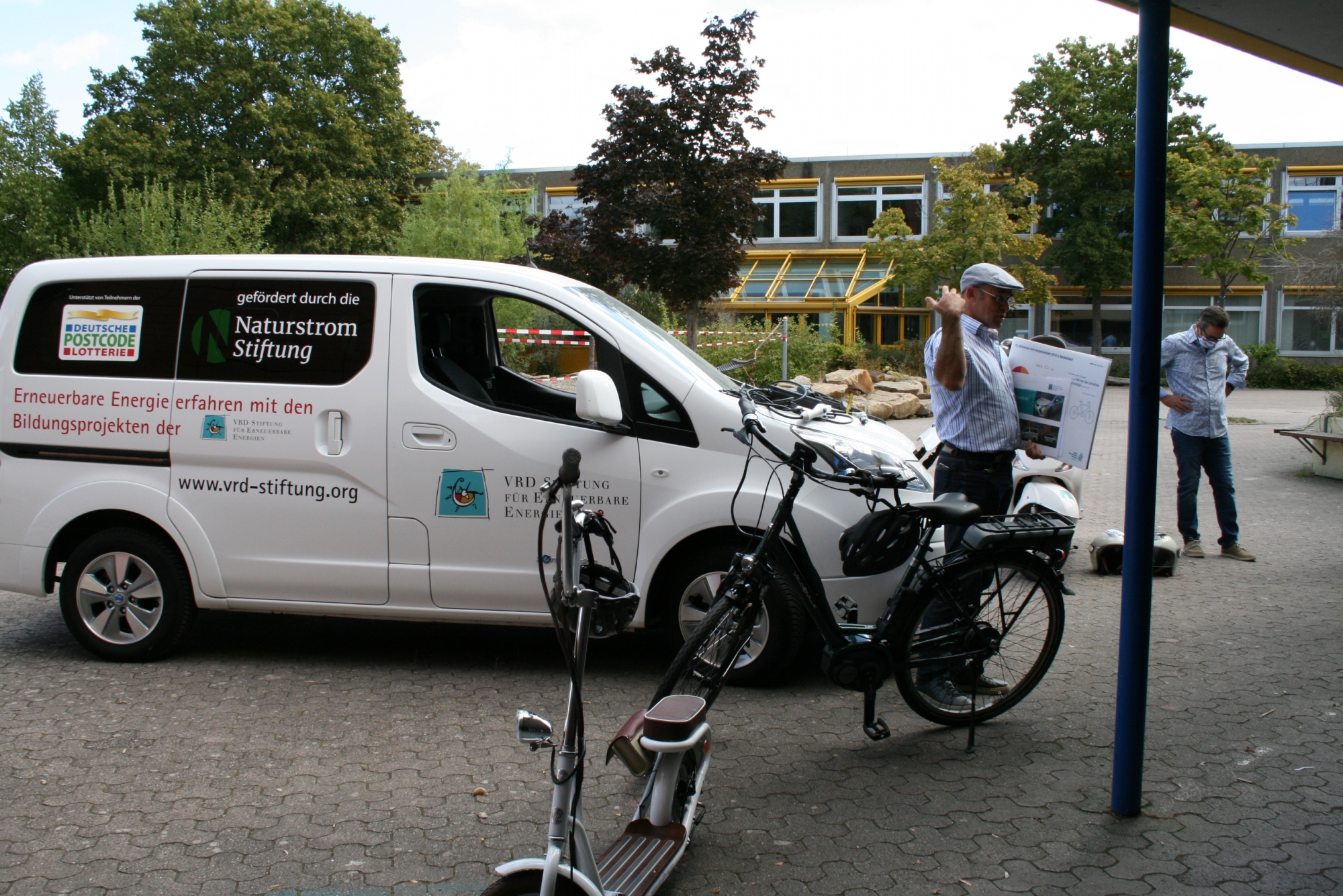 Diese Frage konnten die Schüler*innen des 8. Jahrgangs nach den jeweils zwei Stunden Elektromobilitäts-Modul eindeutig mit „Ja“ beantworten. Im Anschluss an die theoretische Einführung und auch der durchaus kritischen Auseinandersetzung mit der Elektromobilität durften die Schüler die drei mitgebrachten Fahrzeuge: Das E- Bike, den E-Scooter und den E-Roller testen und auf dem Schulhof damit fahren. Außerdem durften die Kollegen die Schüler im E-Auto über den Schulhof fahren. Das geräuschlose und vor allem emissionsfreie Fahren war für die Schüler eine prima Erfahrung; sie waren mit großer Begeisterung dabei.