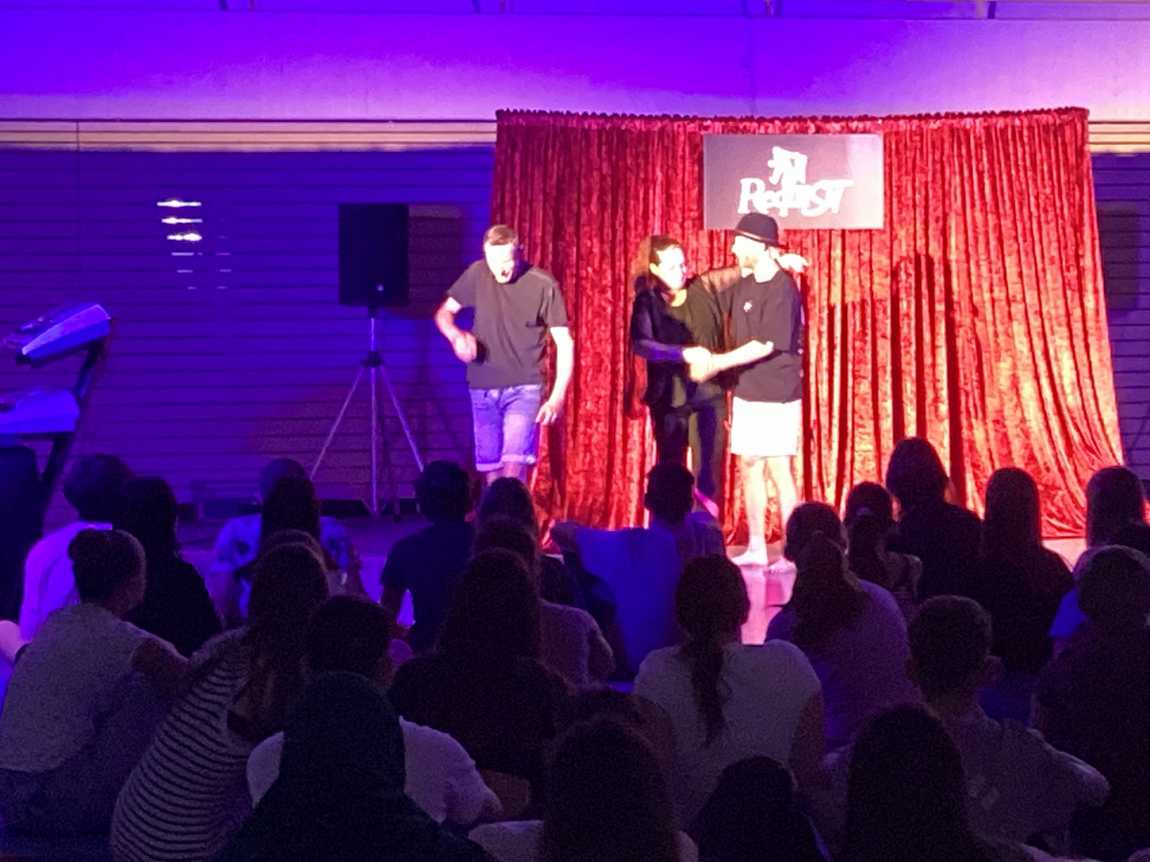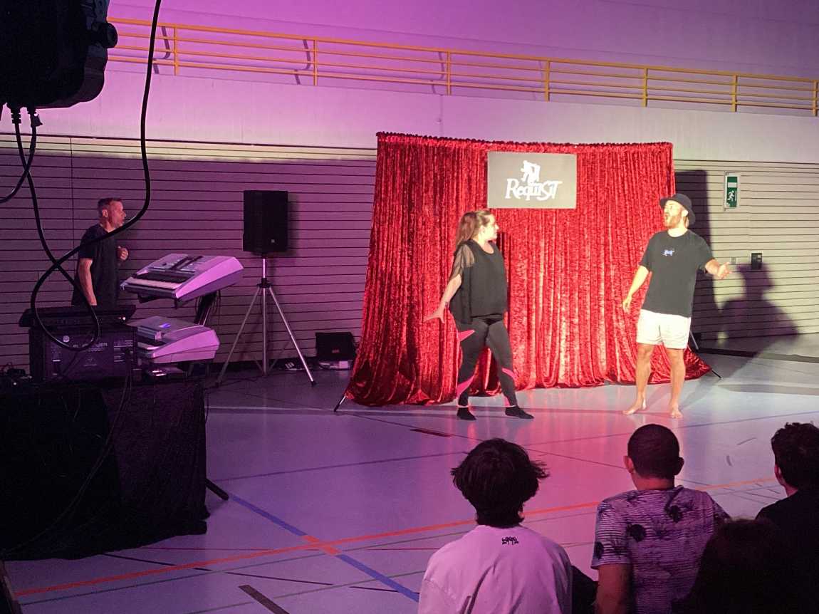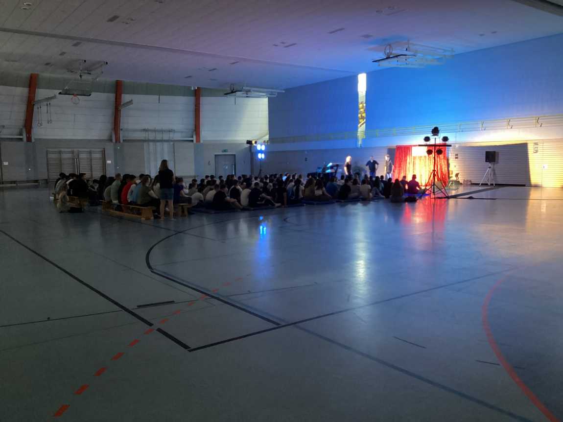 Die Sporthalle wurde heute zweckentfremdet…Schon früh am Morgen reiste das Theaterteam an und baute die Bühne auf. Um 9.45 Uhr strömten unsere 9. Klässer in die Sporthalle und waren gespannt was sie hier erwartet.