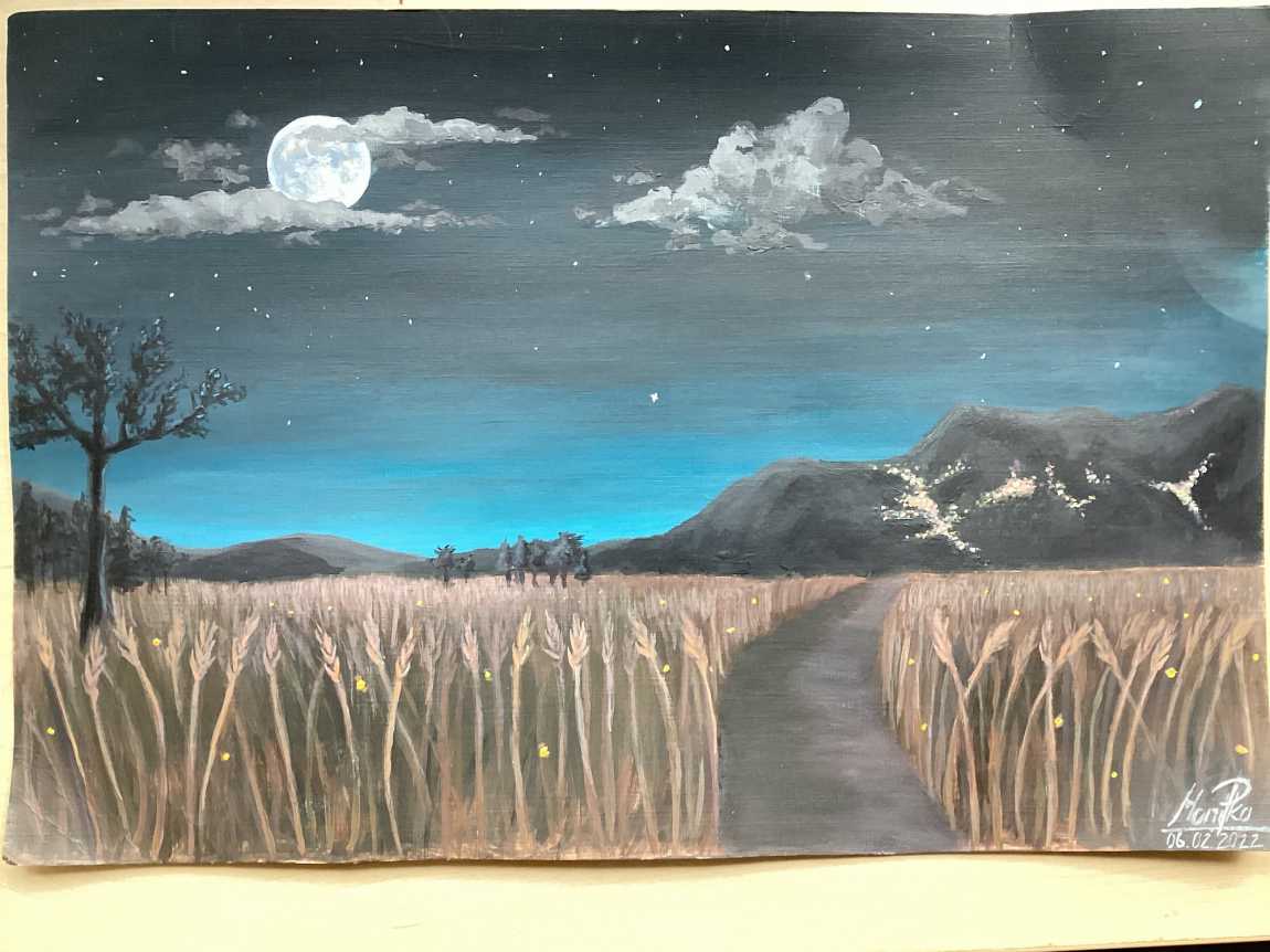 Bei der Besprechung des romantischen Gedichts kam die Idee auf das Bild, welches vor dem inneren Auge der Lesenden entsteht, auf Leinwand festzuhalten. Dies war eine freiwillige Aufgabe, die Jennifer Delecate und Monika Pjano aus der 12. Klasse sehr kreativ und erfolgreich umsetzten.