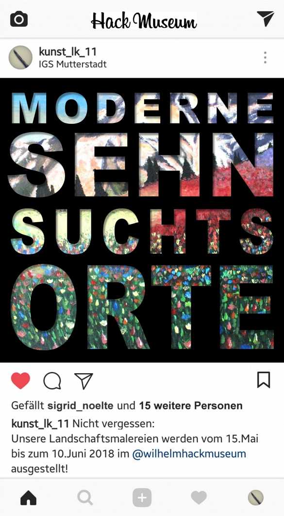 Blühende Gebirgslandschaften, geheimnisvolle Flussläufe oder Seen, menschenleere Strände, aber auch urbane oder fiktive Szenarien – so sehen sie aus, die modernen Sehnsuchtsorte der Schülerinnen und Schüler des Leistungskurses Bildende Kunst 11 unserer Schule. Entstanden sind diese Landschaftsmalereien in einer engen Zusammenarbeit mit dem Wilhelm-Hack-Museum. Dieses wird die Werke unser jungen Künstlerinnen und Künstler vom 15.Mai bis 10. Juni 2018 ausstellen. Die Vernissage dieser Ausstellung wird dort am 15. Mai 2018 um 16.30 Uhr stattfinden.