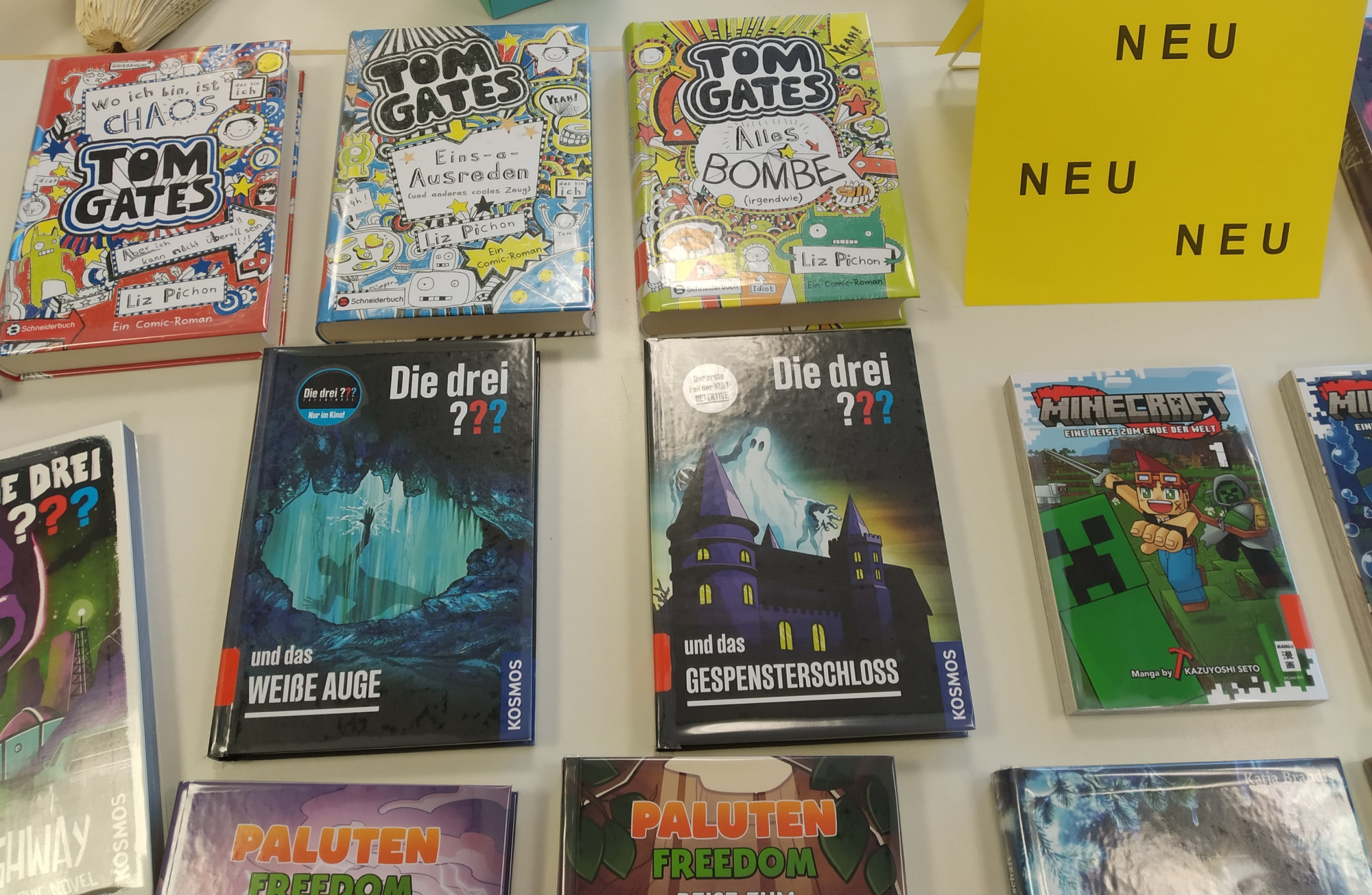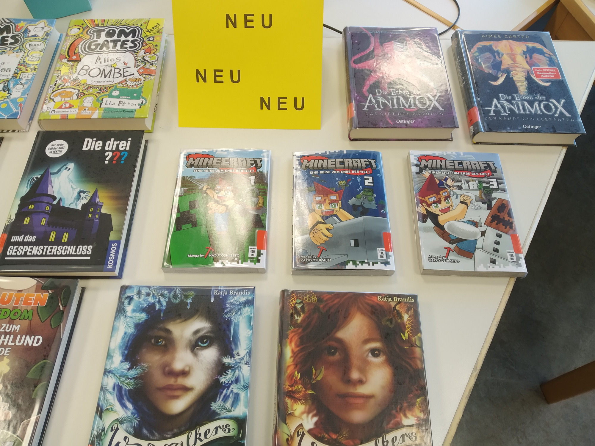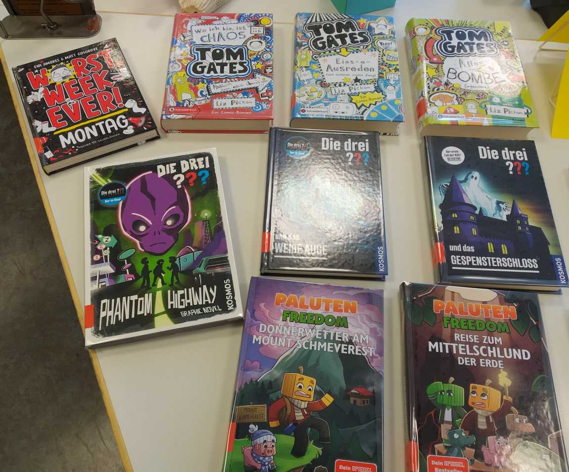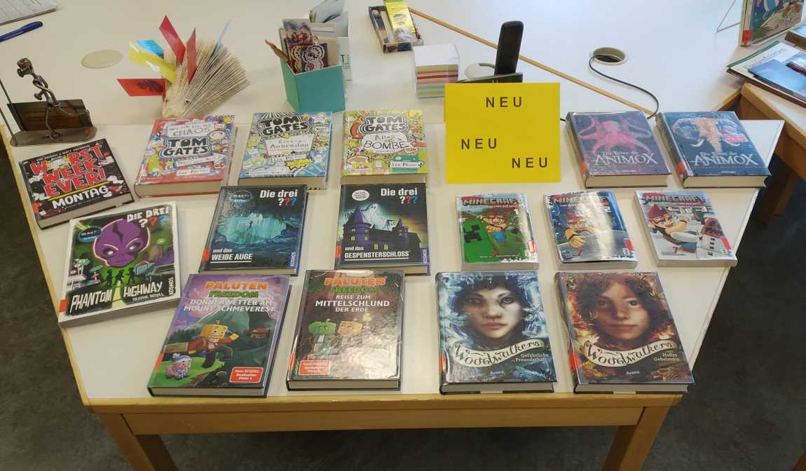 Unsere Mediothek hat neue Bücher für Euch eingekauft. Ab jetzt könnt Ihr Comic-Romane, wie z.B. „Tom Gates“ oder „Worst Week Ever“, Minecraft-Manga, Paluten-Bücher oder neue „Die drei???“-Romane ausleihen. Ebenso haben wir unsere „Woodwalkers“ und „Animox“-Reihen mit neuen Büchern ergänzt. Schaut vorbei. Wir freuen uns auf Euch!“