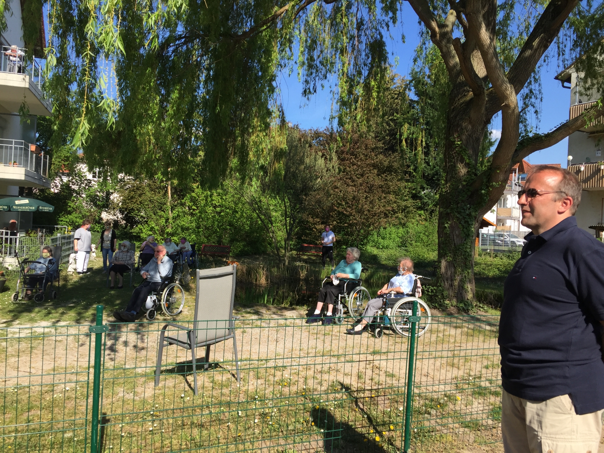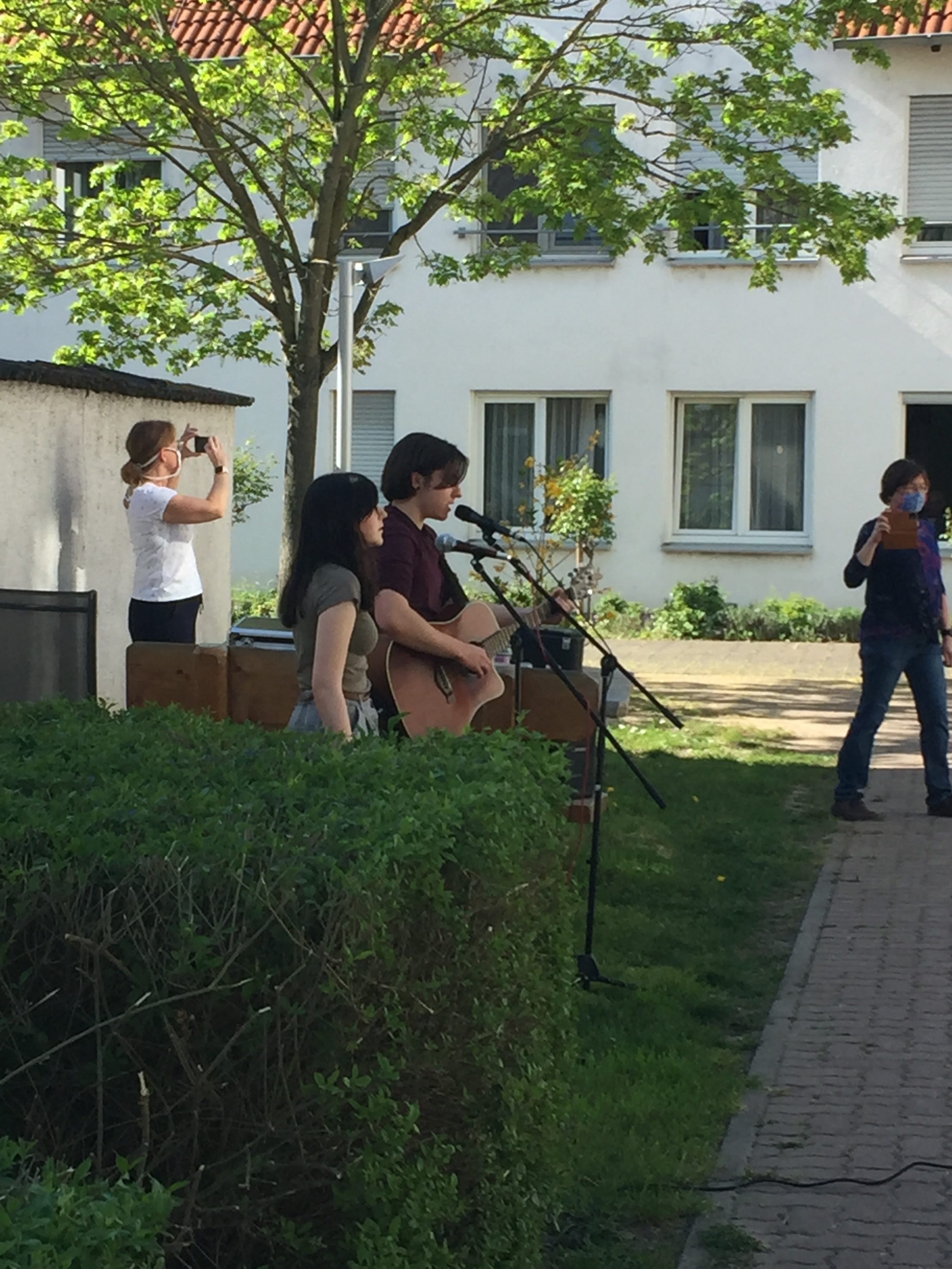 Unter Einhaltung der Abstandsregeln konnten viele Bewohner des Seniorenheims entweder vom Balkon oder durch geöffnete Fenster und aus dem Garten ca 20 Minuten einen besonderen Ohrenschmaus erleben. Selbst die Nachbarn standen auf den Balkons und spendeten Beifall.