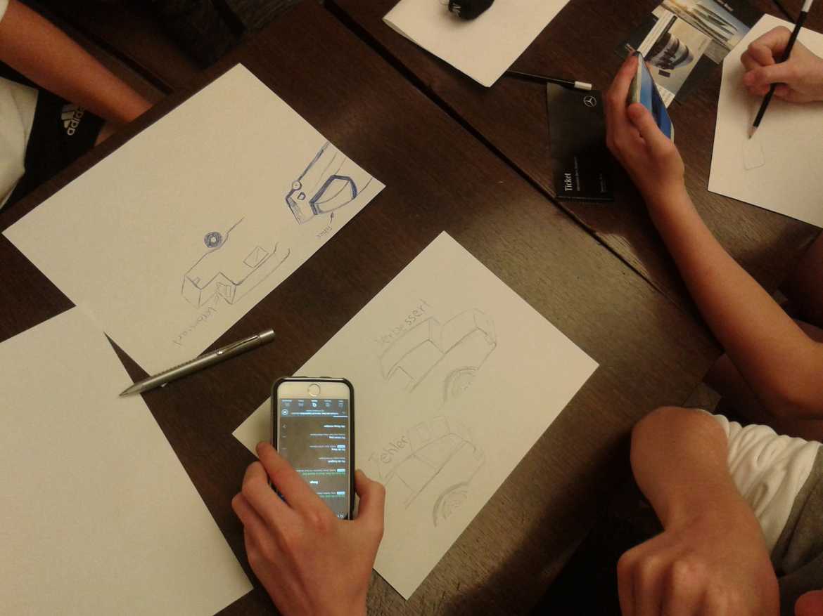 Im Mercedes-Benz Museum ging es zunächst um Baustatik und Architektur, die jeder im Sinne der Becher-Schule oder emotional in einem Foto interpretieren sollte, bevor Aerodynamik und Produktdesign vom Sehen über die Hand in den Stift auf das Papier flossen. Zeichnend saßen wir im Museum und versuchten das Design der alten und neuen Autos noch ein bisschen schlanker, präziser, stromlinienförmiger zu entwerfen.