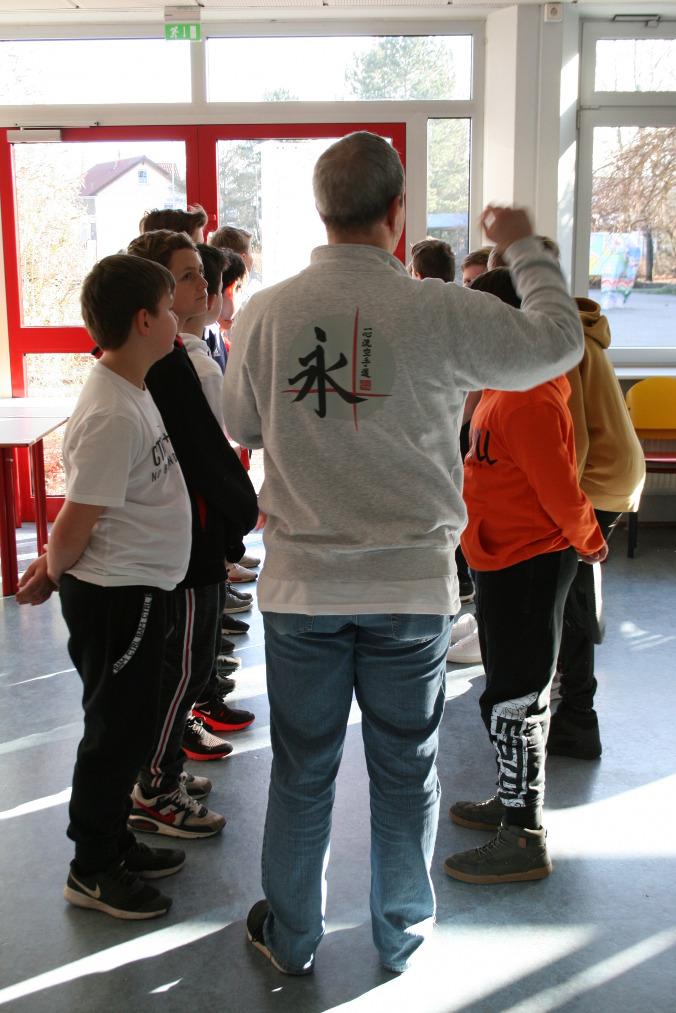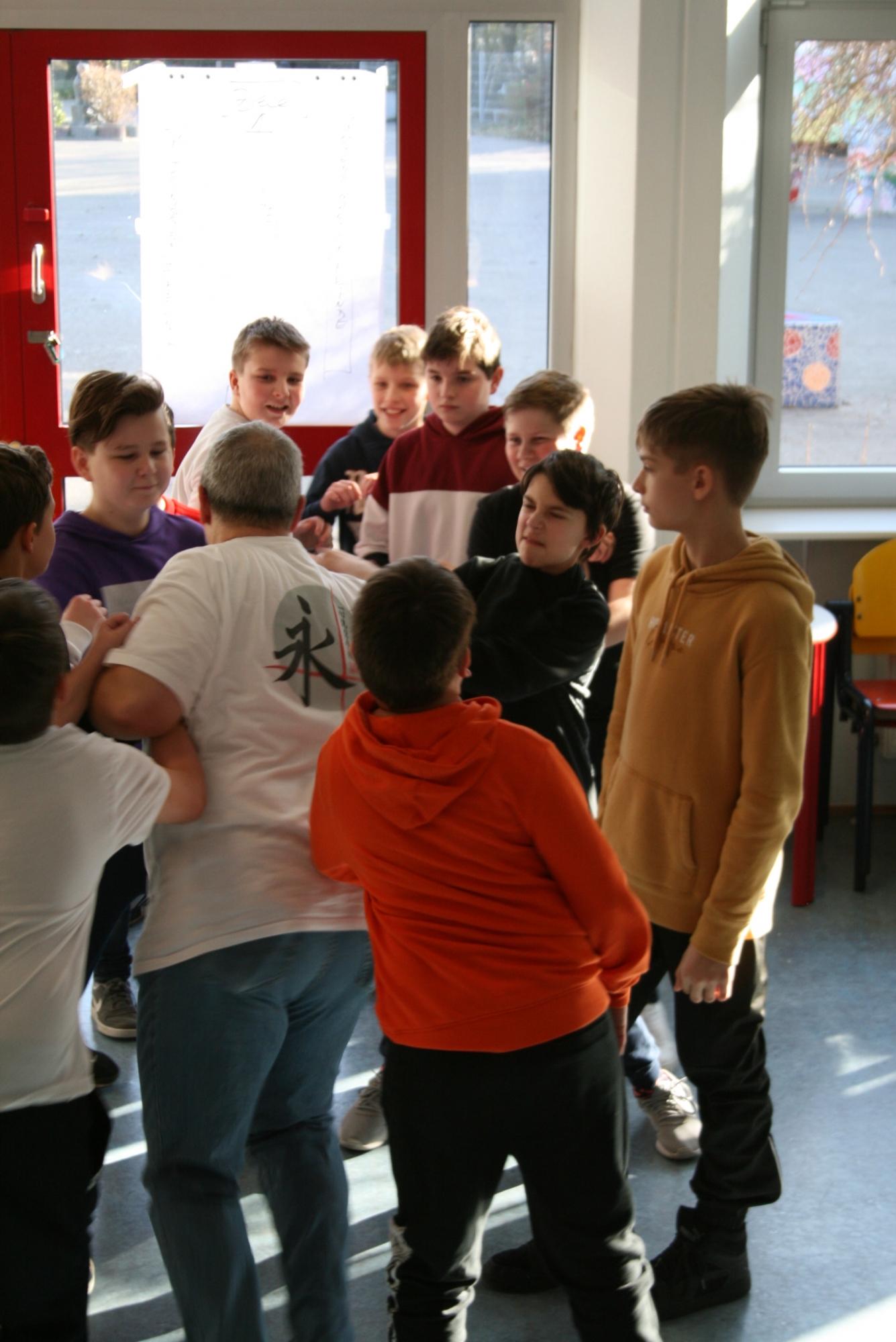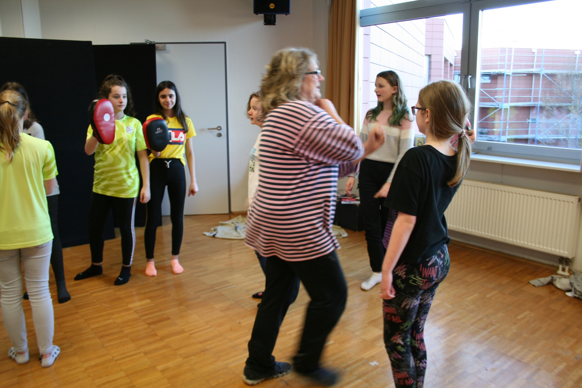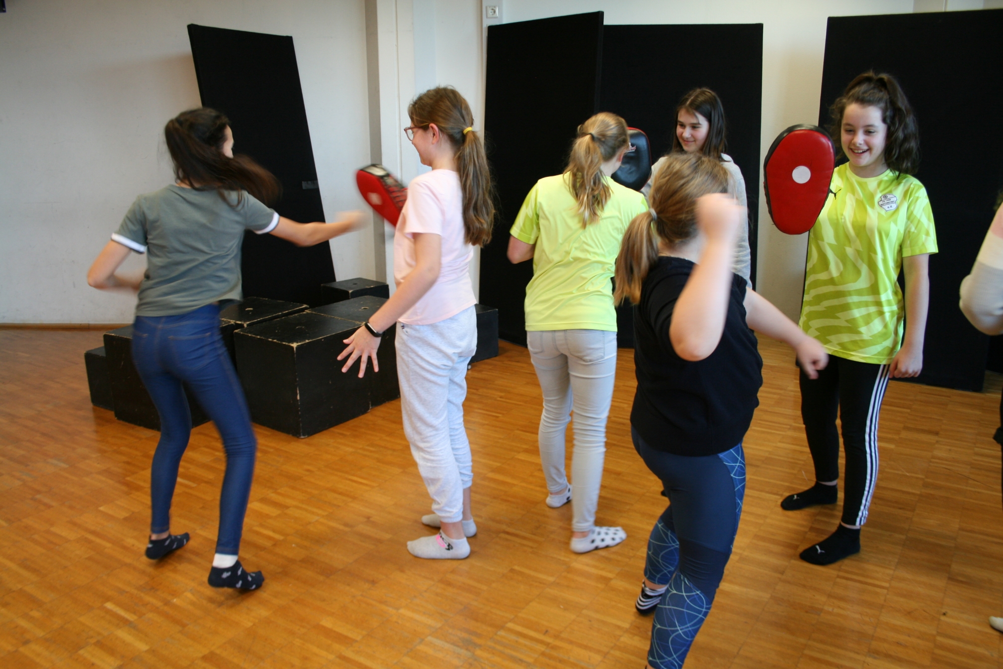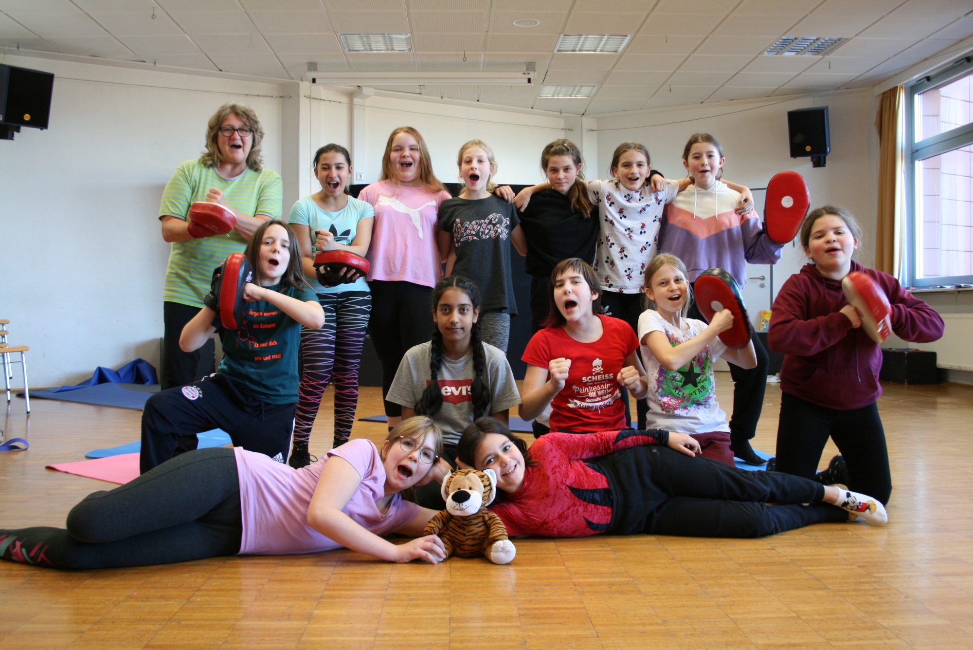 Am 04.02.2020 machten die Mädchen der 6. d mit Frau Anke Thomasky (Wen-Do* Trainerin) von 8-16 Uhr einen Selbstbehauptungskurs in der Sporthalle. Zuerst haben sich alle in einer Namensrunde vorgestellt. Im Anschluss daran haben sich alle in einem Kreis versammelt und sich 2 Bälle und ein Kuscheltier entweder normal zugeworfen, gekickt oder über einen Bodenpass zugeworfen. Als nächstes haben sie ein Spiel gespielt, bei dem sie Zusammenhalt lernen sollten. Zwischen durch gab es immer wieder kleine Pausen, in denen viel erzählt und gelacht wurde. Frau Thomasky machte mit den Schülerinnen viele Rollenspiele und erklärte genau, was sie tun können, wenn ihnen jeamand zu nahe kommt oder etwas Gemeines über sie sagt. Dazu haben sie auch noch ein anderes Spiel gespielt, bei dem es darum geht laut und deutlich: „STOP!“, zu sagen. Später übten alle wie man mit lautem Kampfschrei richtig in eine Pratze haut. Mit Kampfschrei hat man nämlich 20% mehr Kraft. Dann haben alle ein 15mm dickes Holzbrett entweder mit der Hand zerschlagen oder mit dem Fuß zertreten. Frau Thomasky zerteilte ein Brett mit dem Ellenbogen. Obwohl viele Schülerinnen Angst davor hatten, haben es alle geschafft. Dadurch sollten sie lernen sich selbst mehr zuzutrauen. In der Schlussrunde durften alle sagen, was ihnen am besten gefallen hat und wie sie sich nach dem Kurs fühlen. Alle meinten, sie seien jetzt viel mutiger und selbstbewusster als vorher.