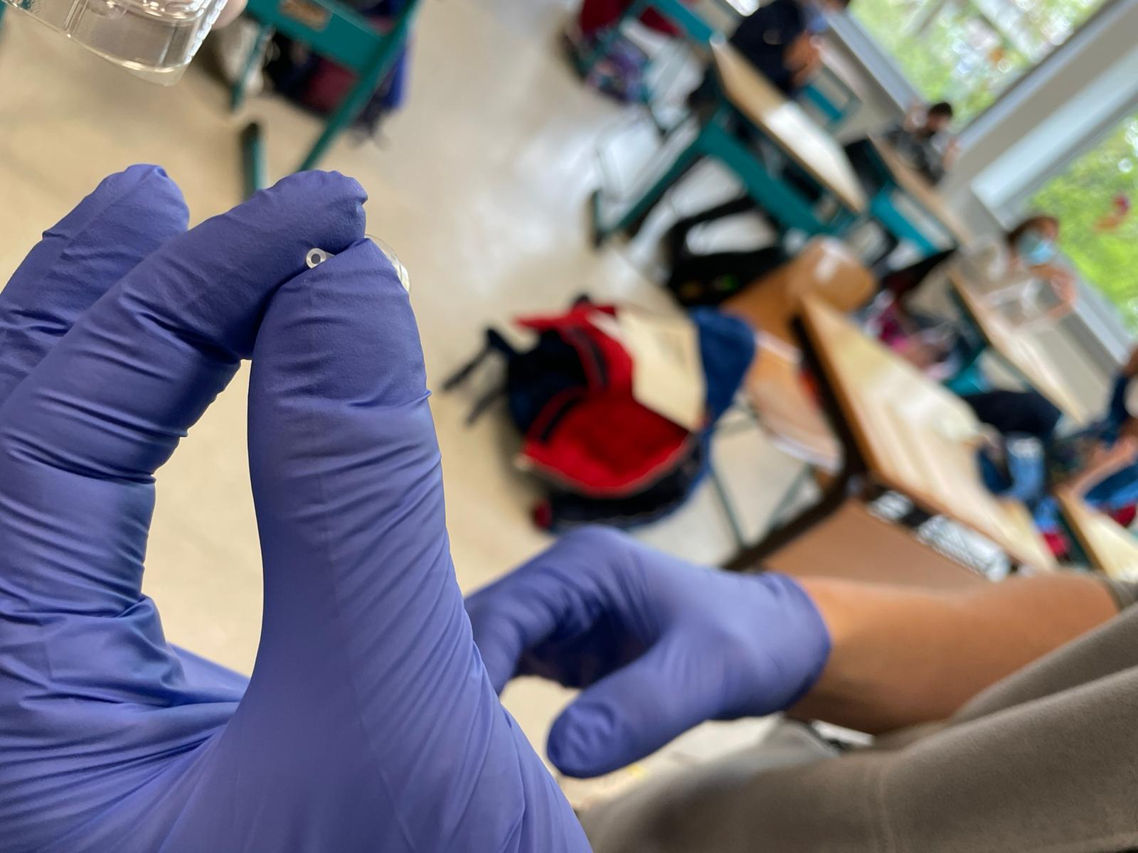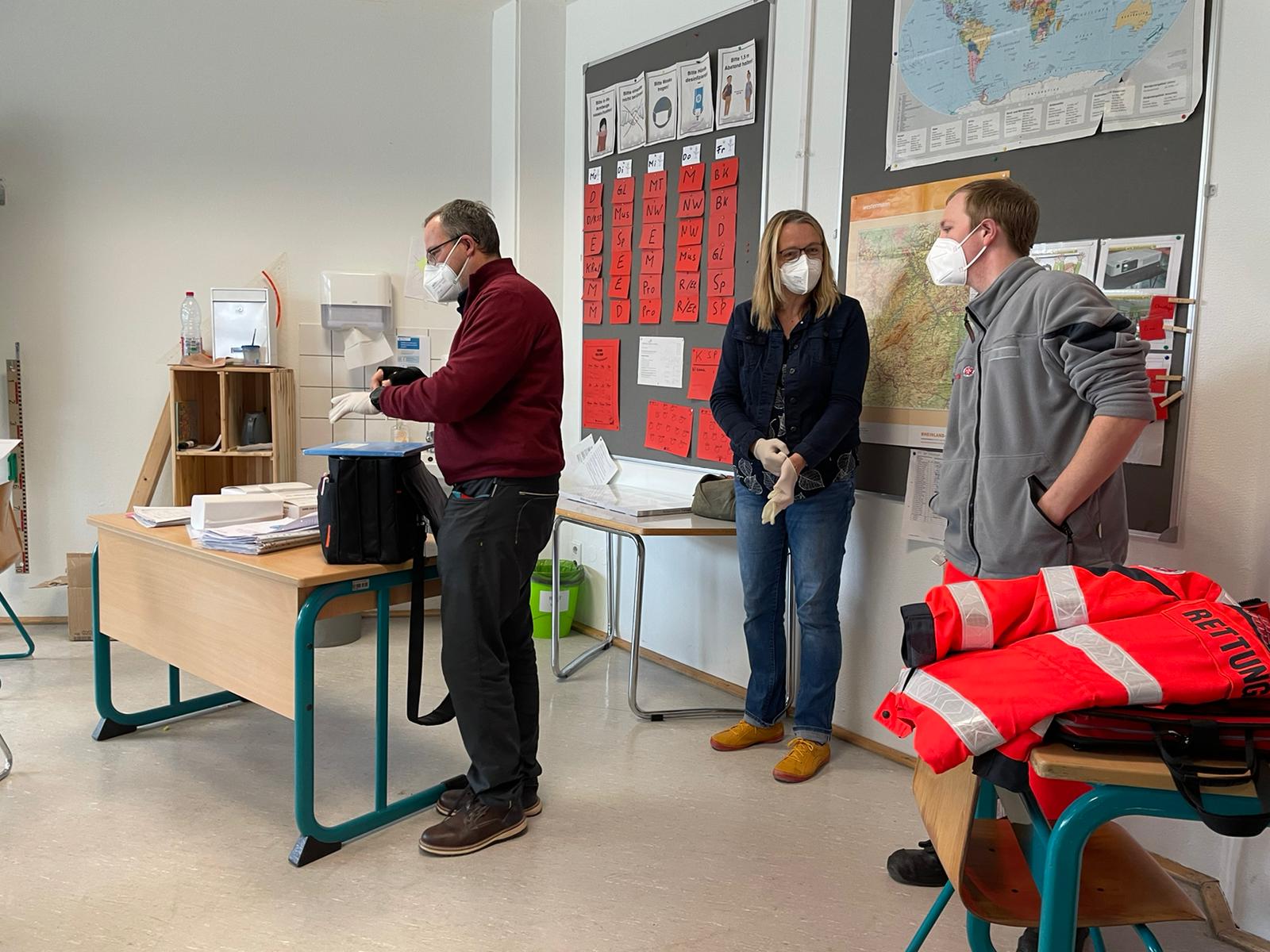Gabi Röser, Hygienebeauftragte und Leiterin unseres Schulsanitätsdienstes, mit Herrn Dieter und dem Tutor Horst Pecha bei den Vorbereitungen zur Selbsttestung der Schüler*innen der 5b.