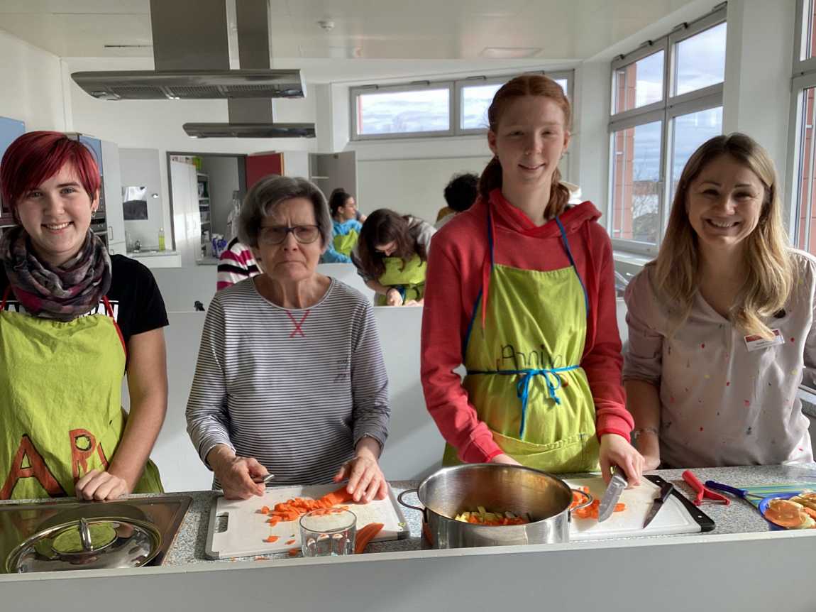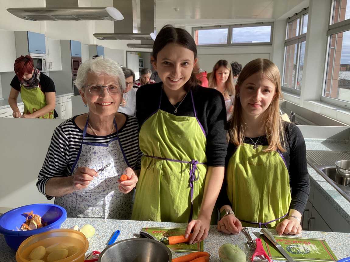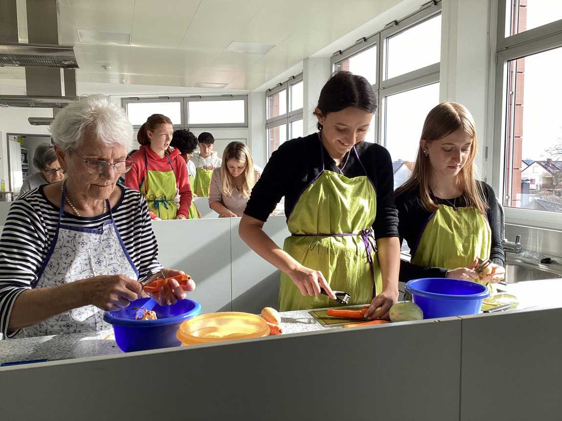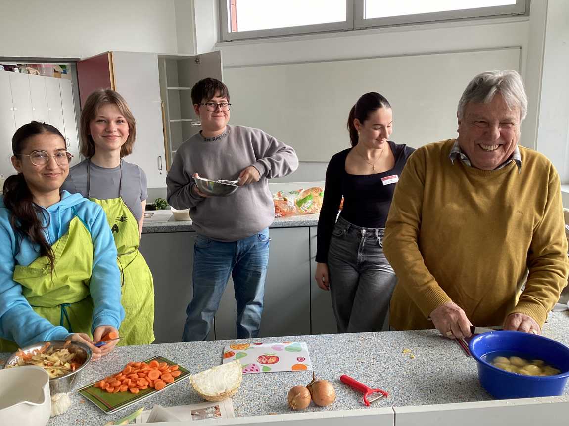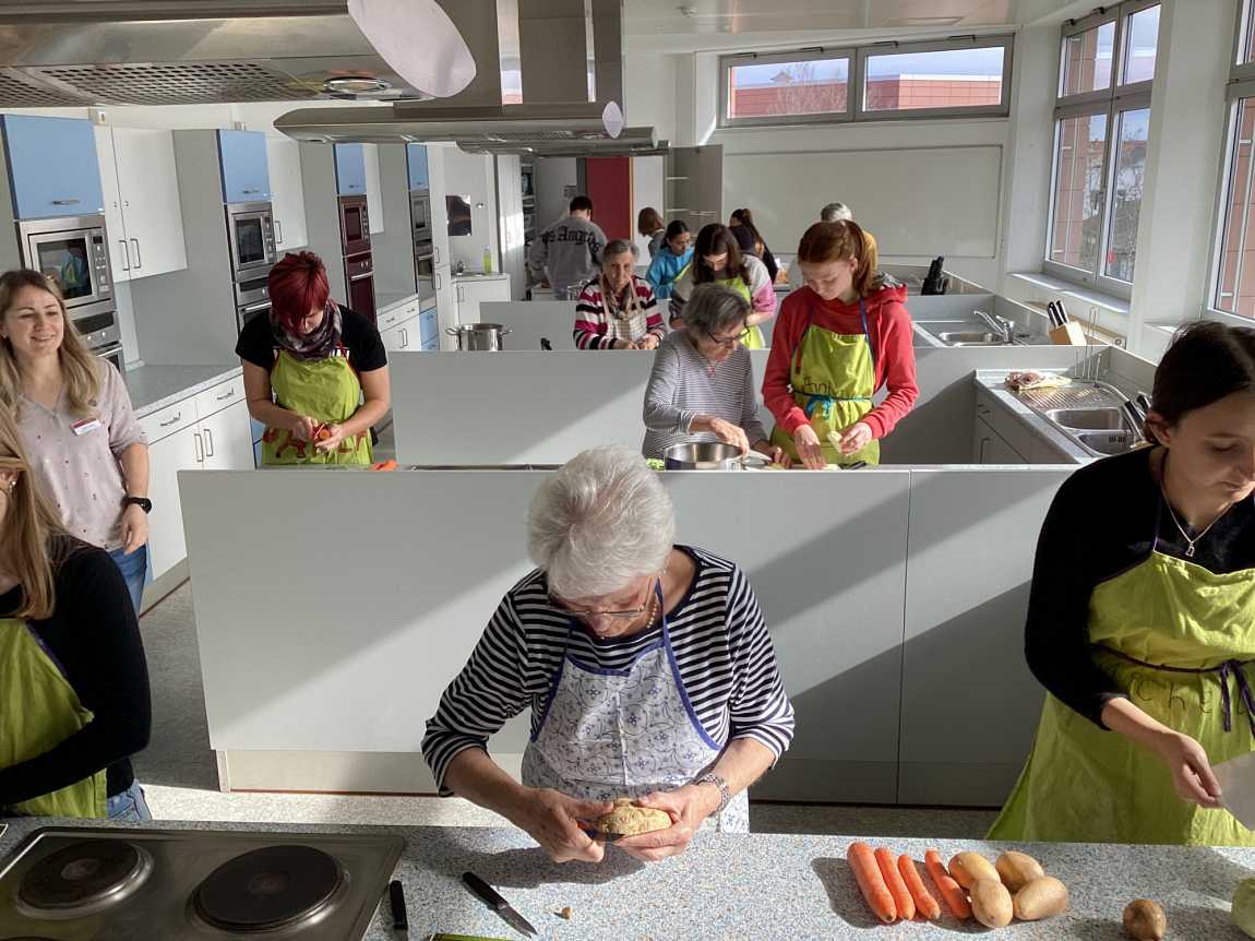 Vier Bewohner des ProSeniore Mutterstadt kamen mit zwei Begleiterinnen um unsere Schüler bei der Zubereitung von Apfelpfannkuchen und Gemüsesuppe den ein oder anderen Trick zu verraten.
