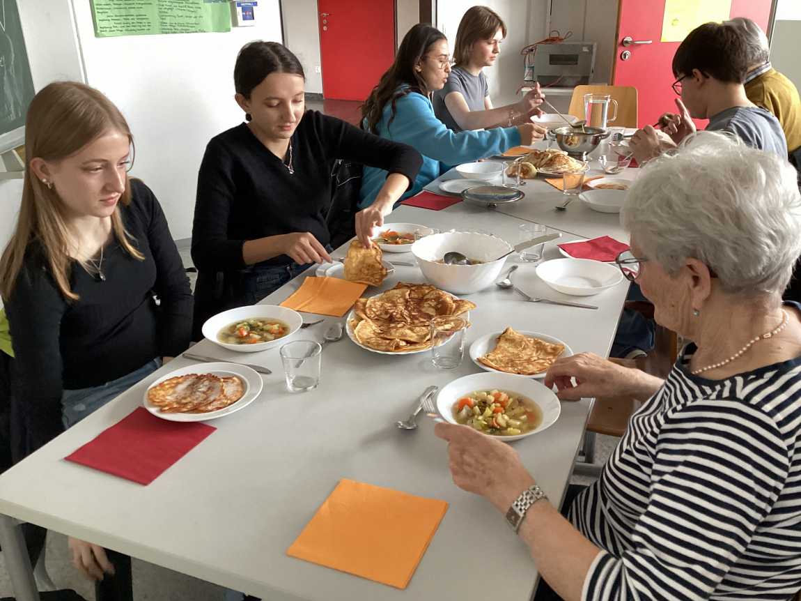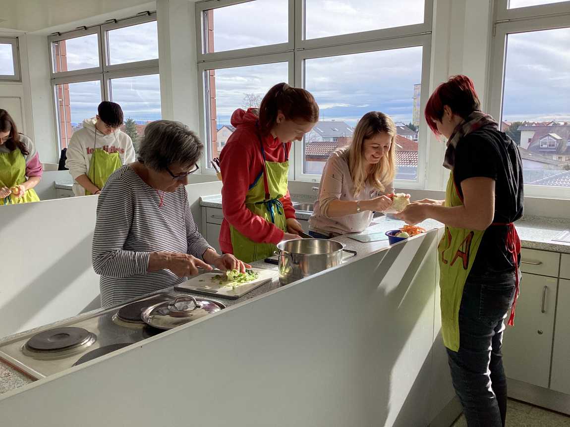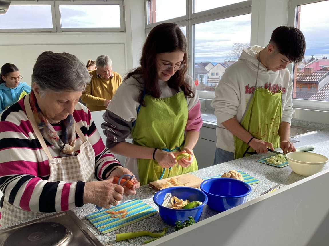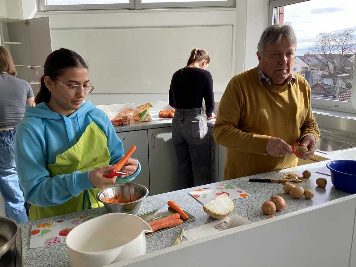 Vier Bewohner des ProSeniore Mutterstadt kamen mit zwei Begleiterinnen um unsere Schüler bei der Zubereitung von Apfelpfannkuchen und Gemüsesuppe den ein oder anderen Trick zu verraten.