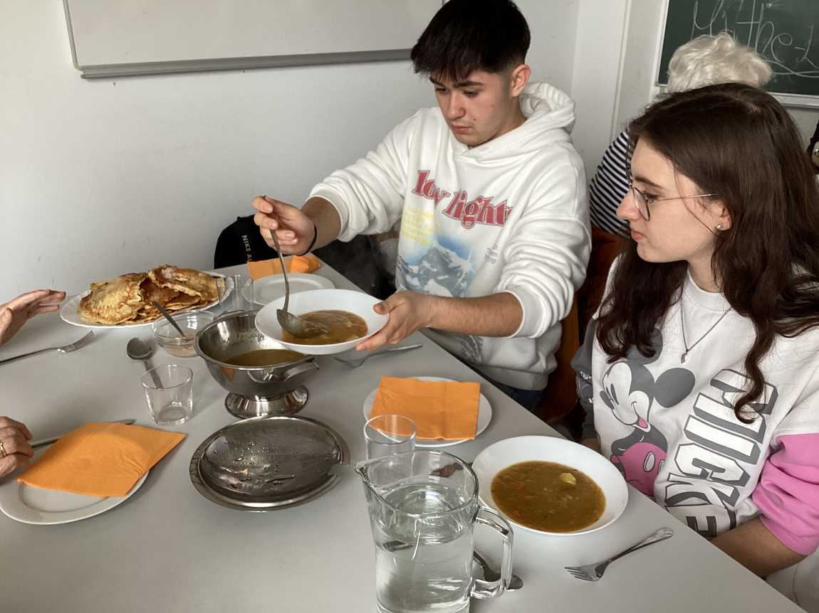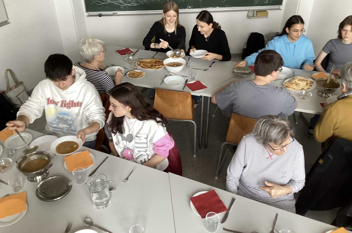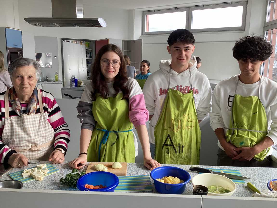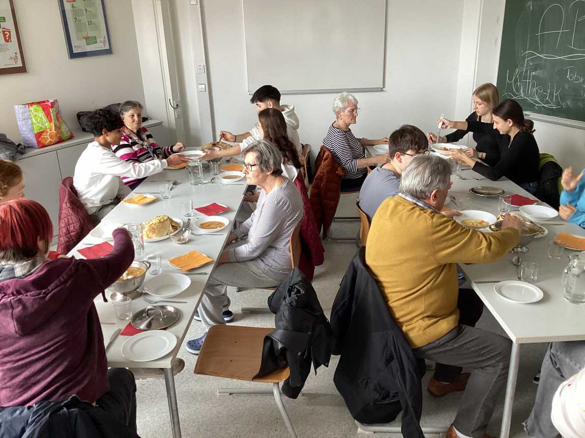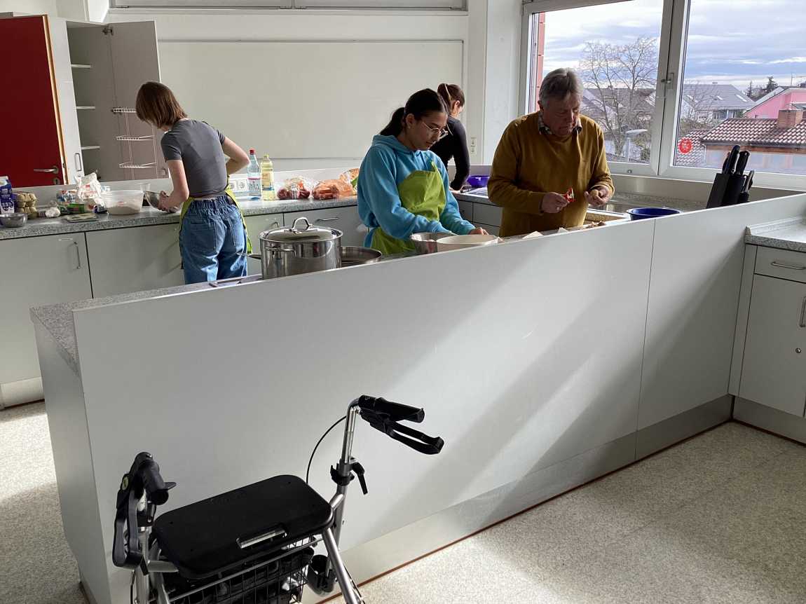 Vier Bewohner des ProSeniore Mutterstadt kamen mit zwei Begleiterinnen um unsere Schüler bei der Zubereitung von Apfelpfannkuchen und Gemüsesuppe den ein oder anderen Trick zu verraten.