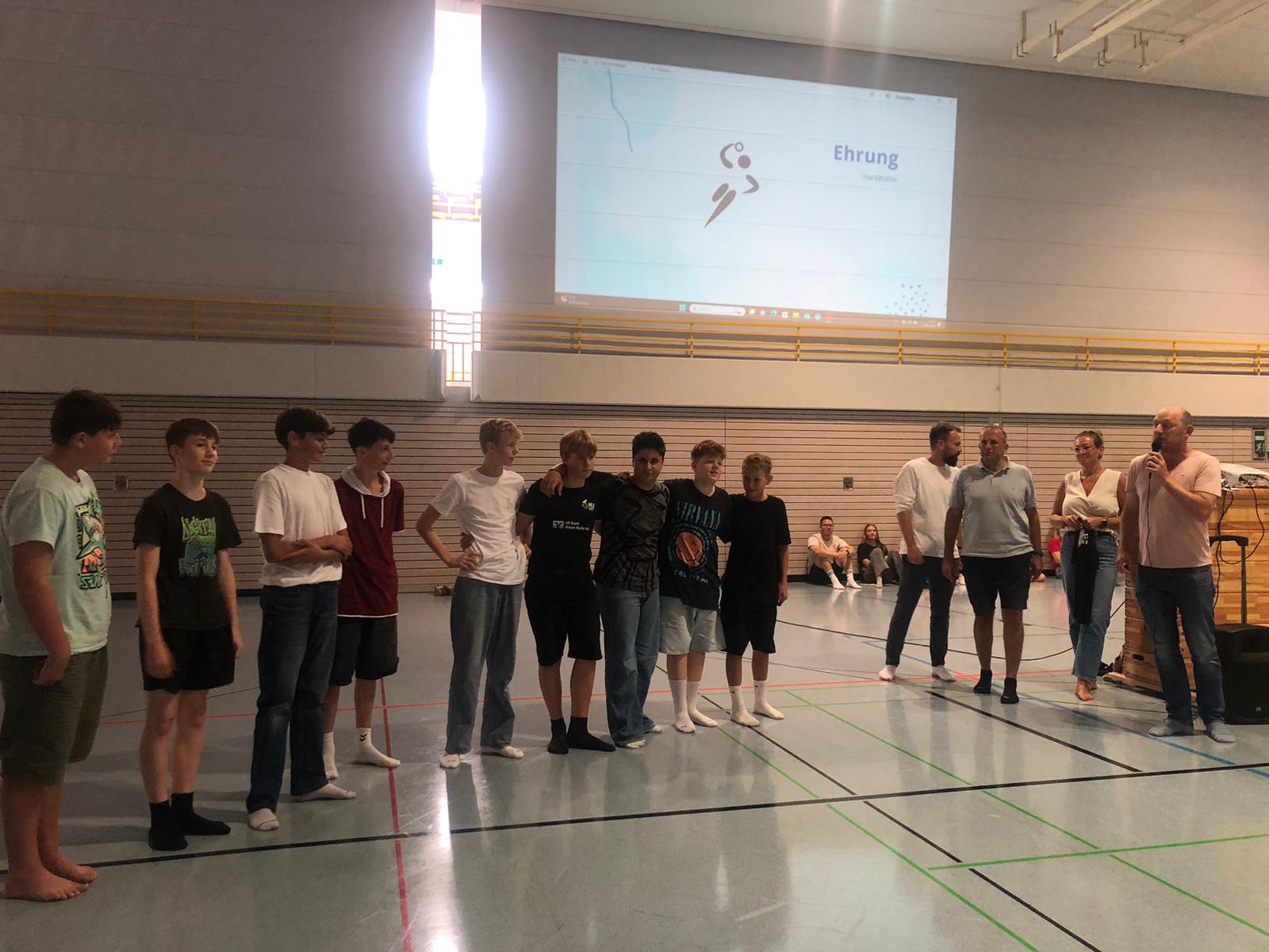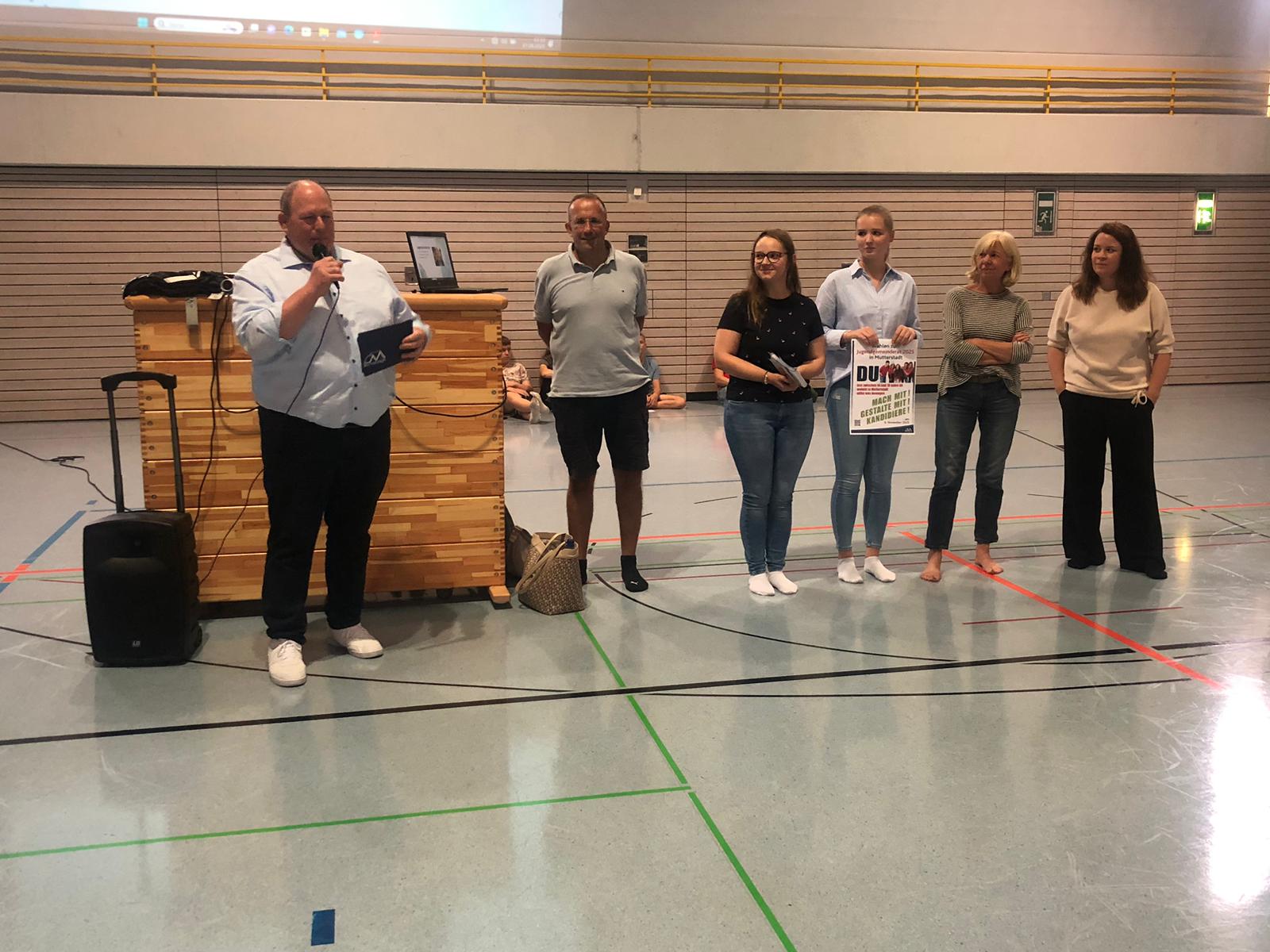 Die AGen wurden präsentiert, die SV stellte sich vor, sowie die Schulsanitäter. Eine besondere Ehrung und Überreichung von T-Shirts durch den Freundeskreis galt unserer Handball-AG, die kurz vor ihrer Reise nach Berlin stand.