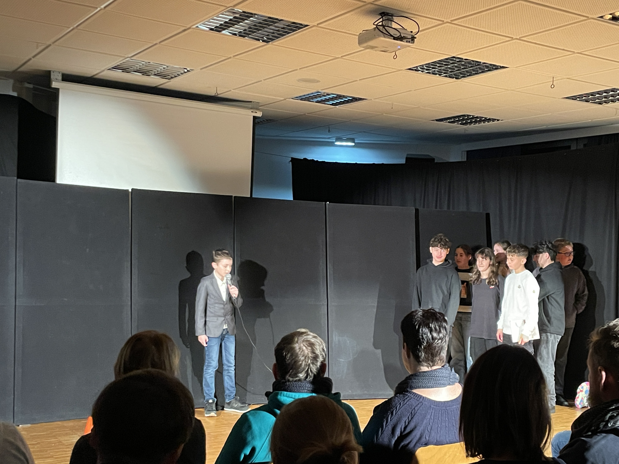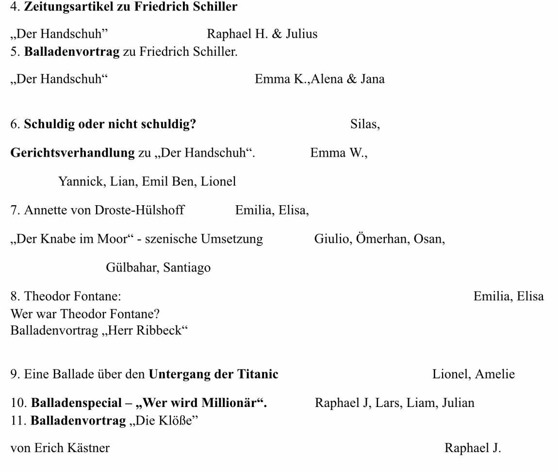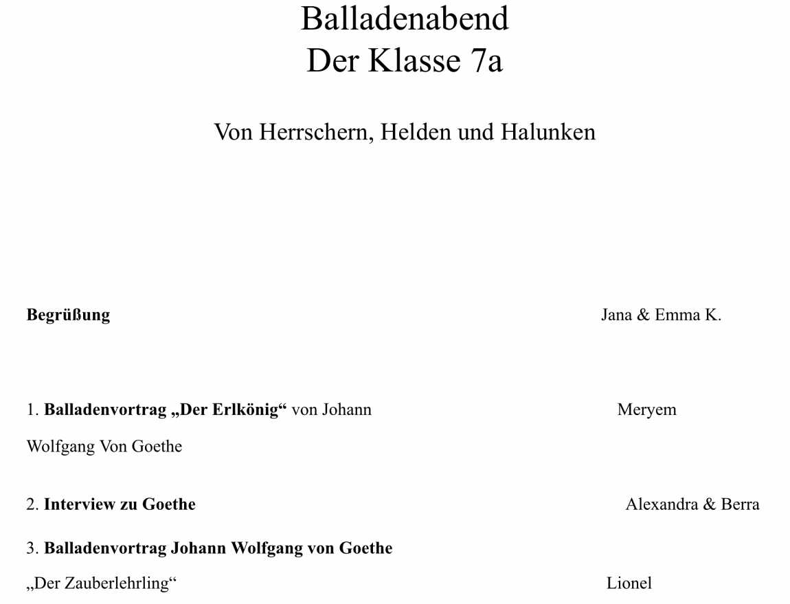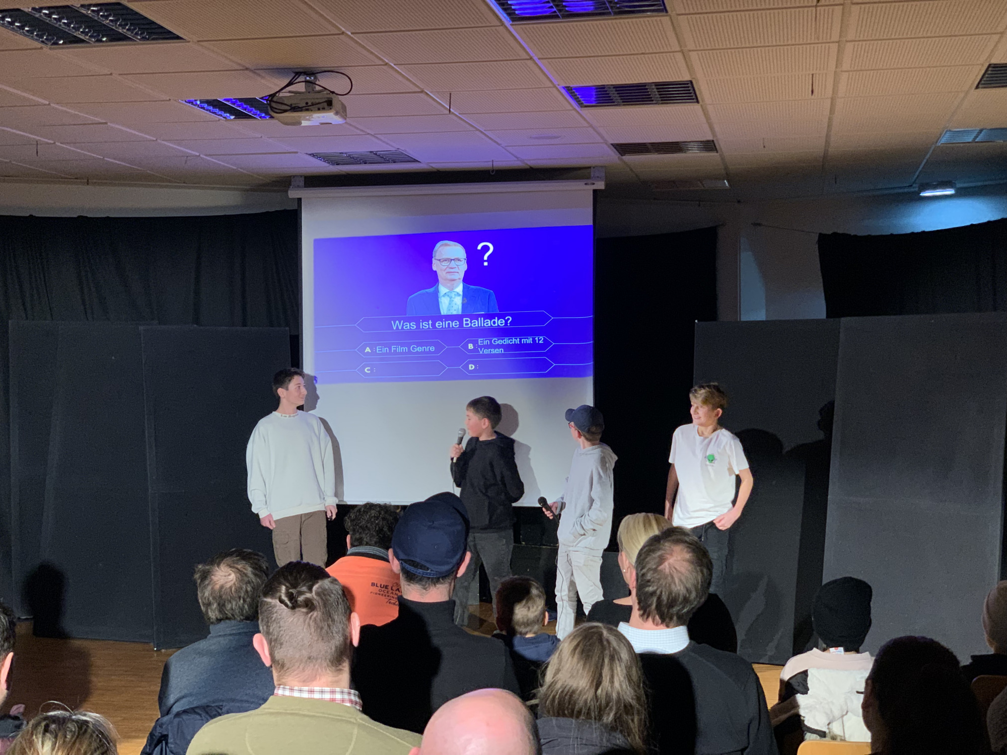 Im Rahmen des Deutschunterrichts im Jahrgang 7 haben die Schüler*innen der 7a unterschiedliche Balladen kennengelernt. Im Verlauf des Unterrichts kam die Idee zu einem Balladenabend auf. Unter dem Motto „Von Herrschern, Helden und Halunken“ präsentierten alle Schüler*innen der Klasse 7a eine Auswahl von Balladenvorträgen und szenischen Umsetzungen, so wurde z.B. die Ballade „Der Handschuh“ von Friedrich Schiller in Jugend- sprache übersetz und eine eigene Ballade zum Untergang der Titanic vorgetragen. Ein Quiz im Format der Sendung „Wer wird Millionär“ rundete den Abend ab. Trotz des eisigen Wetters sind überraschend viele Zuschauer*innen erschienen. Der DS-Saal war bis auf den letzten Platz belegt. Fazit: Ein gelungenes Klassenevent für alle Anwesenden.