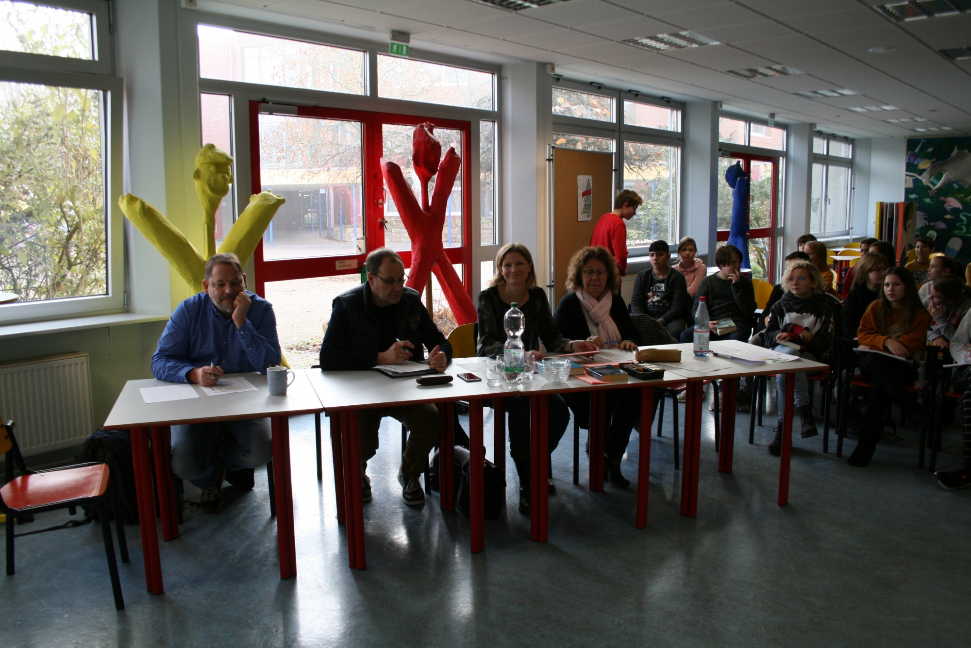 Die Jury bestand aus den Fachlehrern Deutsch Frau Decker, Frau Hardardt und Herrn Pfirrmann, sowie aus dem Vertreter der Fachschaft Deutsch Herrn Klees und der Stufenleiterin 5/6 Frau Fußer.