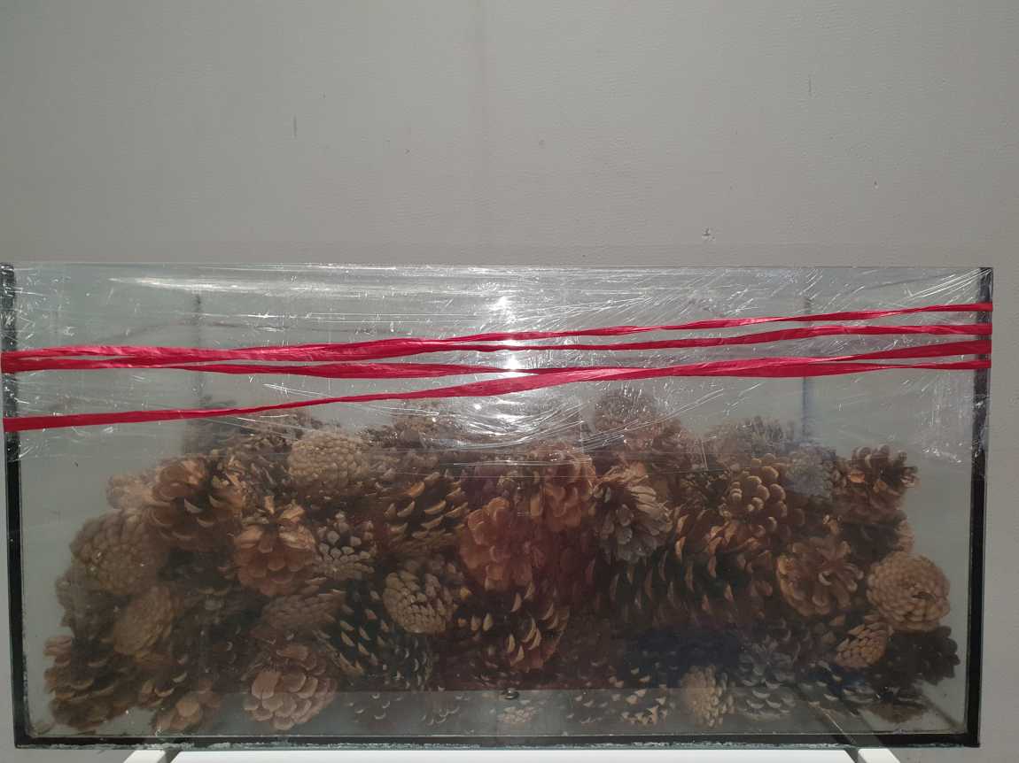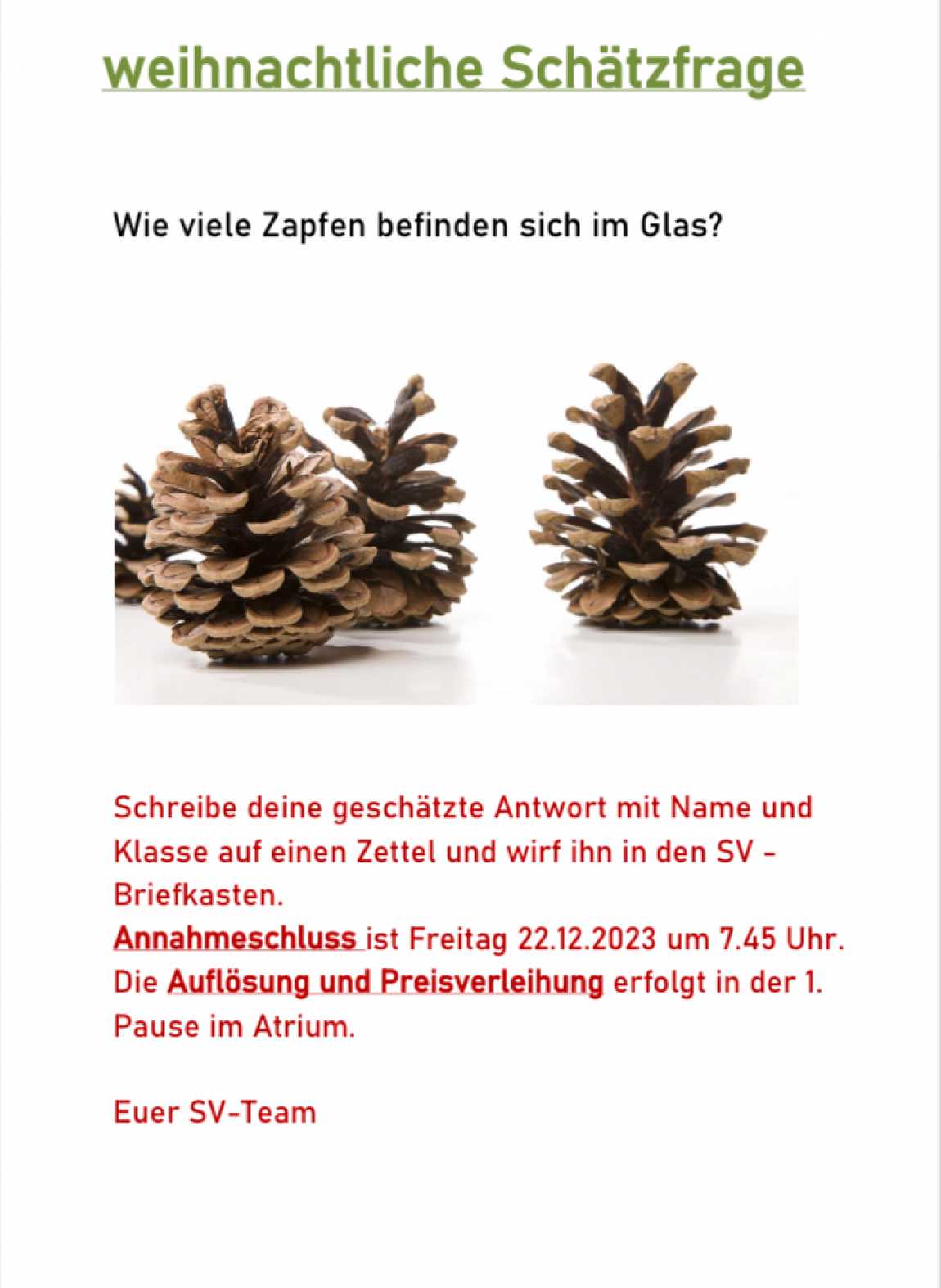 Ab Montag steht ein Aquarium, das mit Zapfen gefüllt ist, in Haus V. Die Schüler und auch die Lehrkräfte können einen Tipp abgeben, wie viele Zapfen sich darin befinden.