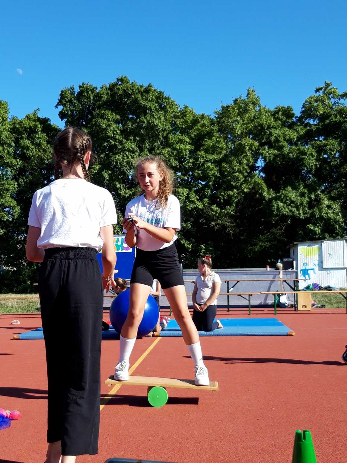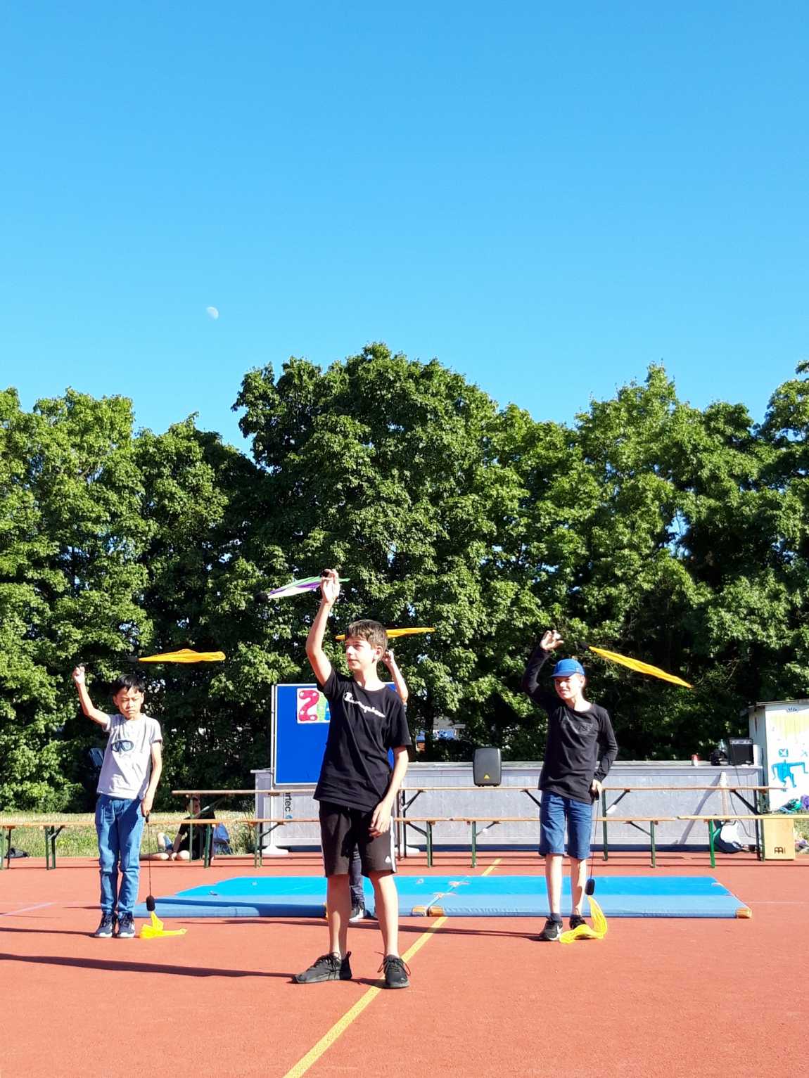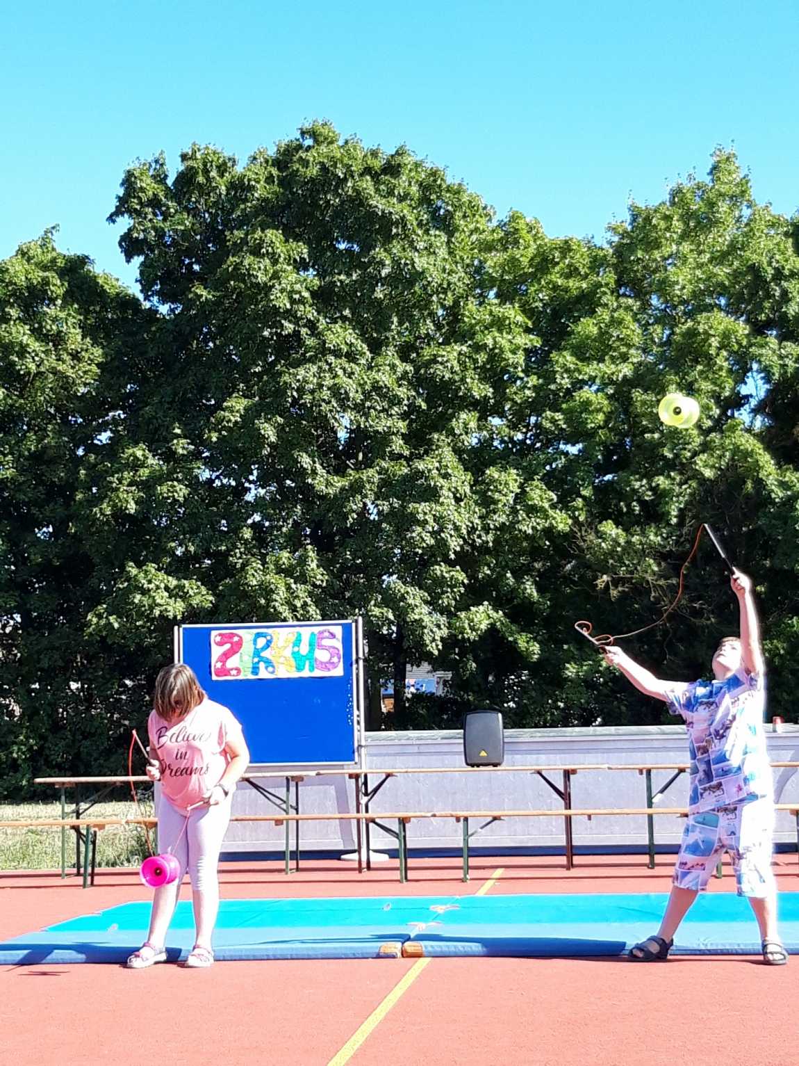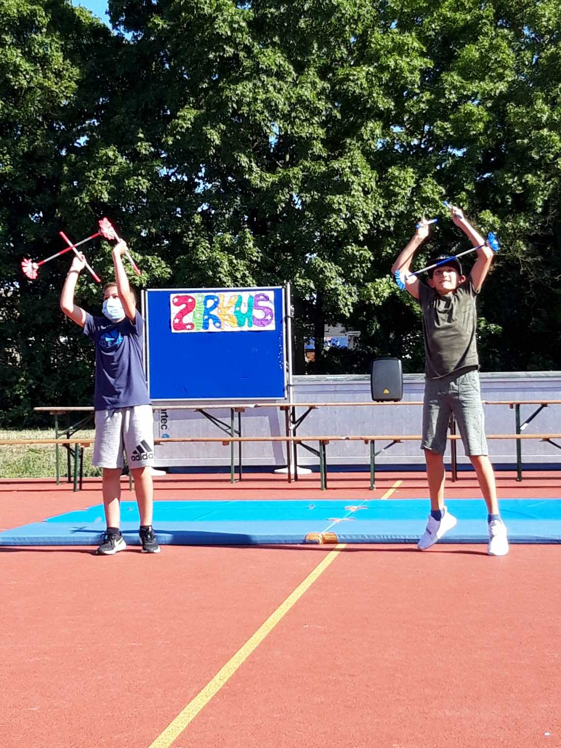 Innerhalb des Projektunterrichts konnten sich die Schüler*innen zunächst in ihren Neigungsgruppen einwählen. Da gab es Akrobaten, Balance Boards, Clowns, Jongleure, Zauberer und eine Poi-Gruppe.