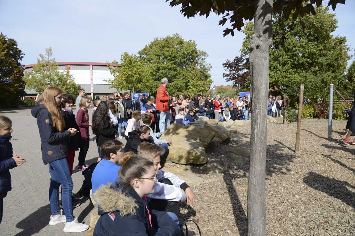 - Entsiegelung des Schulhofs im Rahmen der Umgestaltung desselben: Es wurden große Bereiche entsiegelt, mit Rindenmulch ausgelegt und darauf verschiedene Geräte wie Hängematten, Reck, Seile, Baumstämme und eine Kletterwand installiert für einen bewegten Pausenhof