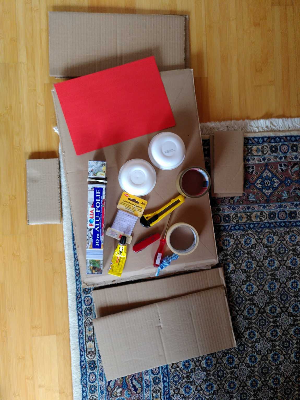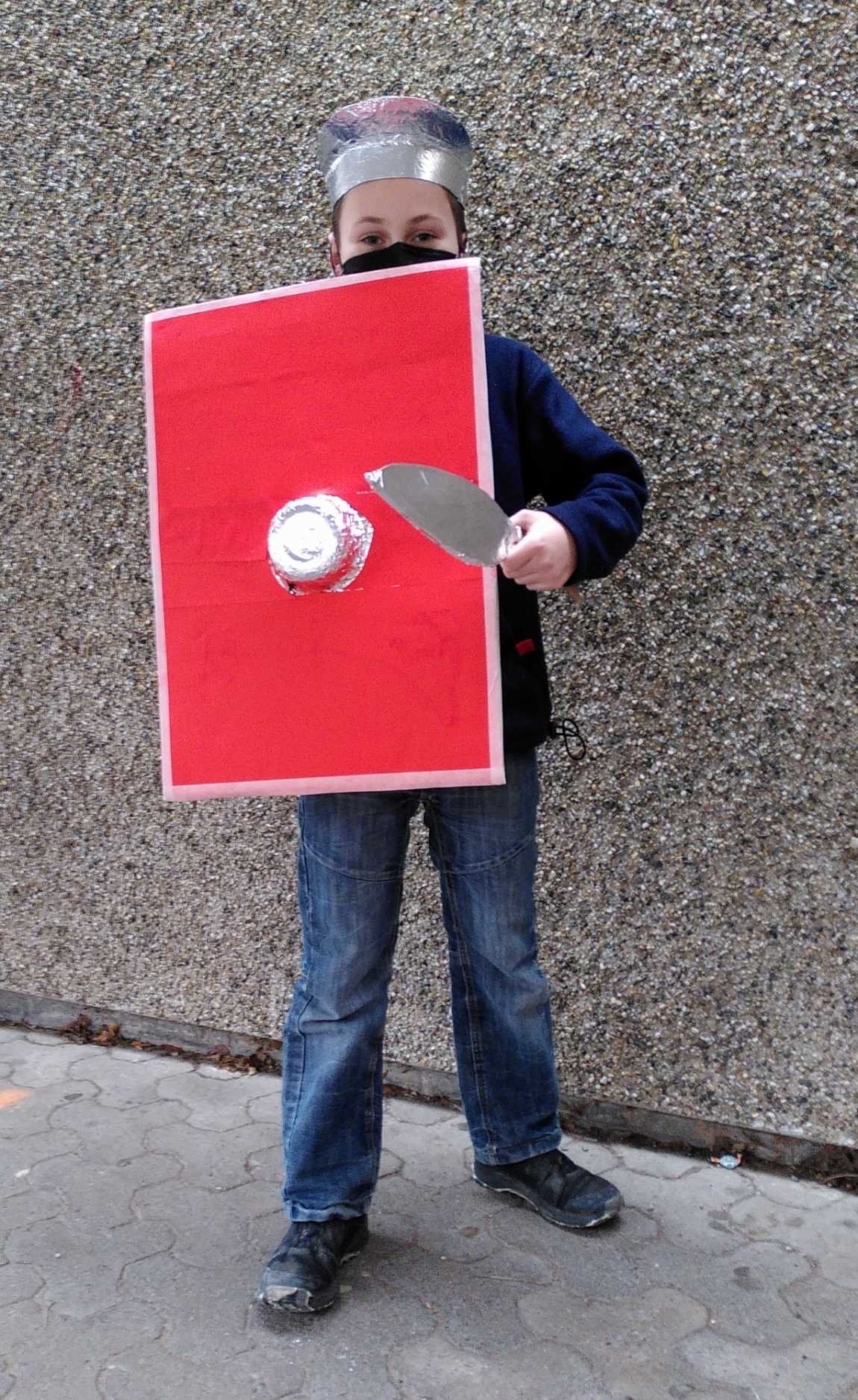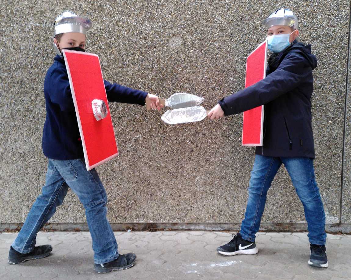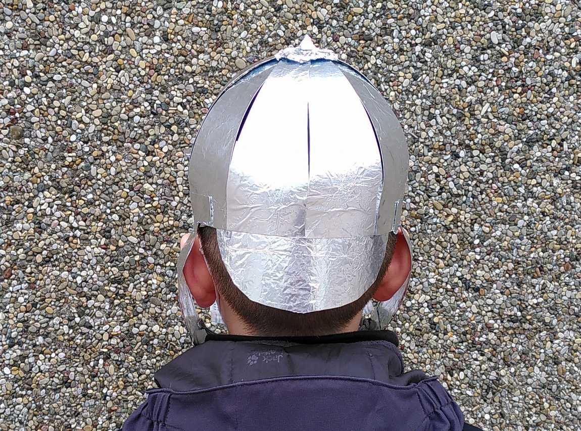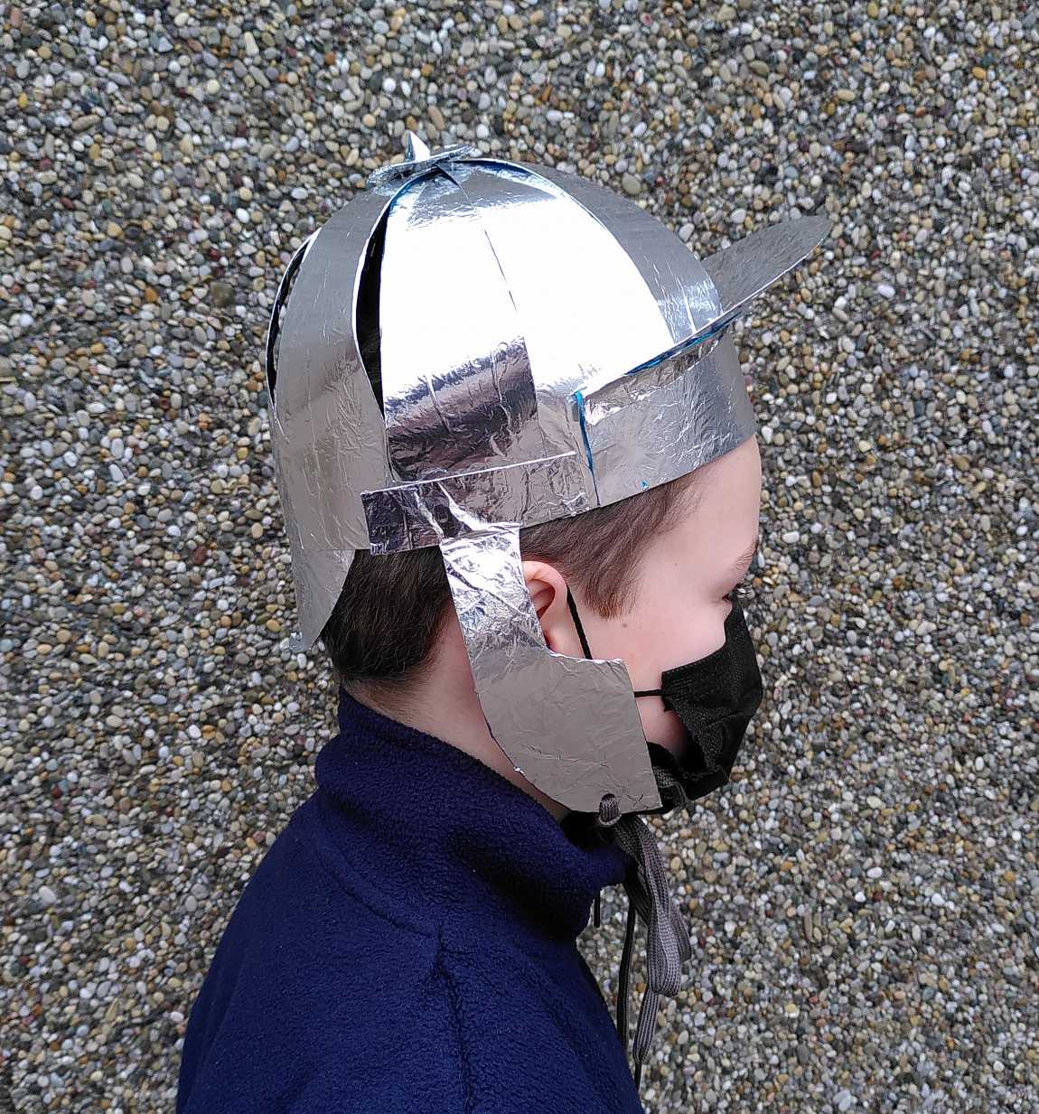 Die Helme römischer Legionäre waren so gebaut, dass sie Stirn, Nacken, Ohren und Wangen besonders schützten. Damit unsere Nachbauten schön metallisch glänzen, haben wir die einzelnen Bauteile mit Alufolie beklebt – sieht schön aus, war aber eine mühsame Arbeit! Beim nächsten Mal müssen wir jetzt nur noch die Bastelbogen auf die tatsächliche Größe unserer Köpfe anpassen.